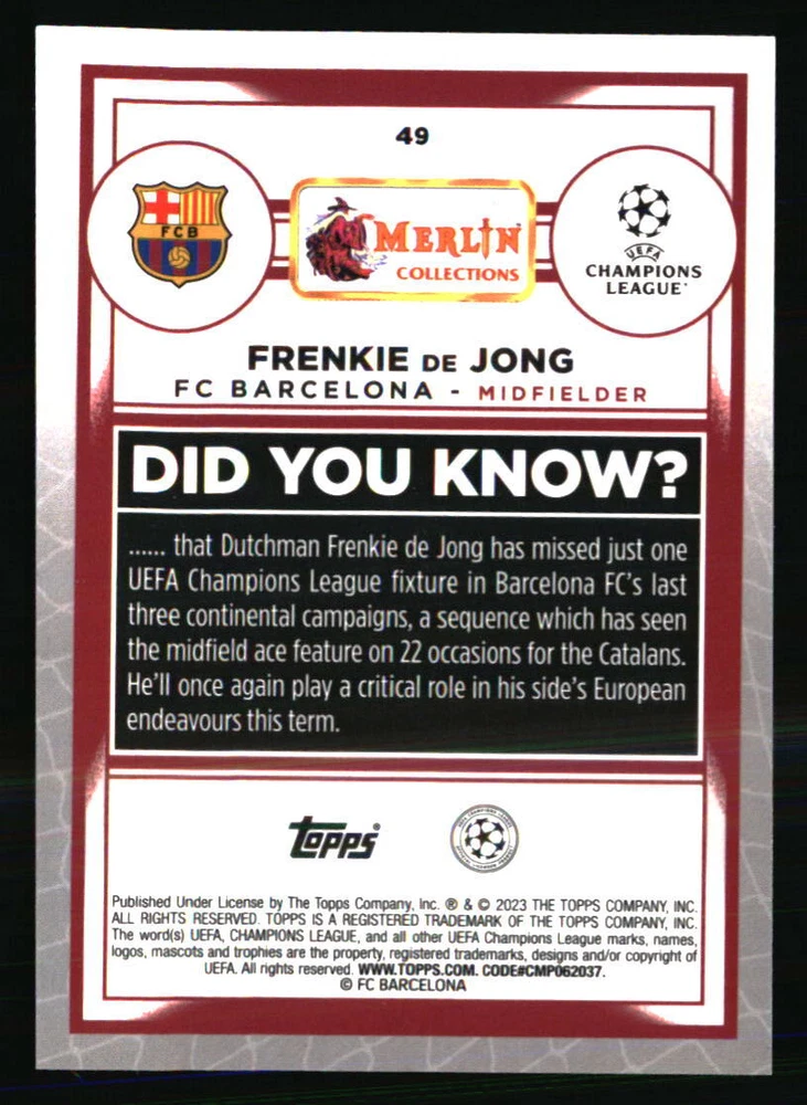 Set: 2022-23 Merlin Chrome UEFA Club Competitions Card Number: 49 Autographed: No Sport: SOCCER Type: Sports Trading Card Team: FC Barcelona Graded: No Season: 2022 Year Manufactured: 2022 Player|Athlete: Frenkie de Jong