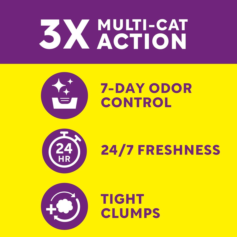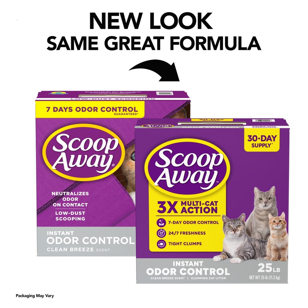 Instant Odor Control Clumping Scented Cat Litter is designed with 3X Multi Cat Action to deliver 7 day odor control, 24/7 Freshness and tight clumping action for multi cat households. This clumping clay litter leaves behind a light Clean Breeze scent and forms ultra strong clumps to make scooping the cat litter box fast and easy. This scented cat litter offers 24/7 freshness by preventing odor from urine, feces on contact for 7 days of odor control (1). Plus, the low dust formula helps keep the cat litter box area clean. (1) Original receipt/barcode cut from box required. For full terms and instructions go to the website. (2) Based on the average purchase cycle. 25 LB CLUMPING LITTER: A 30 day supply (2) of Instant Odor Control Clumping Cat Litter delivers strong odor control; Packaging may vary 3X MULTI CAT ACTION: This clay kitty litter formulated for multi cat households delivers 7 day odor control, is super absorbent and forms tight clumps 7 DAYS OF ODOR CONTROL: Blocks ammonia odors for up to 7 days, helping to keep your litter box environment smelling fresh and clean in between litter box changes 24/7 FRESHNESS: This scented kitty litter helps keep busy litter box environments fresh with a light and pleasant Clean Breeze scent LOW DUST SCOOPING: cat litter formula offers low dust scooping to help keep your home’s floors and your cat’s litter box environment clean and tidy 25 Pound Box of cat litter