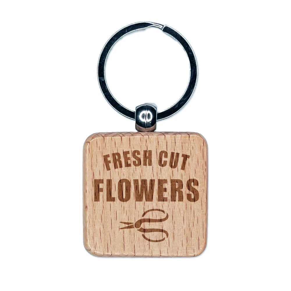 Fresh Cut Flowers Engraved Wood Square Keychain Tag Charm