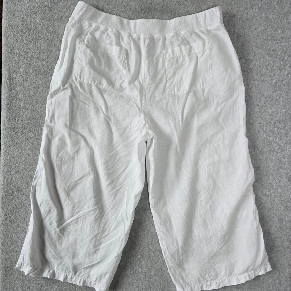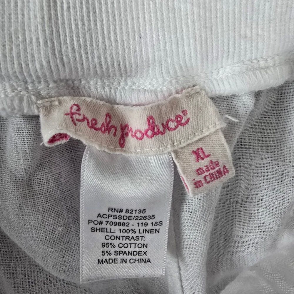 Fresh Produce Casual 100% White Linen Capri/Cropped Ankle Wide Leg Pants Pull-on elastic waist with Pockets. These pants are great for a resort, walk on the beach or boardwalk. Gently used, No visible stains or holes (See Pictures) Size: Extra Large Measurements: Waist 15 1/4" Length:32 1/2" Inseam: 20 1/2" Leg Opening: 11 1/2" Thanks for visiting!