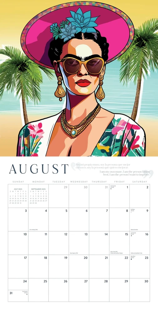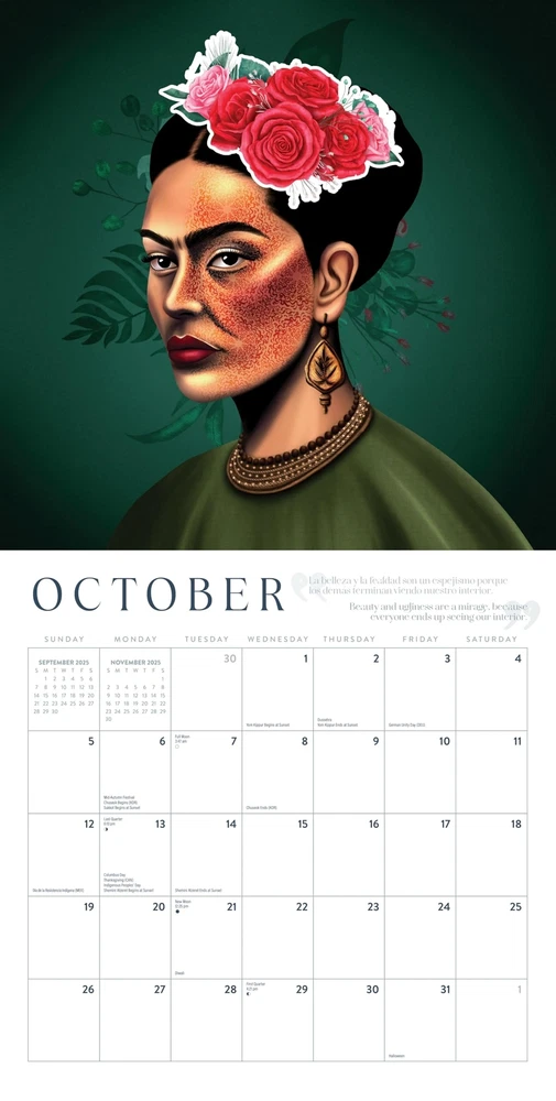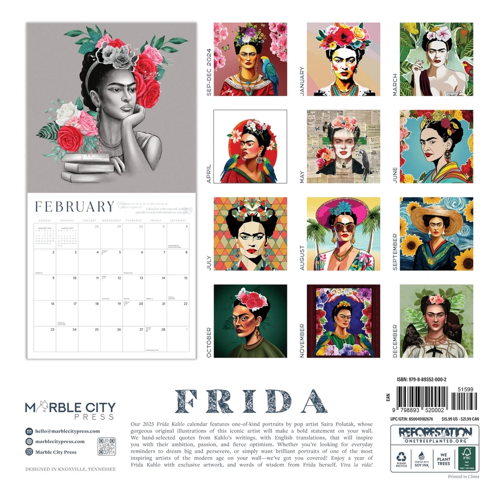 Frida Kahlo Calendar 2025 | Art Portraits Wall Calendar | 12" x 24" | Marble City Press | Hand-Drawn Mexican Folk Art Portraits with Real Quotes from Frida in Spanish and English 2025 Frida Kahlo wall calendar Printed on durable, premium art paper Full 12-month calendar January 2025 - December 2025 12” x 12” wall calendar (12” x 24” open) Includes US and Canadian holidays, moon phases, and important observances of major world religions 2025 Frida Kahlo wall calendar Printed on durable, premium art paper Full 12-month calendar January 2025 - December 2025 12” x 12” wall calendar (12” x 24” open) Includes US and Canadian holidays, moon phases, and important observances of major world religions Shipping from the USA All of our products are shipped from the USA, ensuring quick delivery to your destination. Payment We offer the following payment methods: PayPal, credit card, bank transfer, and eBay's secure payment system. Free Shipping & Free Returns Shipping within the USA is FREE. Additionally, any return is absolutely free for you. Risk-Free Purchase You have the option to return an item within 30 days without any justification. We cover the return shipping costs! Fast Shipping We ship immediately upon receipt of payment. Generally, the package is delivered within 2-3 days in the USA. If it takes longer, we will contact you. Quality and Costs Made in Europe, USA, China No customs fees or additional charges Total satisfaction guarantee Invoice with declared VAT available upon request in .pdf format Feedback Your feedback is very important to us. After you pay for your purchase, you will automatically receive positive feedback from us.