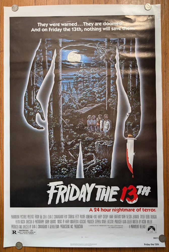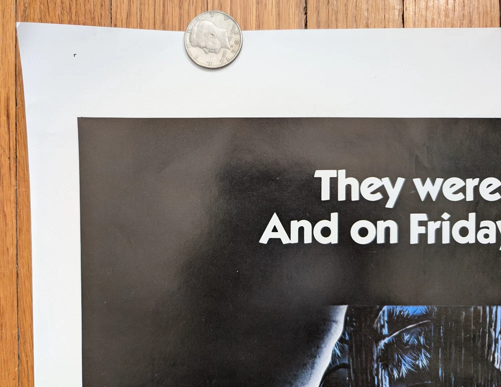 An original unused, rolled 1-sheet from the original horror classic Friday the 13th. Great condition. Has some light waviness from being stored rolled. No tears or marks. Please review the photos for condition. Shipped rolled in a sturdy tube. I worked in movie theaters from 1972 to 1983 and this is one of the many items of movie memorabilia that I saved. This has been in my possession since 1980. MohawkValley20 has many other movie items listed as well as vintage paper, ephemera, and other collectibles. Please check out our other listings.