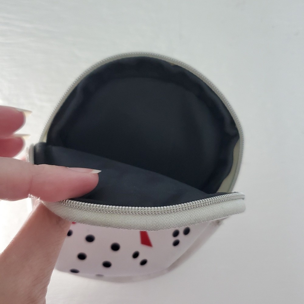 Novelty coin purse shaped like Jason Voorhees' iconic hockey mask from the Friday the 13th horror movie franchise. This unique and eye-catching coin purse features the distinctive mask design with black eye holes, red chevron details, and black dot accents, complete with a secure zip closure to keep your valuables safe. Perfect for horror fans, movie buffs, or anyone who loves quirky accessories, this coin purse is ideal for carrying your loose change, small trinkets, or even as a fun Halloween accessory. Use it as a conversation starter at movie nights, horror conventions, or just as a unique everyday accessory to show off your love for classic horror. Keywords: Jason Voorhees, Friday the 13th, Horror movie, Coin purse, Mask, Halloween, Accessory, Novelty, Collectible, Movie memorabilia, Zip up bag, Small bag, Horror fan, Pop culture, Gift