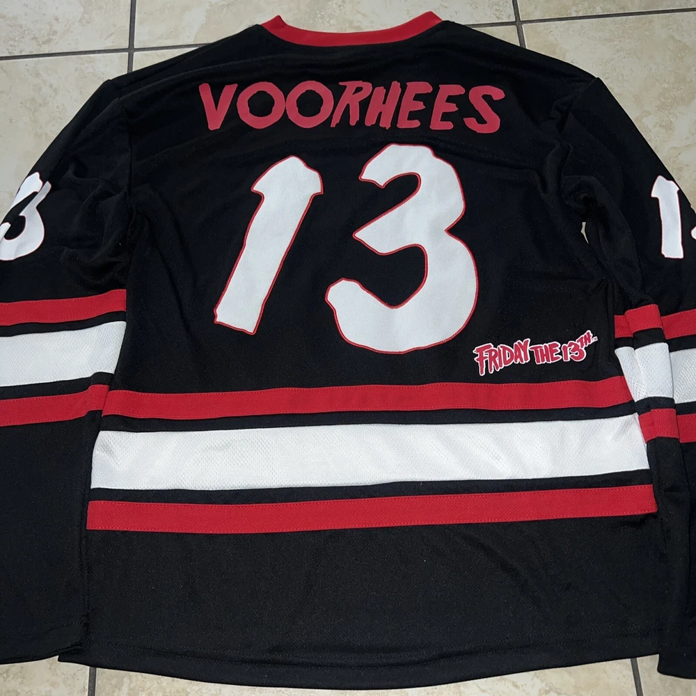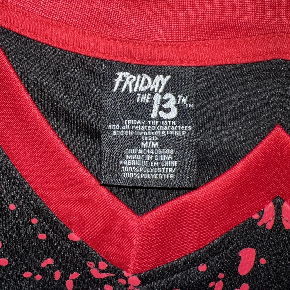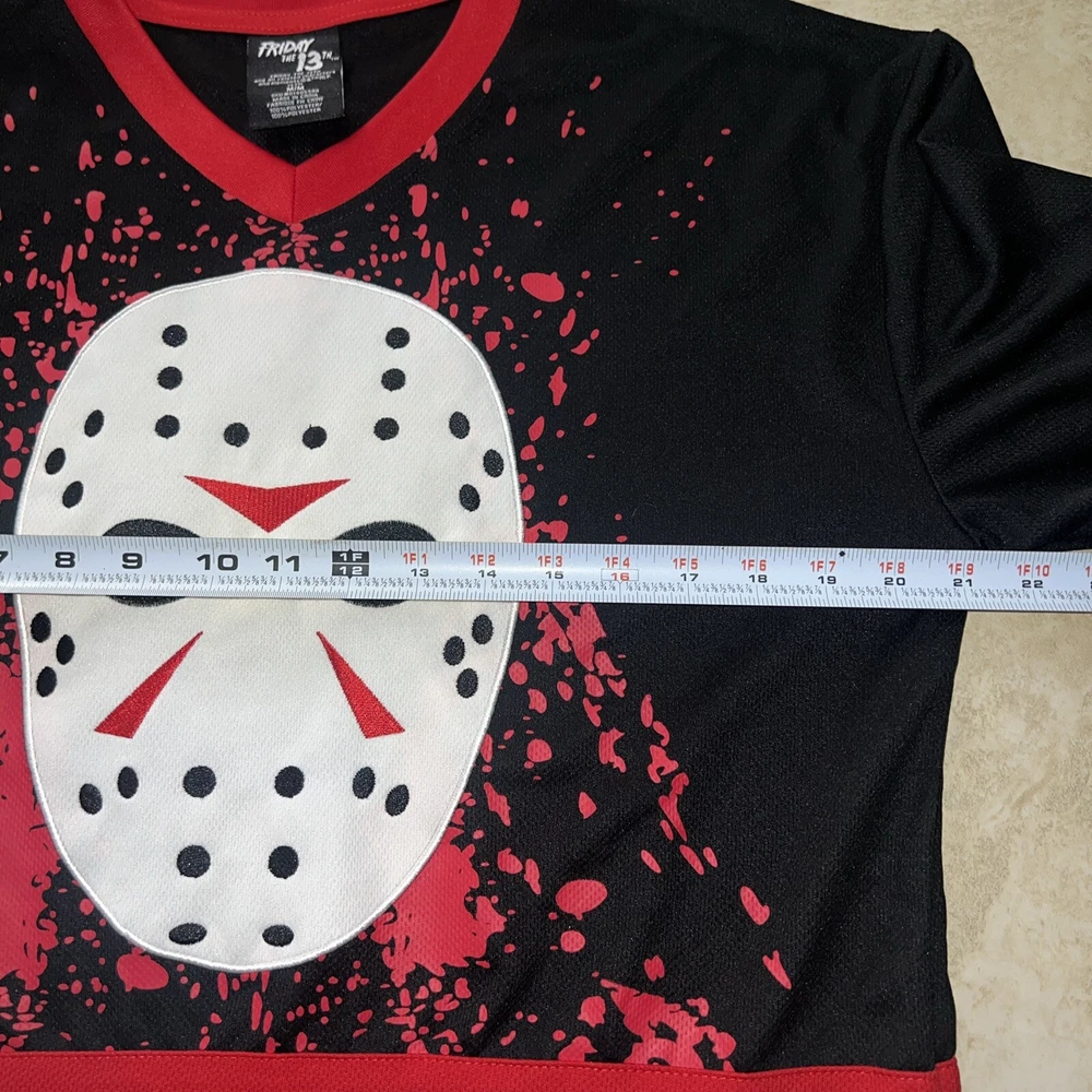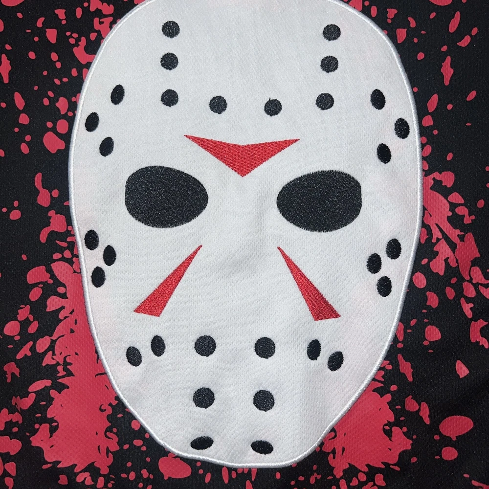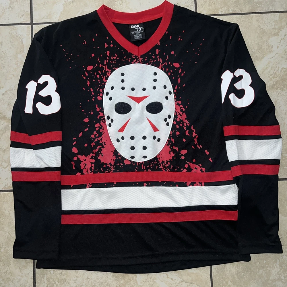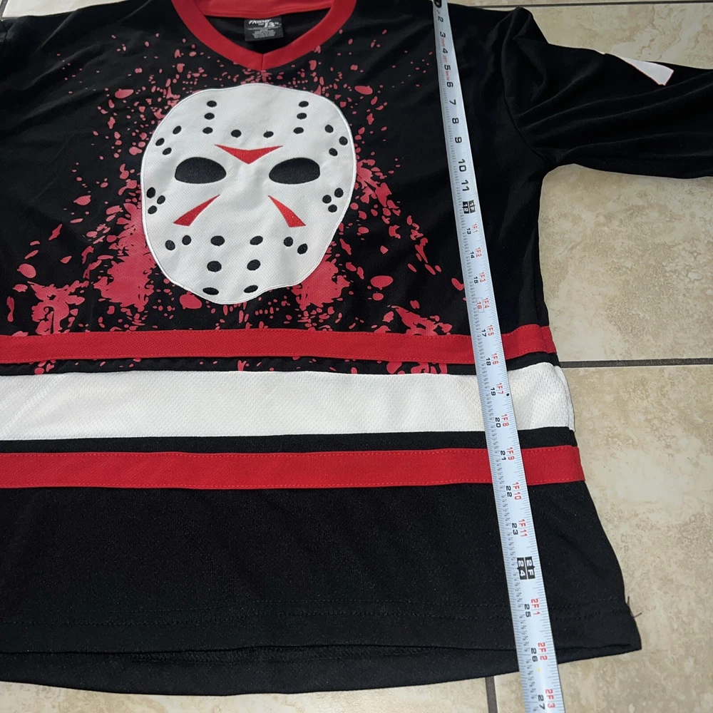 Get ready to hit the ice in style with this Friday the 13th Jason Voorhees Bloody Hockey Jersey. Made with high-quality jersey fabric, this USA Mens Size Medium T-Shirt features a bold multicolor design that showcases the iconic character family theme. The jersey is perfect for any hockey enthusiast who wants to make a statement on the ice. This regular-sized T-shirt is a must-have for any fan of the horror movie franchise. The jersey features the Jason brand and is ideal for men who want to show off their love for the series. Whether you're playing for fun or competing professionally, this jersey will make you stand out.