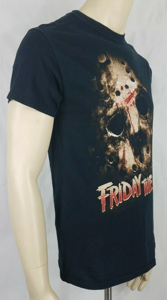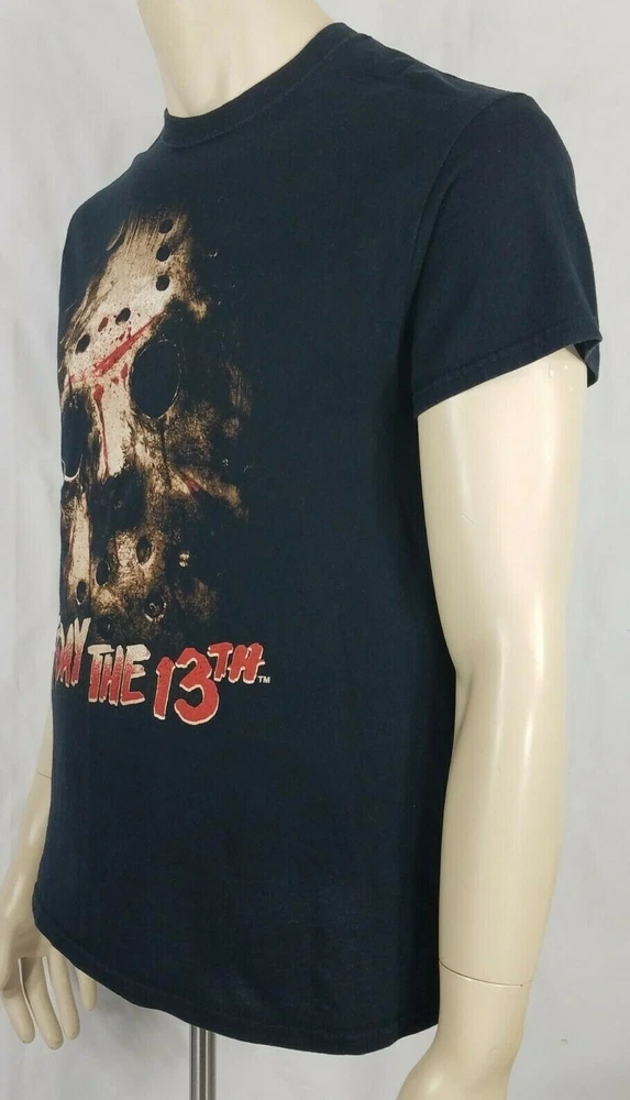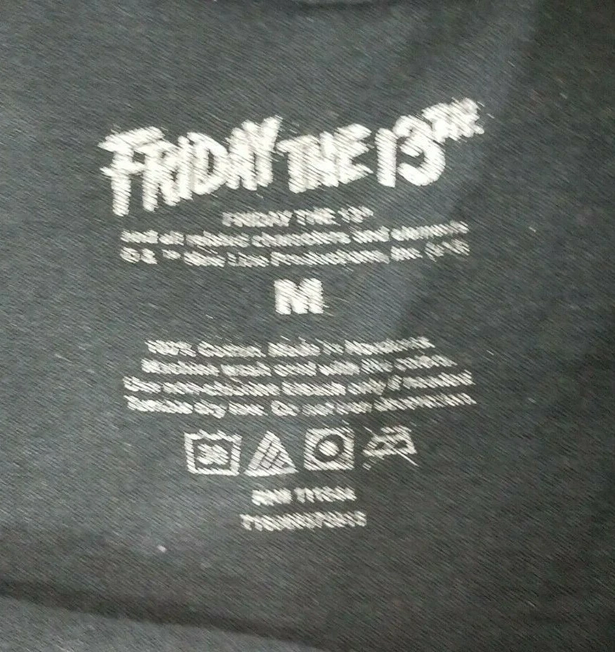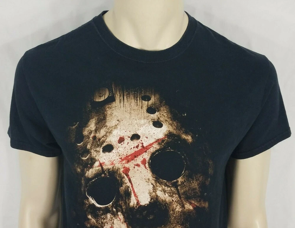 adult's Jason / Friday the 13th short sleeve t-shirt Friday the 13th brand black with large image of Jason's mask on front size Medium (Please refer to measurements below) 100% cotton Great pre-owned condition! no flaws to speak of. Measurements lying flat: Bust (pit to pit): 19.5 inches. Length (from nape of neck to bottom hem): 27 inches Policies and Disclosures: RETURNS: Returns are accepted within 30 days of purchase. Buyer is responsible for return shipping. All items from this store come with an identification tag; Item(s) must be returned in original condition with the I.D. tag intact for a refund. SHIPPING: I do combine shipping when multiple items are purchased. In order to provide you with the least expensive price, you will need to send me a message requesting an invoice with combined shipping. CLOTHING: My goal is to sell only the finest quality new and gently used clothing items in my stores, and I strive for 100% satisfaction with every order. While my home is smoke-free, other pre-owned items from different sources cannot be guaranteed as smoke-free or pet-free. It is assumed that you as the buyer will be cleaning the garment once it arrives to you, so unless there is an obvious stain or odor, the clothing has not been laundered. I felt it was best left up to the buyer so no issues would surface regarding detergent allergies, shrinking, etc. Please note that any must or smoke odors can almost always be completely removed by adding 1 cup of distilled white vinegar to your normal wash cycle. I provide measurements on all my clothing items so that you, as the buyer, can make an informed decision about your purchase. Please use that information to compare it with a garment that fits you well to determine if the item will work for you. Seller will not assume responsibility for return postage on items that do not fit. COMMENTS: Please note that every item I sell is described to the best of my knowledge and ability, however, I am a human being, so occasionally I do make mistakes. Colors may vary slightly between screens and monitors. Sizing can vary from brand to brand. If you have any questions about the item(s), free to ask and I will do my best to get back with you in a timely manner. If you have any issues with your purchase, please do not hesitate to contact me prior to leaving negative feedback so we can try to resolve the issue. I am flexible and easy to work with. If you see something you are interested in, feel free to make a reasonable offer! (On a side note: Lowball offers are insulting and will be declined.) Take a moment to browse my other items for sale. I offer a large variety of items, with new items daily, so there’s something for everyone! Thanks so much for taking the time to look and have a wonderful day!