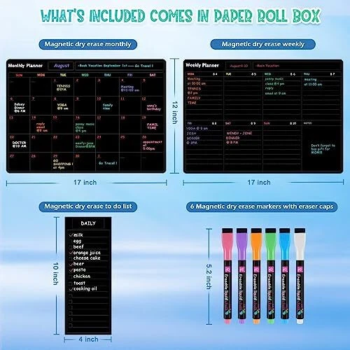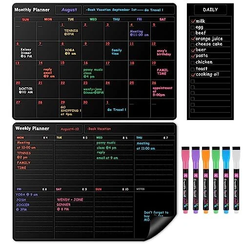Return Policy Fast Delivery Trusted seller Fridge Black Whiteboard Calendar Set(3-Pack),1 Pcs Magnetic Weekly Board and 1 Pcs Refrigerator Planner Calendar,1 Pcs List and 6 Markers,Reward Chore Chart for Kids Multiple Kids Teens Adults Family Product Description 【Durable - Easy to Use】:Durable and Tear-Resistant Design - Say goodbye to flimsy calendars that easily fall down. 5 weeks design, no worry about missing 1 or 2 days in a month. Perfect dry erase monthly calendar set for busy people to keep in track of every event & dates, or use as to-do list, aid to daily tasks. For busy moms who takes care of household chores for family, helpful for student with school schedule for classroom, also for home school student, good for kids' habit training. 【Generous Writing Space】: We know how much important it is for you to have plenty amount of space for writing notes, reminders.Tfore, our magnetic calendar has a large enough place to record your important things. T are many ways you can use our magnetic whiteboards set: apartment decor, family chores, office meeting or deadline planner, a gym routine organizer, a classroom chore planner, to-Do’s reminder, work notes/sheet, workout tracker, a weekly meal planner or grocery list. 【Exceptional Durability】: Our fridge chalkboard calendar set is made with top-of-the-line materials that ensure long-lasting performance. With its edge-cutting stain-resistant PET surface, you can erase and re-write countless times without worrying about any ghosting or smudging. It's perfect for making quick corrections or changing plans on the fly. 【Ideal Gift Idea】:Make your life easier and more organized with our convenient and durable monthly planner. Our planner makes the perfect gift for anyone who wants to stay organized and on top of their busy schedule. Surprise a friend or loved one with this practical and thoughtful present, and help them achieve their goals in style. 【Black 3 Pcs set and Service】:The entire set includes“2 Pcs Large Magnetic Dry Erase Boards(17x12 in)+ 1 Pcs List(10x4 in)+ 6 Markers with Eraser Caps”. We stand behind our product 100%, and if for any reason you are not satisfied with your purchase, please contact us right away. We promise to resolve your issue within 24 hours, so you can rest easy knowing that we've got your back! Shipping Returns Payment Shipping Shipping is FREE to all addresses other than APO/PO boxes in the lower 48 states. All our stock ships from US-based warehouses. Shipped via USPS or UPS (depending on location and package weight) Unless stated otherwise, all orders will ship within 24-72 hours of your payment being processed. Check our feedback to see the great reviews of FAST shipping we offer. Returns Seller does not accept returns Payment We currently accept payment via eBay managed payments only. Once payment is cleared, we will dispatch your shipment within 1-3 business days. Please refer to the "Shipping" tab for more information regarding shipping speed to your destination.