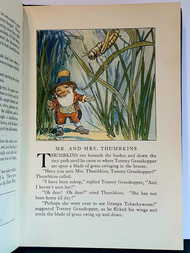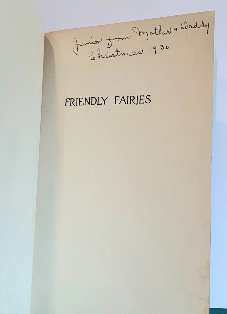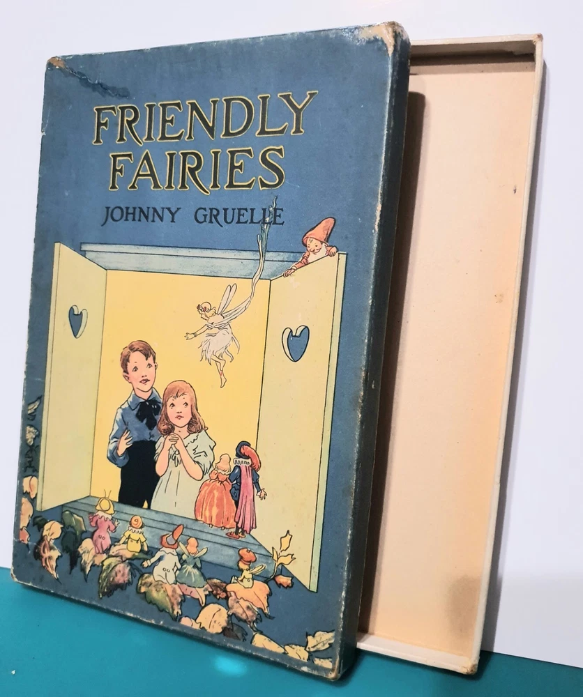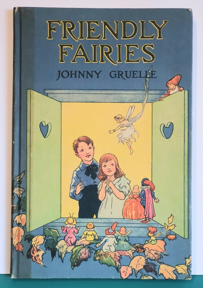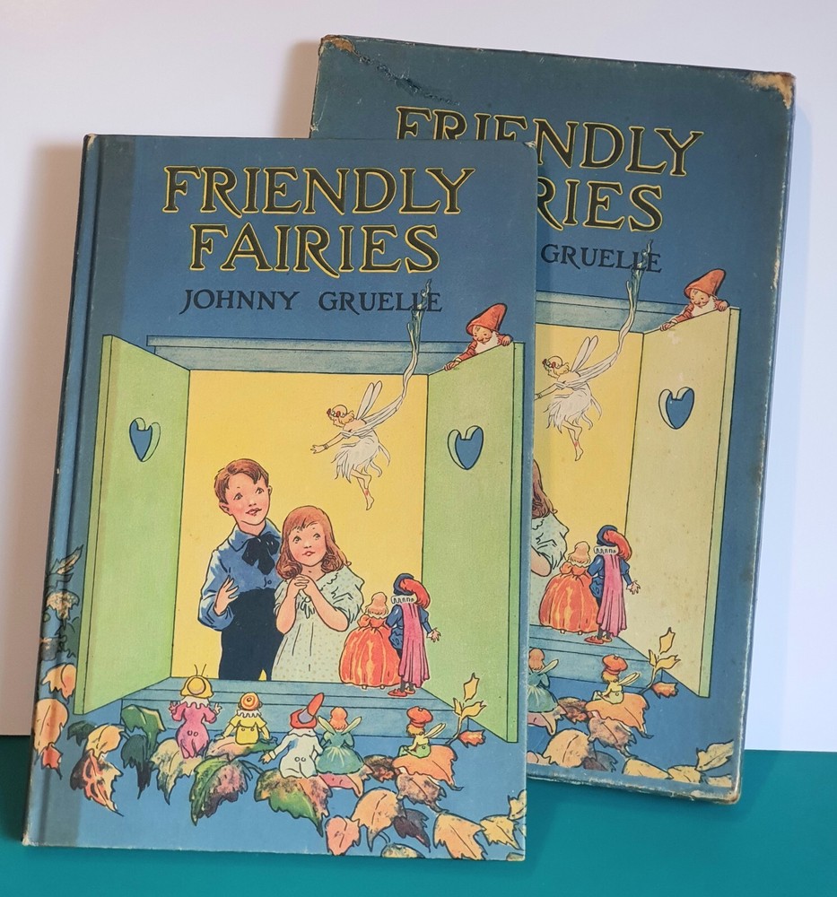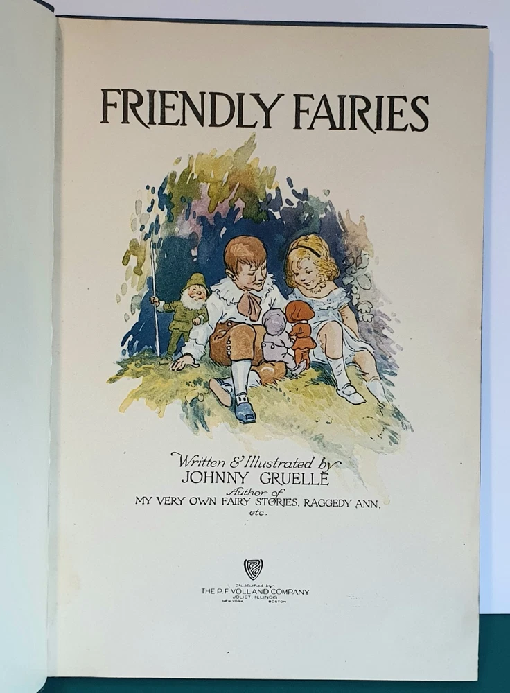 This copy is in Fine Plus to Like New condition with a tight spine, crisp, bright pages, and flat boards. There is an inscription in pen from 1930 on the ffep, as well as minor fingerprint marks on several random pages. The corners have mild signs of bumping. The original box shows signs of age and normal wear and has been stabilized with archival glue and tape. The book measures approx 6.25in x 9.25in. John (Johnny) Barton Gruelle (1880 – 1938) left an indelible mark on American popular culture in a 40 year career as a political cartoonist, children's book and comics author/illustrator, and most notably as the creator of Raggedy Ann and Andy. The son of Myrtle Gruelle and Hoosier Group painter Richard Gruelle, Johnny grew up in Indianapolis, IN at the center of a vibrant community of artists and writers. Among his parents’ friends was the poet James Whitcomb Riley, whose poems Little Orphant Annie (1885) and The Raggedy Man (1888) were the inspiration for the names of Gruelle’s famous characters to come. Friendly Fairies is part of the P.F. Volland Company Happy Children Book series published in 1919, 27th printing. The work contains 15 fairy tales including The Fairy Ring , The Three Little Gnomes and Mr. & Mrs. Thumbkins, with imaginative, color pictorial boards and illustrations throughout by Gruelle himself. Gruelle filed a patent for his Raggedy Ann doll in 1915; these illustrations and stories were the very beginnings of a unique career that would leave a legacy of delight in literature, film, and art to this present day.