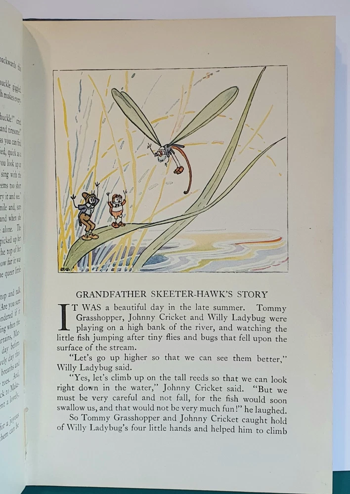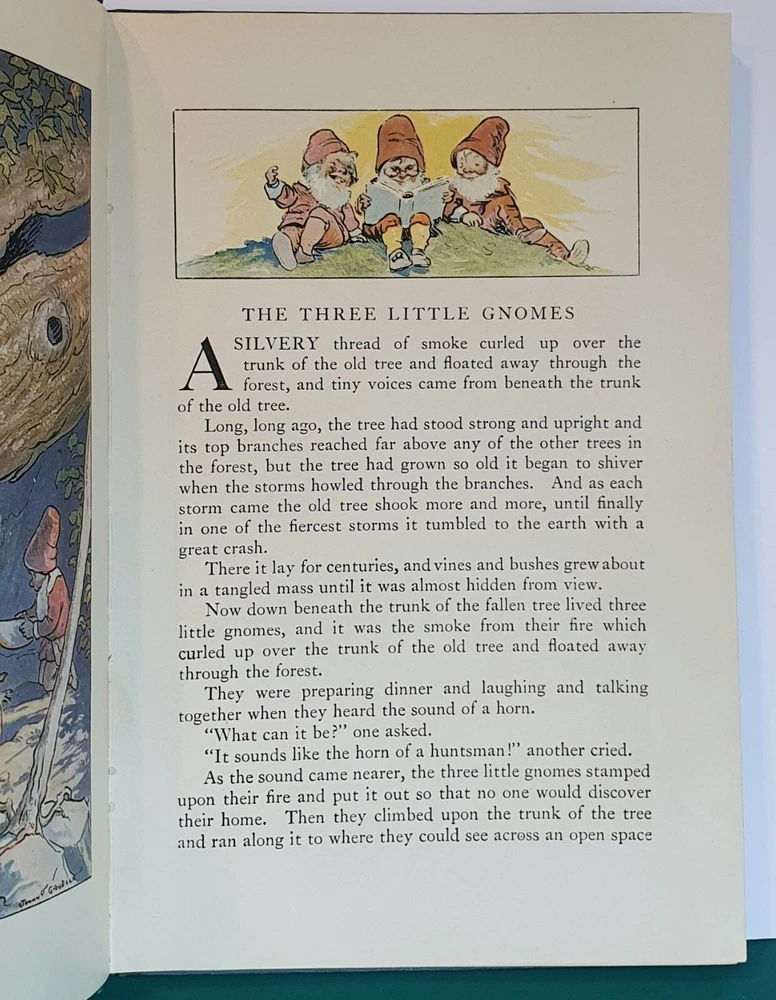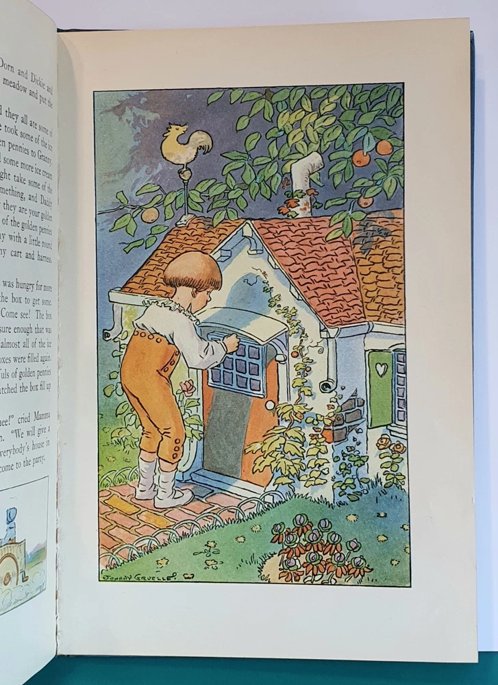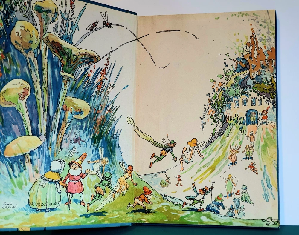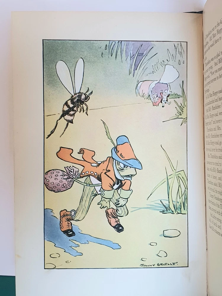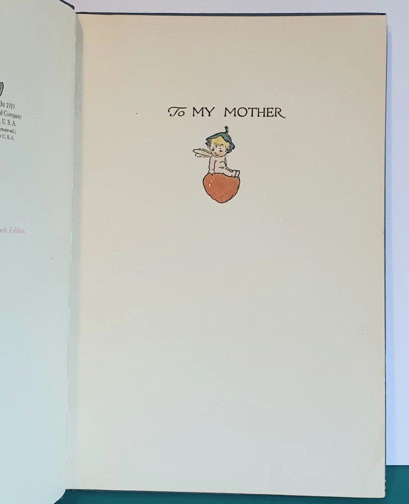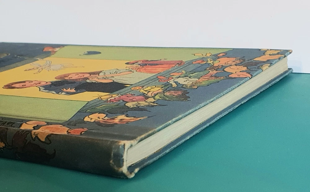 This copy is in Fine Plus to Like New condition with a tight spine, crisp, bright pages, and flat boards. There is an inscription in pen from 1930 on the ffep, as well as minor fingerprint marks on several random pages. The corners have mild signs of bumping. The original box shows signs of age and normal wear and has been stabilized with archival glue and tape. The book measures approx 6.25in x 9.25in. John (Johnny) Barton Gruelle (1880 – 1938) left an indelible mark on American popular culture in a 40 year career as a political cartoonist, children's book and comics author/illustrator, and most notably as the creator of Raggedy Ann and Andy. The son of Myrtle Gruelle and Hoosier Group painter Richard Gruelle, Johnny grew up in Indianapolis, IN at the center of a vibrant community of artists and writers. Among his parents’ friends was the poet James Whitcomb Riley, whose poems Little Orphant Annie (1885) and The Raggedy Man (1888) were the inspiration for the names of Gruelle’s famous characters to come. Friendly Fairies is part of the P.F. Volland Company Happy Children Book series published in 1919, 27th printing. The work contains 15 fairy tales including The Fairy Ring , The Three Little Gnomes and Mr. & Mrs. Thumbkins, with imaginative, color pictorial boards and illustrations throughout by Gruelle himself. Gruelle filed a patent for his Raggedy Ann doll in 1915; these illustrations and stories were the very beginnings of a unique career that would leave a legacy of delight in literature, film, and art to this present day.