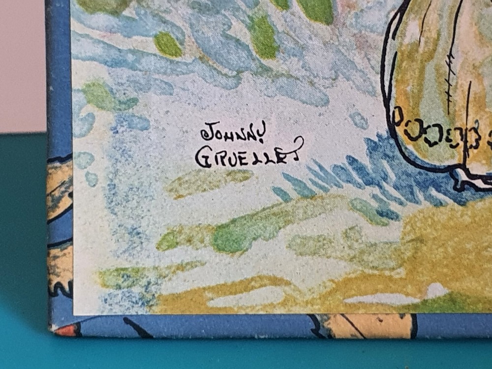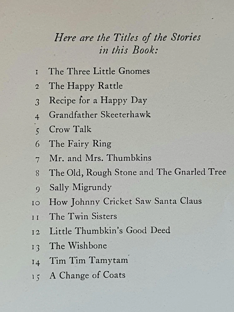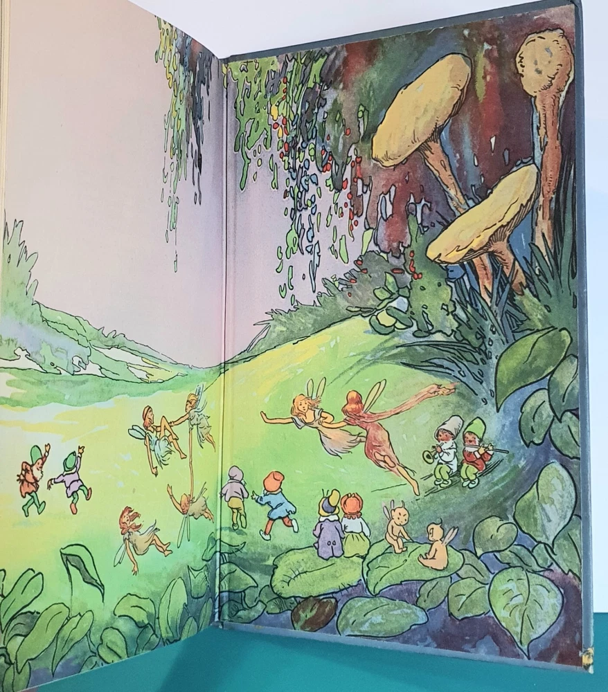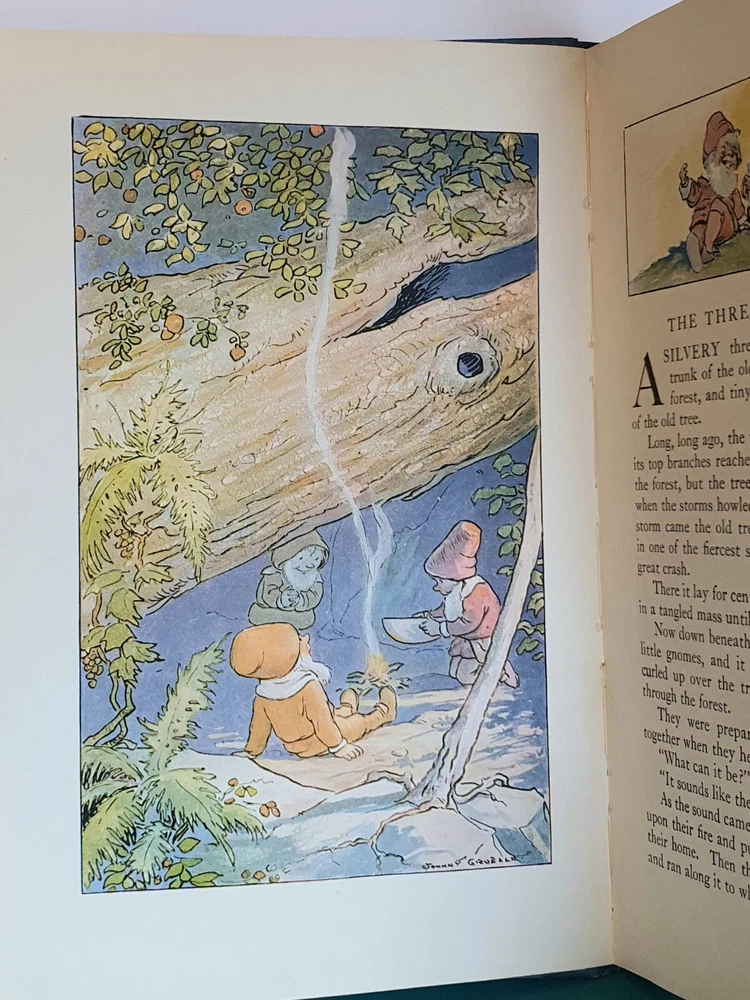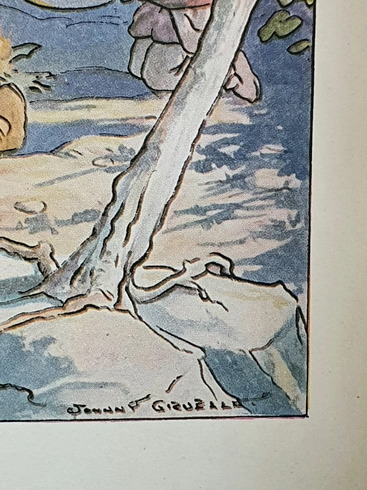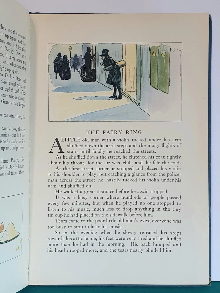 This copy is in Fine Plus to Like New condition with a tight spine, crisp, bright pages, and flat boards. There is an inscription in pen from 1930 on the ffep, as well as minor fingerprint marks on several random pages. The corners have mild signs of bumping. The original box shows signs of age and normal wear and has been stabilized with archival glue and tape. The book measures approx 6.25in x 9.25in. John (Johnny) Barton Gruelle (1880 – 1938) left an indelible mark on American popular culture in a 40 year career as a political cartoonist, children's book and comics author/illustrator, and most notably as the creator of Raggedy Ann and Andy. The son of Myrtle Gruelle and Hoosier Group painter Richard Gruelle, Johnny grew up in Indianapolis, IN at the center of a vibrant community of artists and writers. Among his parents’ friends was the poet James Whitcomb Riley, whose poems Little Orphant Annie (1885) and The Raggedy Man (1888) were the inspiration for the names of Gruelle’s famous characters to come. Friendly Fairies is part of the P.F. Volland Company Happy Children Book series published in 1919, 27th printing. The work contains 15 fairy tales including The Fairy Ring , The Three Little Gnomes and Mr. & Mrs. Thumbkins, with imaginative, color pictorial boards and illustrations throughout by Gruelle himself. Gruelle filed a patent for his Raggedy Ann doll in 1915; these illustrations and stories were the very beginnings of a unique career that would leave a legacy of delight in literature, film, and art to this present day.