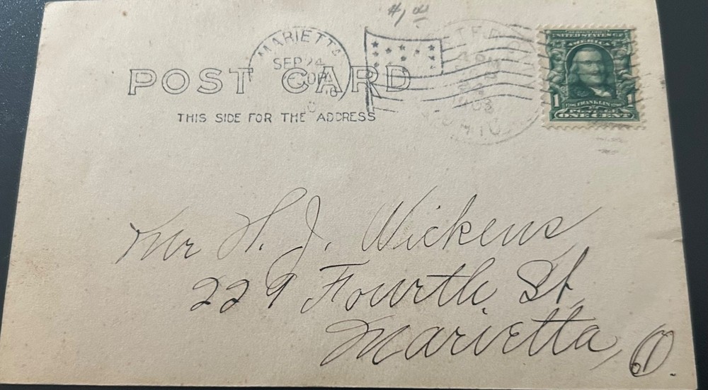 The product is a real photo postcard depicting a group of friends dressed for church in Marietta, Ohio in 1908. The postcard captures a moment of friendship and is an original piece from the early 1900s. The theme of the postcard revolves around people and the authentic stamp on it adds historical value to the piece, making it a unique and collectible item for those interested in postcard collecting and non-topographical postcards.