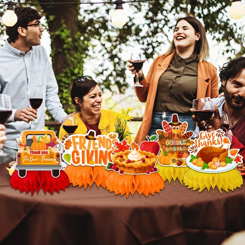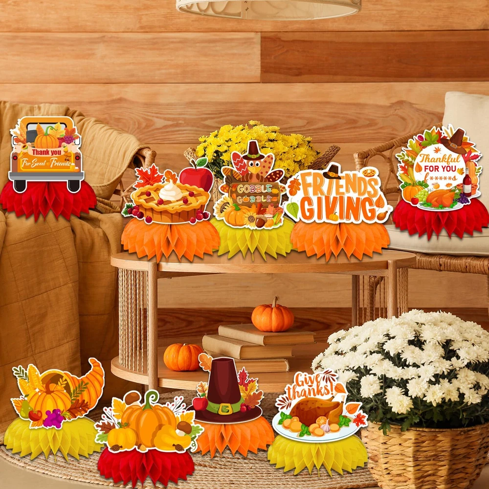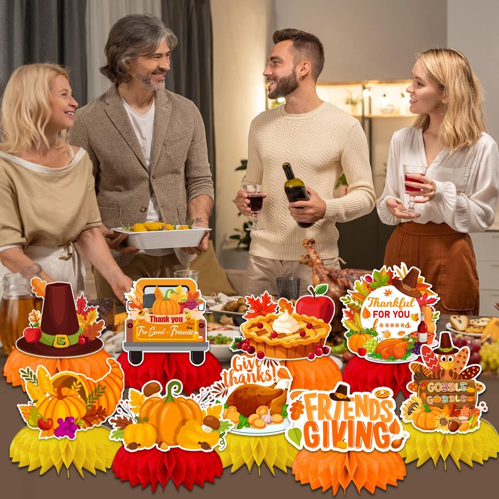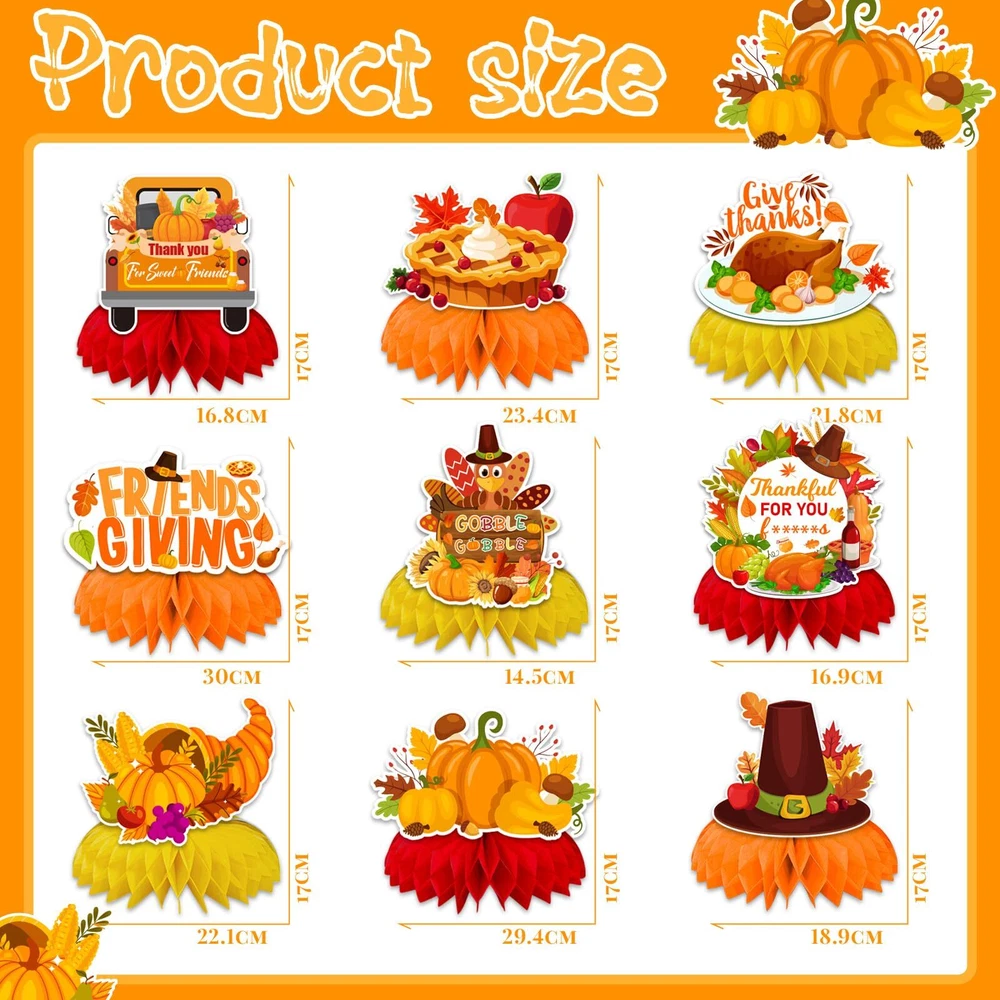 Friendsgiving Table Decorations,9pcs Friendsgiving Honeycomb Turkey Centerpieces for Tables Thanksgiving Honeycomb Table Decorations Fall Pumpkin Party friendgiving Honeycomb Centerpiece: our friends party supplies with 9 pieces friendsgiving centerpieces for tables, each with a different style, which including thankful for you friends, turkey,pumpkin sign, variety of shape honeycomb centerpieces in different patterns. These friendgiving decor will be a big hit on thanksgiving table decor for kids party. Features: Seamless, light, fade-free, and not easily deformed High-quality 250g cardstock material Durable and reusable if they are stored well Double-side print and 3D honeycomb orbs Printed with various friends giving elements Suggested use: friendsgiving party decorations table |happy thanksgiving table decor|friendsgiving for kids; friendsgiving party decoration pack|friendsgiving table decorations|friendsgiving party supplies; fall party decorations| falll pumpkin party| FRIENDSGIVING TABLE DECORATIONS:our friends party supplies with 9 pieces friendsgiving centerpieces for tables, each with a different style, which including thankful for you friends, turkey,pumpkin sign, variety of shape honeycomb centerpieces in different patterns. These friendgiving decor will be a big hit on thanksgiving table decor for kids party DURABLE QUALIITY:the centerpiece thanksgiving table decorations are made of heavy-duty double-sided cardstock and honeycomb orbs, Adopt high-tech digital printing with a photo-like shine, durable and can be reused,which are great choice for your friendsgiving party decorations SIMPLE TO ASSEMBLE: these happy thanksgiving table decorations can be assembled according to the pictures in just a few seconds. you just need to tea off the glue dot picker on the back of the honeycomb, unfold the honeycomb, and paste the cardstock pattern, repeat on the other side of the card, then you can get a perfect honeycomb decoration. use the friendsgiving table decorations to put them in your favorite display area to easily decorate your friendsgiving party, saving time and effort SUGGESTED USE: friendgiving decor suitable for friends giving party,thanksgiving party, Fall Pumpkin Party, thanksgiving favors for table, thanksgiving kids decorations, turkey centerpieces for tables ,etc SATISFACTION GUARANTEED: our customer service team is friendly and enthusiastic, if you have any questions or suggestion about our friendsgiving centerpieces, please contact us directly Shipping from the USA All of our products are shipped from the USA, ensuring quick delivery to your destination. Payment We offer the following payment methods: PayPal, credit card, bank transfer, and eBay's secure payment system. Free Shipping & Free Returns Shipping within the USA is FREE. Additionally, any return is absolutely free for you. Risk-Free Purchase You have the option to return an item within 30 days without any justification. We cover the return shipping costs! Fast Shipping We ship immediately upon receipt of payment. Generally, the package is delivered within 2-3 days in the USA. If it takes longer, we will contact you. Quality and Costs Made in Europe, USA, China No customs fees or additional charges Total satisfaction guarantee Invoice with declared VAT available upon request in .pdf format Feedback Your feedback is very important to us. After you pay for your purchase, you will automatically receive positive feedback from us.