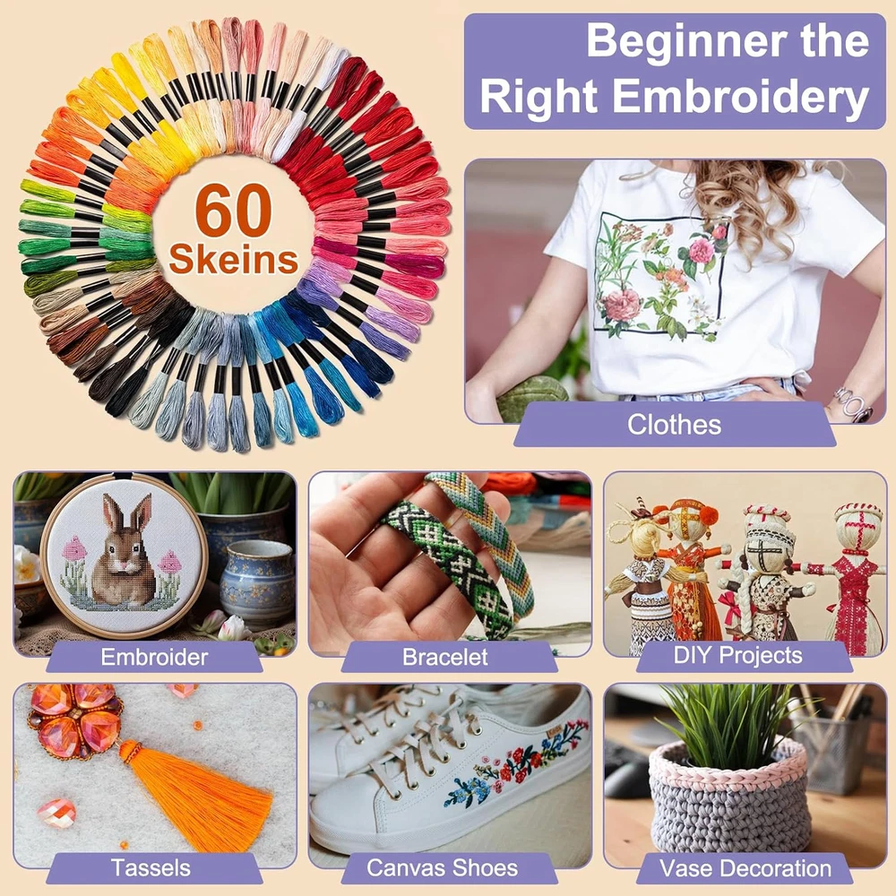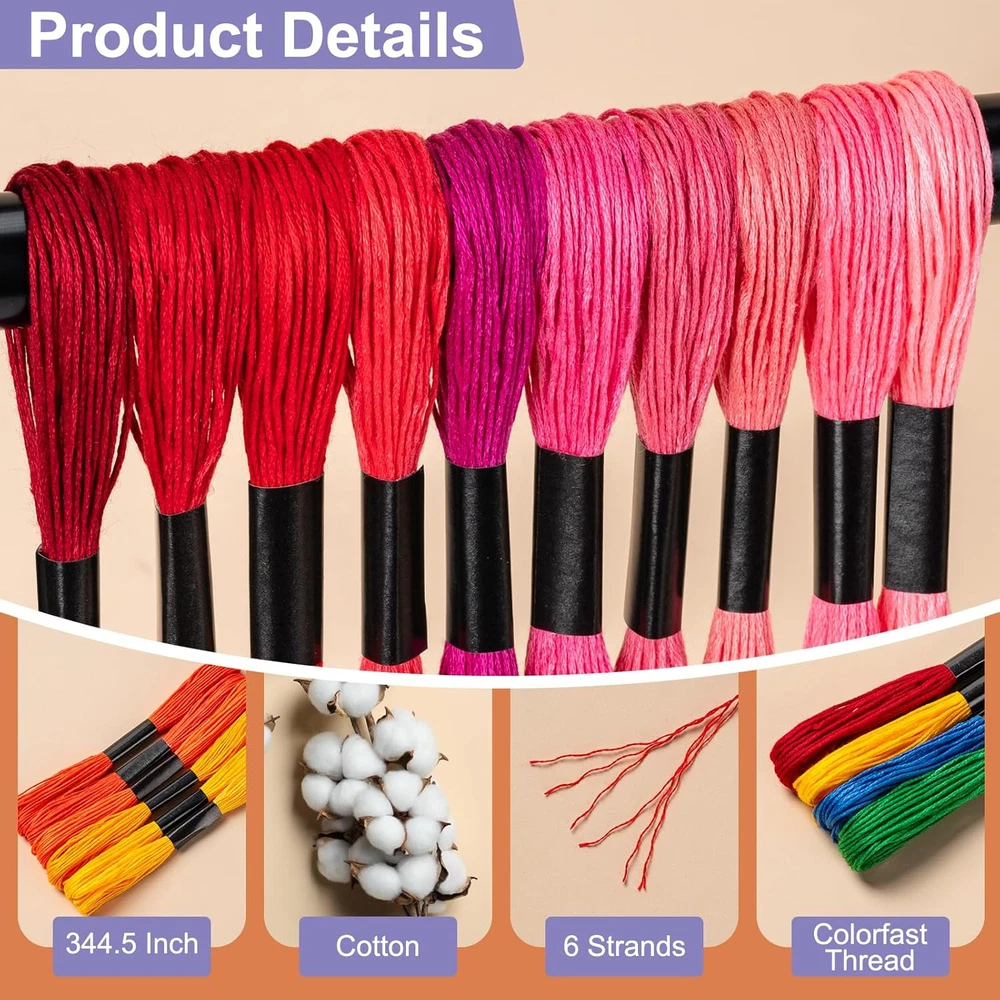 Friendship Bracelet String, 60 Skeins Cross Stitch Thread with 60 colors Description Features: PRODUCT SIZE: The bracelet thread is approximately 344.5 inch long per strand and consists of 6 strands of thread that are strong, durability and resistant to breakage RICH COLOR: Our embroidery supplies are available in 60 colors, including almost every color you can think of, in a wide range of shades that guests can pick and choose from GOOD MATERIALS: The materials of this rainbow embroidery floss is cotton, soft, no lint, can be used for a long time; can meet your requirements for different embroidery WIDELY USED: Split the threads as needed. Each variegated embroidery floss comes in a fixed package, no need to tear the wrapper, just find the thread and pull it straight out EXCELLENT PRODUCT: Rainbow embroidery set is perfect for friendship bracelets, crafts, embroidery floss art, tassels, diy crafts, ideal embroidery kit for beginner MULTI SCENARIOS: Thread bracelets are perfect for getting parents and children involved in crafting joint, as well as improve children's hands-on abilities and imaginative Product Details: Material: Cotton Brand: Amrules Color: 60 colors Item Weight: 0.2 Kilograms Item Length: 344.5 Inches Product Care Instructions: Machine Wash Material Composition: Cotton Manufacturer: Amrules Item Weight: 7 ounces Country of Origin: China Item model number: Thread8 Handling We will ship all orders within 3 business day of payment. Delivery We take pride in offering fast and reliable delivery for your orders! We are committed to getting your products to you as quickly as possible. Generally, we would like to inform you that all orders will be delivered to you within 1-3 business days after processing.However, in some cases, delivery times may vary depending on the buyer's location. Especially in remote or rural areas, the expected delivery time may be extended. In such situations, we do our best to ensure that your order reaches you as quickly as possible.If there are any delays, we will be happy to contact you to explain the situation. Our goal is to enhance your satisfaction with our fast delivery times. We work diligently to ensure that your order arrives safely.Trust us and enjoy our speedy delivery! Return Policy All items qualify for returns within 30 days of receipt. Buyer is responsible for return shipping on any item that is not damaged. Feedback We take our reputation seriously, we buy and sell online, so we understand the value of trust. If you are unsatisfied with your order, please contact us and we will work with you to resolve it to your satisfaction.