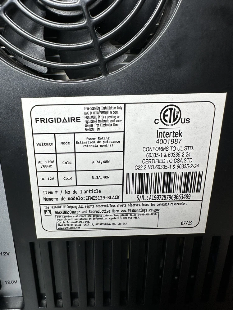 Type:Portable FridgeInstallation:Tabletop UnitMaterial:PlasticNumber of Freezer Compartments:1Features:Retro StyleItem Height:10.5 in.Bottle Capacity:6 cansNumber of Drawers:1Number of Shelves:1Finish:PaintedDefrost Method:Manual DefrostColor:BlackModel:EFMIS129Item Width:7 inNumber of Doors:1Brand:FrigidaireDoor Style:Opens Right