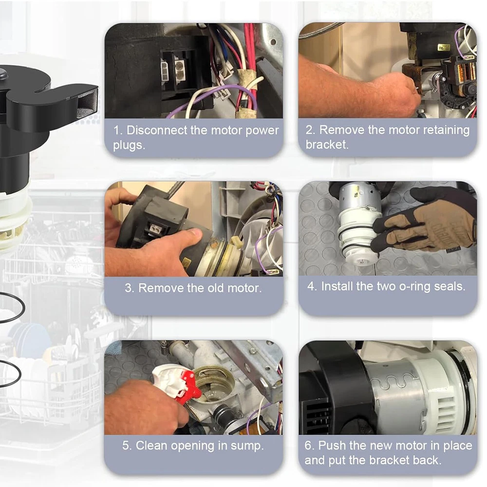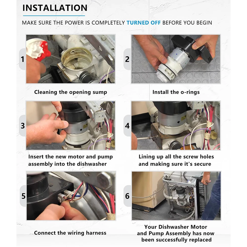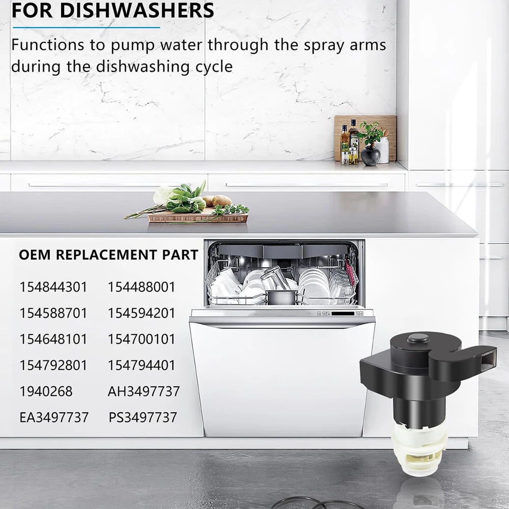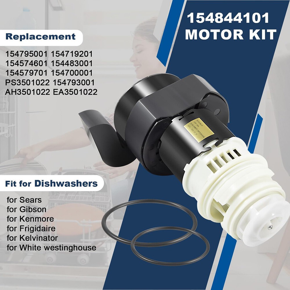 Fitment: 154844101 Motor kit applicable for Frigidaire, for Kelvinator, for Kenmore, for Sears dishwashers. Replacement for 154483001 154795001 154719201 154793001 154574601 154579701 154700001 AH3501022 EA3501022 PS3501022 Features: 1) Made of alloy steel, pure copper, and superior plastic. The material provides strength, durability, corrosion resistance and excellent electrical conductivity. These components keep the circulation pump with efficient and consistent performance that withstands constant exposure to water& temperature fluctuations 2) The dishwasher motor replacement propels water forcefully and ensures optimal water pressure to spray arms, allowing them to effectively disperse water and detergent onto dishes during the wash cycle 3) Ensure dishes receiving a thorough rinse and cleaning. Provide consistent water pressure and even distribution. Operate at a little noise level to keep a quiet dishwasher running experience 4) Voltage: 120 V, Frequency: 60 Hz, Current: 0.5 A, Wattage: 60 W, Speed: 2,900 RPM 5) To get the dishwasher out from under counter. Then unplug harness and remove bracket to pull out the old pump. Put in the new pump, install bracket, and plug in the harness. Finished within several minutes and without complicated tools Package included: 154844101 Motor kit