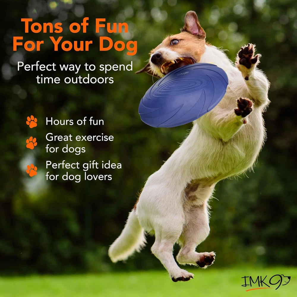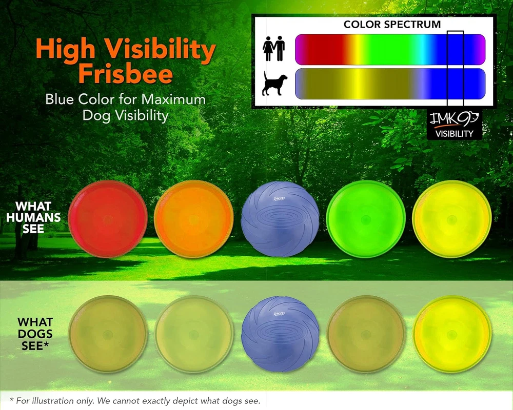 BLUE COLOR FOR MAXIMUM DOG VISIBILITY: Bright colors like green, orange, yellow and red stand out to human eyes, but the dog color visibility spectrum is different. For your furry friend, the most distinct and bright color is blue. Give a blue Frisbee a try and see the difference! TONS OF FUN FOR YOU AND YOUR DOG: Playing with a Frisbee is great fun and healthy exercise for both you and your beloved dog. It’s the perfect way to spend more time outdoors, It's an ideal gift for dog lovers, and when your dog gets thirsty you can even turn it over and use it as a drinking bowl. AERODYNAMIC DESIGN FOR EASY FLIGHT: You won’t have to wear out your arm throwing this Frisbee. The aerodynamic grooved design makes the Frisbee keep flying with just a flick of the wrist. If you accidentally chuck it too far, the high visibility blue color means your dog will see it before you do. NATURAL RUBBER FOR SAFETY: Hard plastic Frisbees can shatter or splinter, and sharp shards of plastic could injure your beloved pooch. Our Frisbee is different – it’s made of soft natural rubber. It will never break up into sharp pieces that could hurt your dog. ALL CHEWED UP PROMISE: Unlike others, we won’t promise this Frisbee is indestructible. If your dog destroys this Frisbee, then we’ll refund your money or send you a new one for free. That's our IMK9 promise. Product Description