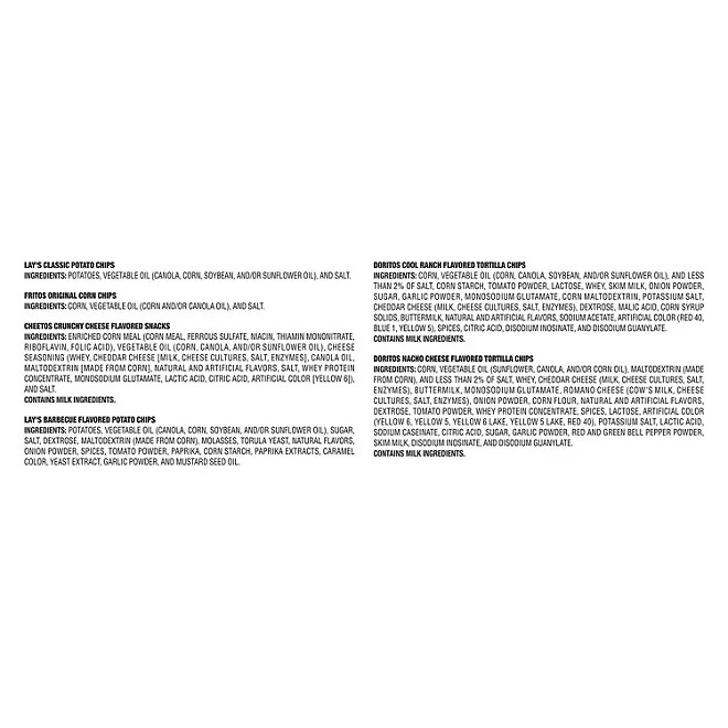 Frito-Lay Classic Variety Pack – Assorted Chips & Snacks – Perfect for Parties, Lunches & On-the-Go 🎉 Perfect Snack Pack for Every Occasion Keep everyone satisfied with the Frito-Lay Classic Variety Pack , featuring an irresistible assortment of your favorite chips and snacks. Whether it’s for school lunches, office break rooms, road trips, or family movie nights, this pack offers the ideal portion size and flavor variety to please every palate. 🥪 Great for Lunches, Parties & More From lunchboxes to snack tables, Frito-Lay makes it easy to grab, go, and enjoy . Each individually portioned bag is sealed for freshness, making it perfect for: School snacks & lunchboxes Office pantries & break rooms Picnics, road trips & camping Game nights, parties & get-togethers 🧂 A Delicious Assortment Everyone Loves This classic variety includes some of the most popular Frito-Lay chips, offering a mix of savory flavors and satisfying crunch in every bite. Perfect for both kids and adults. ✅ Trusted Brand, Quality Snacks Frito-Lay is known for crafting delicious, high-quality snacks that bring people together. Whether you’re relaxing at home or hosting a crowd, this variety pack ensures there’s something for everyone to enjoy . Product Features: Brand: Frito-Lay Type: Classic Variety Snack Pack Packaging: Individually wrapped snack-size bags Ideal for: Lunches, parties, travel, sharing Fresh, sealed packaging for long shelf life Stock up on flavor with the Frito-Lay Variety Pack – your go-to solution for convenient, crowd-pleasing snacks!