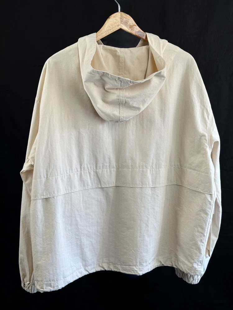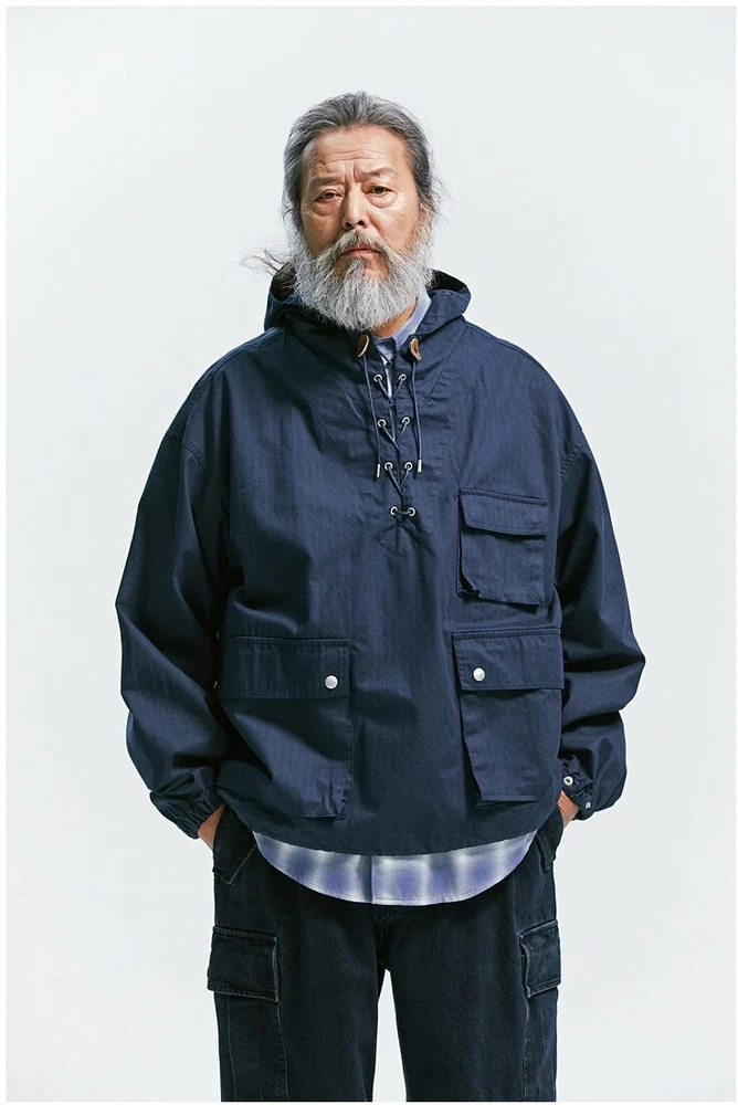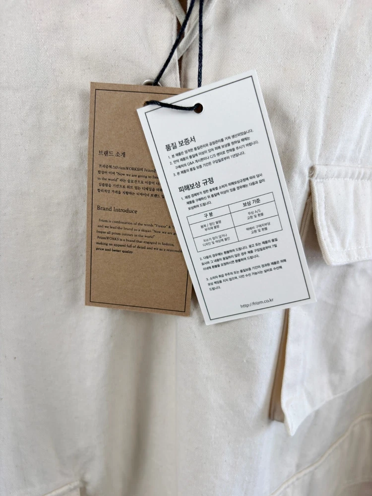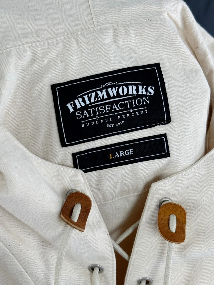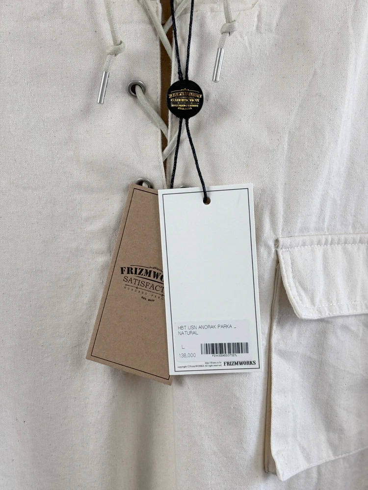 Frizmworks HBT USN Anorak Parka Natural size L A pullover anorak designed based on the dek anorak of the U.S. Navy in World War II. The fabric is made of thick 10-seater Herringbone twill fabric for a matte touch and vintage mood. By adjusting or tying the straps with a leather stopper, the user can coordinate according to their preferences, the band is put in to hold the end of the sleeve, and snaps are added to adjust the sleeve width. Elastring and stopper are added to the hem to enable various productions. It is designed for ample storage space by adding a large pocket. It is designed casual with a military base, so it is a good item to coordinate with various outfits. Designed and made in Korea, Frizmworks is a brand who's committed to making apparel full of detail and quality. . 100% midweight cotton twill fabric. . 675g heavy twill material, making it ideal for spring as the jacket of choice. . USN military inspired navy pop over the head design. . Vintage draw string neck closure. . Large bellow pockets at the bottom of the jacket. . 1 Cinch toggle to draw the shape in at the waist. Size L: Length: 67cm Shoulder: 62cm Chest: 67cm Sleeve: 59cm