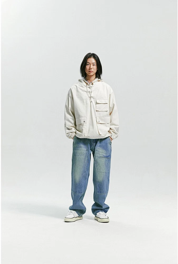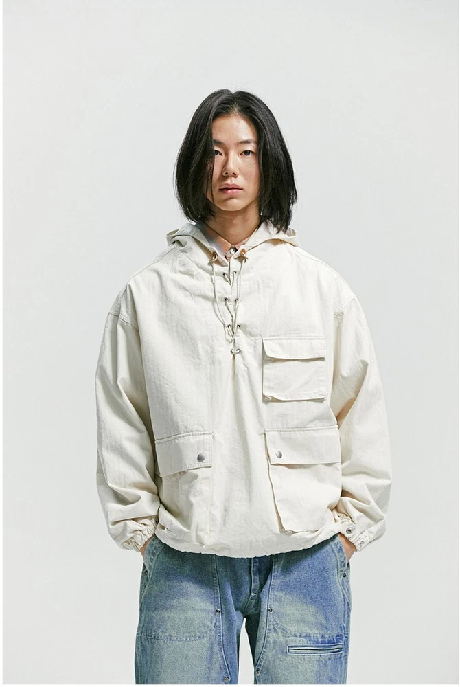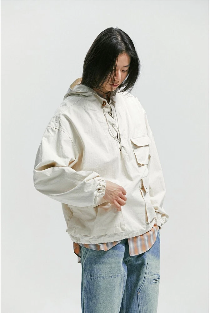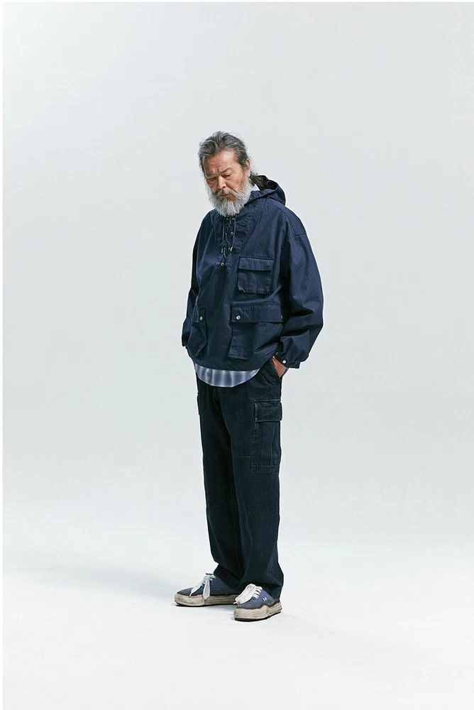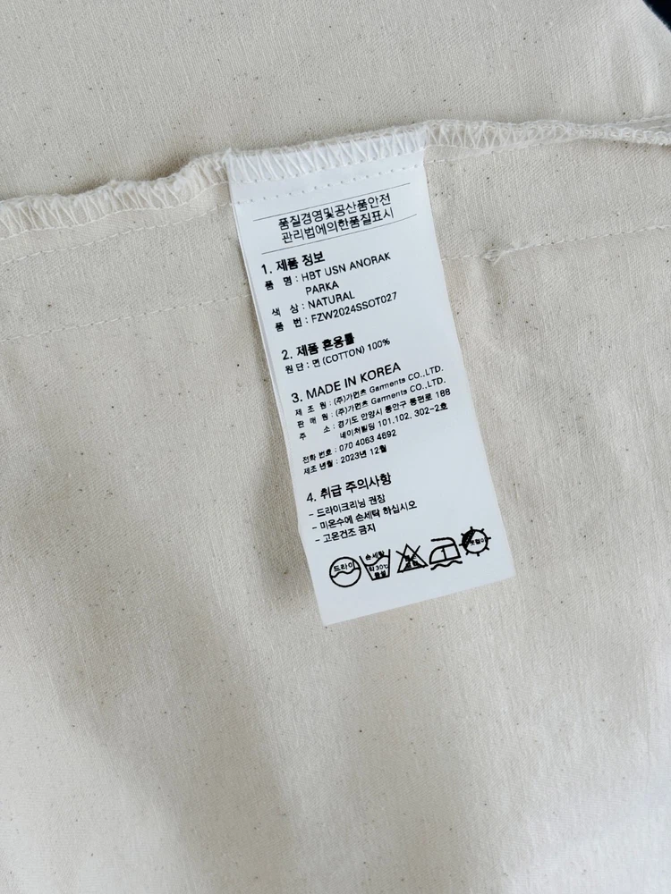 Frizmworks HBT USN Anorak Parka Natural size L A pullover anorak designed based on the dek anorak of the U.S. Navy in World War II. The fabric is made of thick 10-seater Herringbone twill fabric for a matte touch and vintage mood. By adjusting or tying the straps with a leather stopper, the user can coordinate according to their preferences, the band is put in to hold the end of the sleeve, and snaps are added to adjust the sleeve width. Elastring and stopper are added to the hem to enable various productions. It is designed for ample storage space by adding a large pocket. It is designed casual with a military base, so it is a good item to coordinate with various outfits. Designed and made in Korea, Frizmworks is a brand who's committed to making apparel full of detail and quality. . 100% midweight cotton twill fabric. . 675g heavy twill material, making it ideal for spring as the jacket of choice. . USN military inspired navy pop over the head design. . Vintage draw string neck closure. . Large bellow pockets at the bottom of the jacket. . 1 Cinch toggle to draw the shape in at the waist. Size L: Length: 67cm Shoulder: 62cm Chest: 67cm Sleeve: 59cm