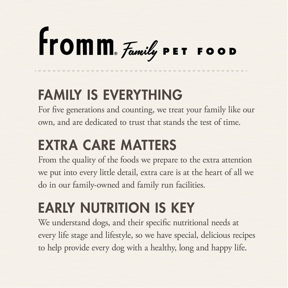Fromm Puppy Gold Premium Dry Dog Food - 5 Pound (Pack of 1) Description Features: DRY PUPPY FOOD - Chicken recipe dry dog food for puppies and pregnant or nursing mothers. Formulated to meet the nutritional levels established by the AAFCO Dog Food Nutrient Profiles for gestation/lactation and growth. FAMILY OWNED & OPERATED - Fromm Family Foods is a fifth-generation family-owned-and-operated pet food company based in Wisconsin. Since 1904, our family has maintained a tradition of quiet innovation dedicated to the health and nutrition of animals. HIGH-QUALITY PROTEIN - Our dog kibble has chicken, duck, and lamb. Very digestible and highly palatable sources of protein that provide amino acids required for maintaining muscle, tissue repair, hormone synthesis, and other metabolic processes. WHOLE GRAIN GOODNESS - Our dry food for dogs contains a mix of whole grains that provide an impressive variety of vitamins, minerals, and high-quality complex carbohydrates, which can provide energy and fiber. EASY FEEDING - This 5 lb bag of puppy dog food is great for medium and small breeds. Fromm is dedicated to providing exceptional foods to pet families everywhere. We would love to assist with your pet’s nutritional needs. Product Details: Handling We will ship all orders within 1 business day of payment. Delivery We Do Not Ship Outside of the Continental US. Return Policy All items qualify for returns within 30 days of receipt. Buyer is responsible for return shipping on any item that is not damaged. Feedback We take our reputation seriously, we buy and sell online, so we understand the value of trust. If you are unsatisfied with your order, please contact us and we will work with you to resolve it to your satisfaction.