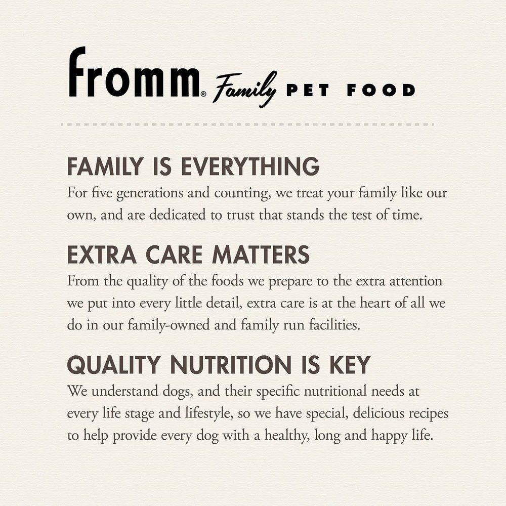 π Product Description SENIOR DOG FOOD - Chicken recipe dry dog food for less active adult dogs and senior dogs. Formulated to meet the nutritional levels established by the AAFCO Dog Food Nutrient Profiles for maintenance.,FAMILY OWNED & OPERATED - Fromm Family Foods is a fifth-generation family-owned-and-operated pet food company based in Wisconsin. Since 1904, our family has maintained a tradition of quiet innovation dedicated to the health and nutrition of animals.,HIGH-QUALITY PROTEIN - Our dog kibble has chicken, duck, and lamb. Very digestible and highly palatable sources of protein that provide amino acids required for maintaining muscle, tissue repair, hormone synthesis, and other metabolic processes.,WHOLE GRAIN GOODNESS - Our dry food for dogs contains a mix of whole grains that provide an impressive variety of vitamins, minerals, and high-quality complex carbohydrates, which can provide energy and fiber.,EASY FEEDING - This 5 lb bag of dry dog food is great for less active adult dogs and senior dogs. Fromm is dedicated to providing exceptional foods to pet families everywhere. We would love to assist with your petβs nutritional needs. π Specifications size 5 Pound (Pack of 1) itemWeight 5.18 pounds partNumber 072705115471 manufacturer Fromm productDimensions 3.0 x 3.0 x 3.0 inches β Fast Shipping | β Quality Guaranteed | β Customer Support 30-Day Returns β’ 100% Satisfaction
