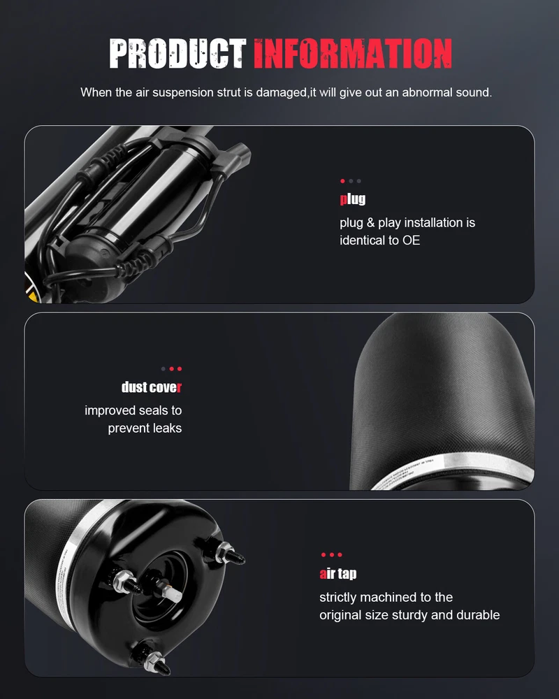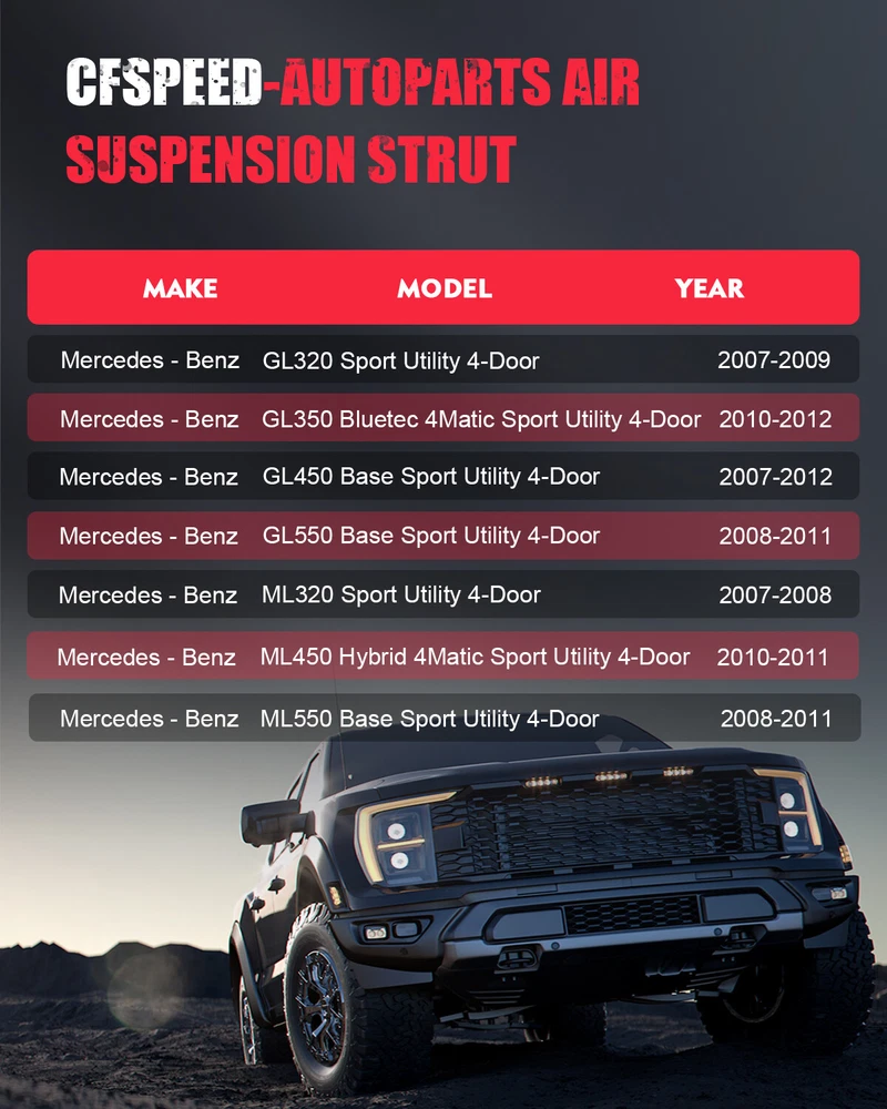 *Compatibility Chart 1, You can distinguish specific model of an automobile by VIN(Vehicle Identification Number). 2, VIN(Vehicle Identification Number) consists of total 17 English letters and arabic digits. 3, VIN does not include the letters I (i), O (o), and Q (q) (to avoid confusion with numerals 1 and 0). Cfspeed-autoparts Front Air Suspension Shock Struts For Mercedes W251 R320 R350 R500 R550 2006-13 *Compatibility Chart 1, You can distinguish specific model of an automobile by VIN(Vehicle Identification Number). 2, VIN(Vehicle Identification Number) consists of total 17 English letters and arabic digits. 3, VIN does not include the letters I (i), O (o), and Q (q) (to avoid confusion with numerals 1 and 0). Mercedes-Benz R-Class W251 R320 Bluetec Wagon 4-Door 3.0L 2009 R320 CDI Wagon 4-Door 3.0L 2007-2008 R350 4Matic Wagon 4-Door 3.5L 2006-2013 R350 Base Wagon 4-Door 3.5L 2008-2013 R350 Bluetec 4Matic Wagon 4-Door 3.0L 2010-2013 R500 Base Wagon 4-Door 5.0L 2006-2008 R500 Premium Wagon 4-Door 5.0L 2006 R500 Sport Wagon 4-Door 5.0L 2006-2008 R550 4Matic Wagon 4-Door 5.5L 2008 R63 AMG Base Wagon 4-Door 6.3L 2007 * Generation & Evolution: Mercedes-Benz R-Class W251 First generation (2006-2013) Mercedes-AMG R63 AMG (2007) 6.2 L M156 V8 Engine The AMG Version of the W251 *Features and Benefits: Made of high quality raw materials, effectively reduce air leakage, strong sealing All parts are hand inspected off the line before packaging and once again by our team before shipment. According to the original factory specifications. Perfect match for the original car. Easy installation. Stable characteristics, high reliability. Aftermarket Products with Premium Quality. Precisely engineered to absorb shock and vibration from the road Return policy: Enjoy 30 days return and exchange *Frequently Asked Questions : Can air suspension be used in the winter? Most certainly yes! While winter does provide some unique challenges to driving, some simple maintenance on your air system can make cold climate motoring a non-event. One thing about being based in Lansing, MI, we see PLENTY of cold, snowy weather! As a matter of fact, there are a few of us that take advantage of the weather to indulge in some …ahem… sideways driving and even ice racing with our bagged cars. What kind of maintenance is recommended for air suspension? Overall, the only maintenance is to regularly drain the air tank to reduce the amount of water circulating through the system. We offer in-line water traps that can aide in this activity, while also significantly reducing the amount of water that gets in the system in the first place. In any case, draining the system once a month is a good rule of thumb and only takes a minute. For those of us in the northern climates, keeping your system dry is key to trouble-free running in the winter. What is the difference between air line sizes? In the automotive aftermarket, there are 3 common size air lines: 1/4”, 3/8”, 1/2”. The most commonly used size tends to be 1/4” because it is the easiest to rout through the vehicle. Some people like the car to move from one position to the next faster than 1/4” can do (based on the flow rate and air spring volume/pressure requirements) so they tend to choose 3/8”. The crowd that likes 1/2” will choose that size because they want the body to spring up very quickly when a valve is activated. Installing ½” lines can be the equivalent of wrestling an anaconda… Can I install air suspension myself? Our kits are designed for DIY people to easily and correctly install all the components if they follow our comprehensive instruction manuals. Anyone that can wire a stereo and swap suspension components has the required skills to complete a basic installation in their driveway over a weekend. However, some kits require frame modifications or welding where metal fabrication is necessary. This is NOT an area where a first-timer should learn those skills Where can I get air suspension installed? Any competent shop that performs mechanical work will have the necessary tools to complete the job. Which side of my car is the Right and Left? The right and left sides of an automobile are determined as if sitting in the car facing forward. Thus, the left side is on the left when sitting in the car facing forward, and the right side is on the right. For American cars, the driver’s side is on the left, and the passenger sits to the right of the driver. For cars in Japan, Britain, Ireland, the Bahamas and some other former British colonies -- where they drive on the left side of the road -- the passenger sits on the left side, and the driver (along with all the driving controls) is on the right. *OEM Part Number: 2513203013,251320301380, 2513203113,251320311380, 2513205613,251320561380, 2513205713,251320571380 *Item Specifications: Key Words: Front Air Suspension Shock Struts For Mercedes W251 R320 R350 R500 R550 2006-13 Package Includes: Single for Front Left or Right Air Suspension Shock Strut Notes : Please double confim the compatibility as well as the OEM number before purchasing. Instruction is not included. Professional installation is recommended. Item Specifics Brand cfspeed-autoparts Placement on Vehicle Left Right Front Part Type Air Suspension Strut Fitment Type Direct Replacement Size Single Dimension(CM) 92.50(Length)*17.00(Width)*16.00(Height) Single Weight(KG) 10.250 Maximum Operating Pressure (psi) 195 Minimum Operating Pressure (psi) 90 Upper Mount Type Stud Lower Mount Type U-Bracket Included Hardware None Drive Layout Front Engine RWD & 4WD Platform W251 Custom Bundle No Material Iron Aluminium Alloy Rubber Quantity Single OE Spec or Performance/Custom OE Spec Adjustable Yes Greasable or Sealed Sealed Manufacturer Part Number C11051601APS Interchange Part Number Air Suspension Shock Strut, Air Ride Shock Strut OE Part Number 2513203013, 251320301380, 2513203113, 251320311380 Superseded Part Number 2513205613, 251320561380 Payment 