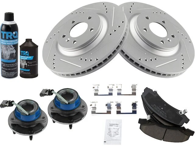 Front Brake Pad and Rotor and Wheel Hub Kit fits Chevy Impala 2012-2013 41QMJS Front Brake Pad and Rotor and Wheel Hub Kit fits Chevy Impala 2012-2013 41QMJS Position: Front Brand: TRQ Brake Pad and Rotor and Wheel Hub Kit Condition: New Product Description Notes: Ceramic Performance Brake Pad & Rotor Kit with Wheel Bearings -- with 12.72 in. (323mm) Diameter Front Rotors Features: Ceramic Improved Stopping Power: Cross-drilled slotted to reduce brake fade Longer Lasting: True non-interference vane design for optimized cooling Positive Molded: Less dust resulting in cleaner wheels Multi-Layer Shim: Reduced noise and vibration Direct Replacement: No modifications necessary Product Specifications Wheel Lug Count: 5 Lug Coating: Premium G-Coated Grade Type: Performance Type: Performance Surface Type: Slotted X Drilled Brake Rotor Diameter: 12.72 in. (323mm) Chemical Specifications: Dot 3 & 4 Package Contents: (2) Front Wheel Bearing & Hub Assemblies; (1) 12 oz DOT 3 & 4 Brake Fluid; (1) 13 oz Non-Chlorinated 50 State Formula Brake Cleaner; (1) Front Ceramic Brake Pad Set with Contact Point Grease & Hardware; (2) Front G-Coated Performance Brake Rotors Detailed Applications Years Vehicle 2012-2013 Chevrolet Impala Warranty Coverage Policy 12 Month Warranty 30 Day Return Policy Return shipping paid by: Buyer Item must be returned within: 30 Days Refund will be given as: Money Back DO NOT SEND RETURNS BACK WITHOUT A VALID RMA NUMBER If you have an issue after receiving your part, please email us directly through eBay