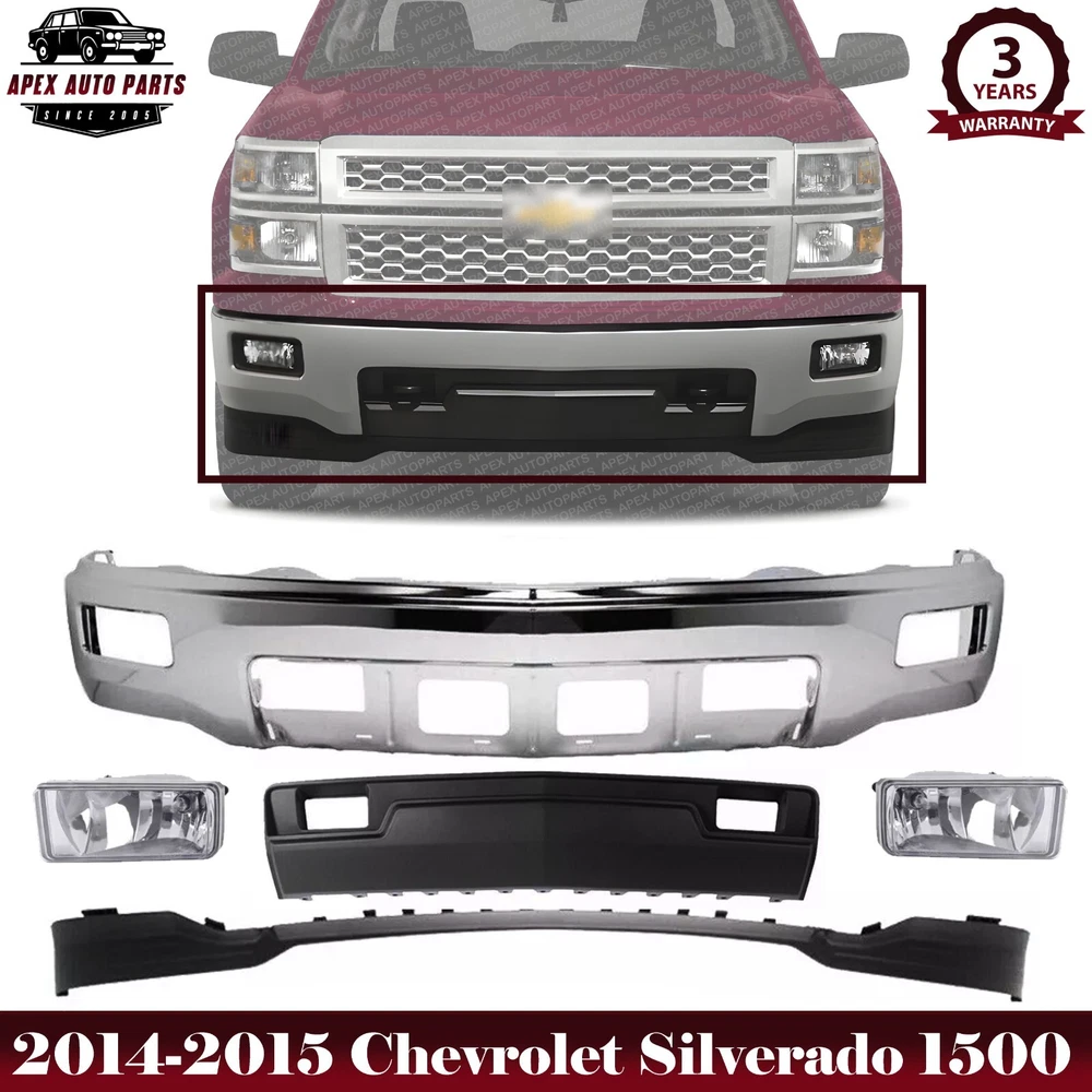 eBay Welcome to APEX AUTO PARTS Store Home About Us Feedback Add To Favorites New Arrivals Ending Soon Contact Us Front Bumper Chrome & Fog Lights Kit For 2014-2015 Chevrolet Silverado 1500 Product Description WARNING : This product can expose you to chemical which is known to the State of California to cause cancer and birth defects or other reproductive harm. For more information go to www.P65Warnings.ca.gov. Specifics and Features : Quantity Sold : Set of 5 Product Fit : Direct Fit Recommended Use : OE Replacement Replaces OE Number : CS1415 Replaces Parts link Number : CS1415 Includes : 1 x Front Bumper Face Bar Chrome 1 x Front Lower valance Textured Black 1 x Front Bumper Lower Piece Trim 1 x Front Bumper Fog Light Left Driver Side 1 x Front Bumper Fog Light Right Pessenger Side Notes : Compatible with : 2014-2015 Silverado 1500 Shipping Payment Returns Terms & Conditions Feedback Contact Us DOMESTIC LOWER 48 US STATES: FREE SALES TAX: CA ONLY VERY IMPORTANT: Double check shipping address. We are not responsible for incorrect or undeliverable addresses. Please use Shipping & Payments tab on top of page for shipping details for your location. Shipping to PR, HI, AK and PO Box addresses will be charged the same as shipping to Canada. GU, VI, SAIPAN will be charged the same as international shipping rate. For Canada shipping please select the lowest price. We do not offer expedited shipping. US Territories such as GU, VI, SAIPAN will be charged the same as CANADA shipping rate. Transaction will be held until a full shipping amount received. Some of the packages cannot be delivered to a PO Box. Customer is responsible to ensure PO Box address given is deliverable by the shipping company. Package will be held until a valid physical address is provided. Customer assumes shipping charges incurred in shipping to undeliverable address. International buyers are responsible for all customs duties, taxes, and other applicable fees incurred by the country's customs/border regulations. Please contact customs for more information. We ship 98% of all orders the same or next business day after payment received/cleared. Please understand that once orders are shipped, we cannot control the transit times thereafter. Most orders will ship via USPS First Class/Priority Mail or FedEx/UPS or the best suitable carrier for the specific size of the product. We are not responsible for any changes to address after item has been shipped. Item will be shipped out within 24-48 hours after payment cleared, except for weekends and holidays. PayPal e-check takes 3-7 business days to be processed. We will not ship until an e-check has been cleared. We do not accept returns. However, if there is an issue with your package, please contact us within 5 days of delivery. If we are not contacted within this period, we will be unable to process any claims. For emissions related items, please check with your local jurisdiction for emission specific requirements before purchasing. All items do not come with installation instruction unless otherwise specified. If item is questionable, please consult your local professional/mechanic before making purchase. Shipping DOMESTIC LOWER 48 US STATES: FREE SALES TAX: CA ONLY VERY IMPORTANT: Double check shipping address. We are not responsible for incorrect or undeliverable addresses. Please use Shipping & Payments tab on top of page for shipping details for your location. Shipping to PR, HI, AK and PO Box addresses will be charged the same as shipping to Canada. GU, VI, SAIPAN will be charged the same as international shipping rate. For Canada shipping please select the lowest price. We do not offer expedited shipping. US Territories such as GU, VI, SAIPAN will be charged the same as CANADA shipping rate. Transaction will be held until a full shipping amount received. Some of the packages cannot be delivered to a PO Box. Customer is responsible to ensure PO Box address given is deliverable by the shipping company. Package will be held until a valid physical address is provided. Customer assumes shipping charges incurred in shipping to undeliverable address. International buyers are responsible for all customs duties, taxes, and other applicable fees incurred by the country's customs/border regulations. Please contact customs for more information. We ship 98% of all orders the same or next business day after payment received/cleared. Please understand that once orders are shipped, we cannot control the transit times thereafter. Most orders will ship via USPS First Class/Priority Mail or FedEx/UPS or the best suitable carrier for the specific size of the product. We are not responsible for any changes to address after item has been shipped. Payment Item will be shipped out within 24 hours after payment cleared, except for weekends and holidays. PayPal e-check takes 3-7 business days to be processed. We will not ship until an e-check has been cleared. Returns 30 Days money back, please notify us within 30 days after you've received your purchased item. All return requests must be submitted through your eBay account. You have to obtain a RMA (Return Merchandise Authorization) number from us, and have the RMA number written on the return package. Buyers pay for return shipping fee. Items to be returned must be in resalable condition. All returns are for refund ONLY. No exchange accepted. Returns for refund are subject to a 20% restocking fee. Terms & Conditions For emissions related items, please check with your local jurisdiction for emission specific requirements before purchasing. All items do not come with installation instruction unless otherwise specified. If item is questionable, please consult your local professional/mechanic before making purchase. Feedback Contact Us Store Home About Us Feedback Add To Favorites New Arrivals Ending Soon Contact Us Need Help? Contact Us on eBay Subscribe to our Newsletter Subscribe Payment Options Copyright © 2024 Apex Auto Parts . All rights res