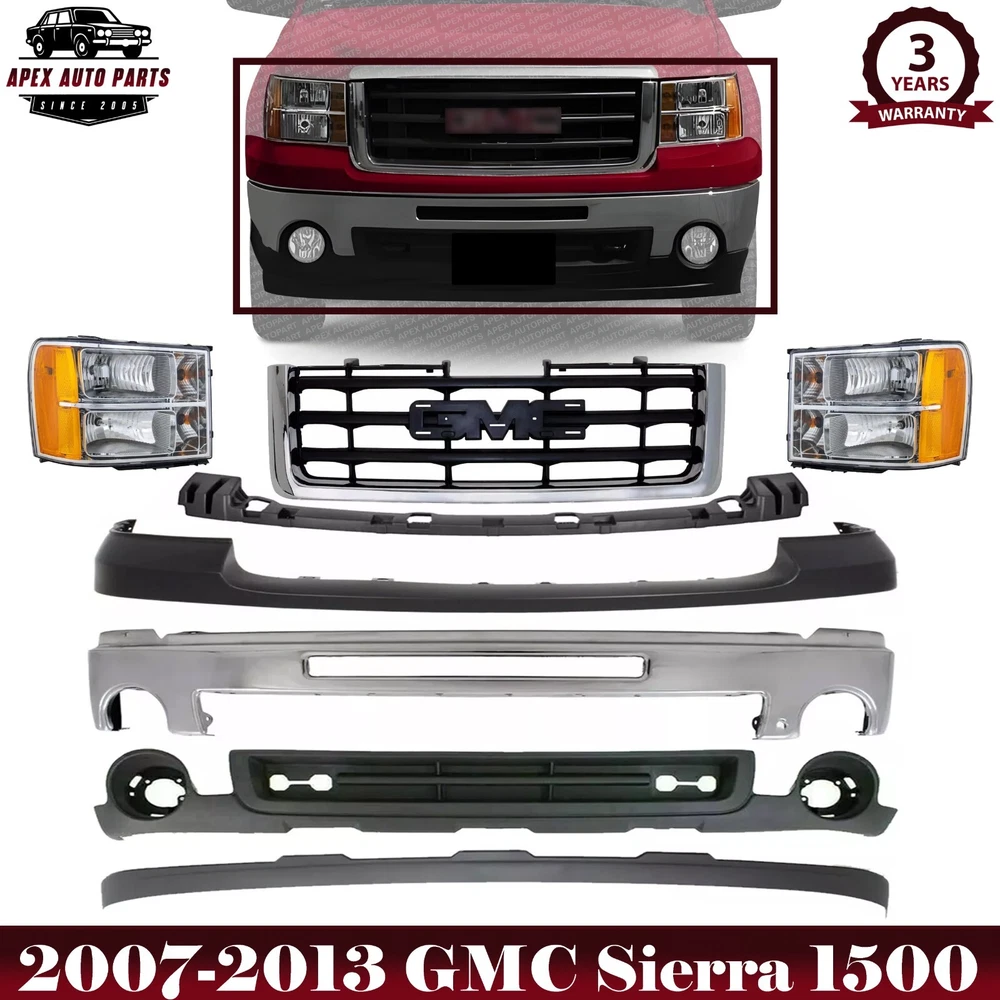 eBay Welcome to APEX AUTO PARTS Store Home About Us Feedback Add To Favorites New Arrivals Ending Soon Contact Us Front Bumper Chrome + Upper Cover Primed + Lower Valance Air Deflector + Extension Textured + Grille Shell & Insert + Headlights Assembly Halogen Left Driver & Right Passenger Side For 2007-2013 GMC Sierra 1500 Product Description WARNING : This product can expose you to chemical which is known to the State of California to cause cancer and birth defects or other reproductive harm. For more information go to www.P65Warnings.ca.gov. Specifics and Features : Quantity Sold : Set of 8 Product Fit : Direct Fit Recommended Use : OE Replacement Replaces OE Number : 15131299 15917769 20980241 22853030 22761792 25783584 15902856 15246822 Replaces Parts link Number : GM1014102 GM1200573 GM1002834 GM1015100 GM1065108 GM1092211 GM2502283 GM2503283 Includes : 1 x Front Grille Assembly Chrome Shell & Painted Black Insert 1 x Front Bumper Cover Bracket Center 1 x Front Bumper Upper Cover Primed 1 x Front Bumper Face Bar Chrome Steel with Fog Lights & Air Holes 1 x Front Bumper Lower Valance Air Deflector Textured 1 x Front Bumper Lower Valance Deflector Extension Textured 1 x Front Headlight Assembly Halogen Left Driver Side 1 x Front Headlight Assembly Halogen Right Passenger Side Notes : Compatible with : 2007-2009 GMC Sierra 1500 SLE 8 Cyl 6.0L 2007-2009 GMC Sierra 1500 SLT 8 Cyl 6.0L 2007-2013 GMC Sierra 1500 SLE 8 Cyl 5.3L 2007-2013 GMC Sierra 1500 SLE 8 Cyl 4.8L 2007-2013 GMC Sierra 1500 SLT 8 Cyl 5.3L 2007-2013 GMC Sierra 1500 WT 8 Cyl 4.8L 2007-2013 GMC Sierra 1500 WT 8 Cyl 5.3L 2007-2013 GMC Sierra 1500 WT 6 Cyl 4.3L 2008-2013 GMC Sierra 1500 SL 8 Cyl 4.8L 2009-2012 GMC Sierra 1500 Hybrid 8 Cyl 6.0L 2009-2013 GMC Sierra 1500 SLT 8 Cyl 6.2L 2010-2013 GMC Sierra 1500 SL 8 Cyl 5.3L 2010-2013 GMC Sierra 1500 SLE 8 Cyl 6.2L Shipping Payment Returns Terms & Conditions Feedback Contact Us DOMESTIC LOWER 48 US STATES: FREE SALES TAX: CA ONLY VERY IMPORTANT: Double check shipping address. We are not responsible for incorrect or undeliverable addresses. Please use Shipping & Payments tab on top of page for shipping details for your location. Shipping to PR, HI, AK and PO Box addresses will be charged the same as shipping to Canada. GU, VI, SAIPAN will be charged the same as international shipping rate. For Canada shipping please select the lowest price. We do not offer expedited shipping. US Territories such as GU, VI, SAIPAN will be charged the same as CANADA shipping rate. Transaction will be held until a full shipping amount received. Some of the packages cannot be delivered to a PO Box. Customer is responsible to ensure PO Box address given is deliverable by the shipping company. Package will be held until a valid physical address is provided. Customer assumes shipping charges incurred in shipping to undeliverable address. International buyers are responsible for all customs duties, taxes, and other applicable fees incurred by the country's customs/border regulations. Please contact customs for more information. We ship 98% of all orders the same or next business day after payment received/cleared. Please understand that once orders are shipped, we cannot control the transit times thereafter. Most orders will ship via USPS First Class/Priority Mail or FedEx/UPS or the best suitable carrier for the specific size of the product. We are not responsible for any changes to address after item has been shipped. Item will be shipped out within 24-48 hours after payment cleared, except for weekends and holidays. PayPal e-check takes 3-7 business days to be processed. We will not ship until an e-check has been cleared. We do not accept returns. However, if there is an issue with your package, please contact us within 5 days of delivery. If we are not contacted within this period, we will be unable to process any claims. For emissions related items, please check with your local jurisdiction for emission specific requirements before purchasing. All items do not come with installation instruction unless otherwise specified. If item is questionable, please consult your local professional/mechanic before making purchase. Shipping DOMESTIC LOWER 48 US STATES: FREE SALES TAX: CA ONLY VERY IMPORTANT: Double check shipping address. We are not responsible for incorrect or undeliverable addresses. Please use Shipping & Payments tab on top of page for shipping details for your location. Shipping to PR, HI, AK and PO Box addresses will be charged the same as shipping to Canada. GU, VI, SAIPAN will be charged the same as international shipping rate. For Canada shipping please select the lowest price. We do not offer expedited shipping. US Territories such as GU, VI, SAIPAN will be charged the same as CANADA shipping rate. Transaction will be held until a full shipping amount received. Some of the packages cannot be delivered to a PO Box. Customer is responsible to ensure PO Box address given is deliverable by the shipping company. Package will be held until a valid physical address is provided. Customer assumes shipping charges incurred in shipping to undeliverable address. International buyers are responsible for all customs duties, taxes, and other applicable fees incurred by the country's customs/border regulations. Please contact customs for more information. We ship 98% of all orders the same or next business day after payment received/cleared. Please understand that once orders are shipped, we cannot control the transit times thereafter. Most orders will ship via USPS First Class/Priority Mail or FedEx/UPS or the best suitable carrier for the specific size of the product. We are not responsible for any changes to address after item has been shipped. Payment Item will be shipped out within 24 hours after payment cleared, except for weekends and holidays. PayPal e-check takes 3-7 business days to be processed. We will not ship until an e-check has been cleared. Returns 30 Days money back, please notify us w