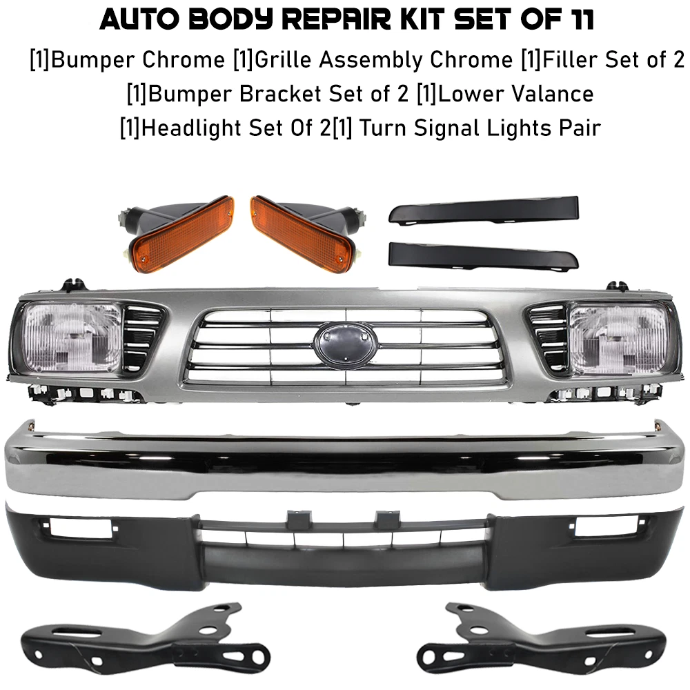 Hype_Turbo Free Shipping & Returns 3-4 days Shipping 30 Days Money Back 100% Satisfaction Front Bumper Chrome Steel & Headlight Assembly Kit For 1995-1997 Toyota Tacoma REPLACEMENT BUMPER KIT Manufactured from top quality components, this is your best option and inexpensive replacement for your rebuild, repair, and maintenance needs - an OE replacement product for your damaged or aged factory part. Replacement - the most affordable brand name for replacement parts that you need! Replacement is a professional brand for autobody, lighting parts, electrical, brake, suspension, intake and exhaust, and cooling and heating products. All Replacement brands include 2-year, unlimited-mileage warranty. NOTES Location : Front & Lower Brand New in the Box - Fit and Quality Guaranteed! Material Plastic, Steel Anticipated Ship Out Time 1-4 business day Quantity Sold Auto Body Repair Kit Set Of 11 Product Fit Direct Fit Replaces OE Number AF703 Color/Finish Black / Chrome Recommended Use OE Replacement Replaces Partslink Number AF703 Vehicle Body Type 2-Door Components [1]Bumper Chrome [1]Grille Assembly Chrome [1]Filler Set of 2 [1]Bumper Bracket Set of 2 [1]Lower Valance [1]Headlight Set Of 2[1] Turn Signal Lights Pair Prop 65 Warning WARNING: This product can expose you to chemical which is known to the State of California to cause cancer and birth defects or other reproductive harm. For more information go to www.P65Warnings.ca.gov. Shipping Notes We have multiple warehouses in US and will choose the nearest one for shipping according to your address and our inventory. Toyota : 1995-1997 Tacoma Base Fleetside, Four Wheel Drive 1995-1997 Tacoma DLX Fleetside, Four Wheel Drive 1995-1997 Tacoma SR5 Extended Cab Pickup, Four Wheel Drive