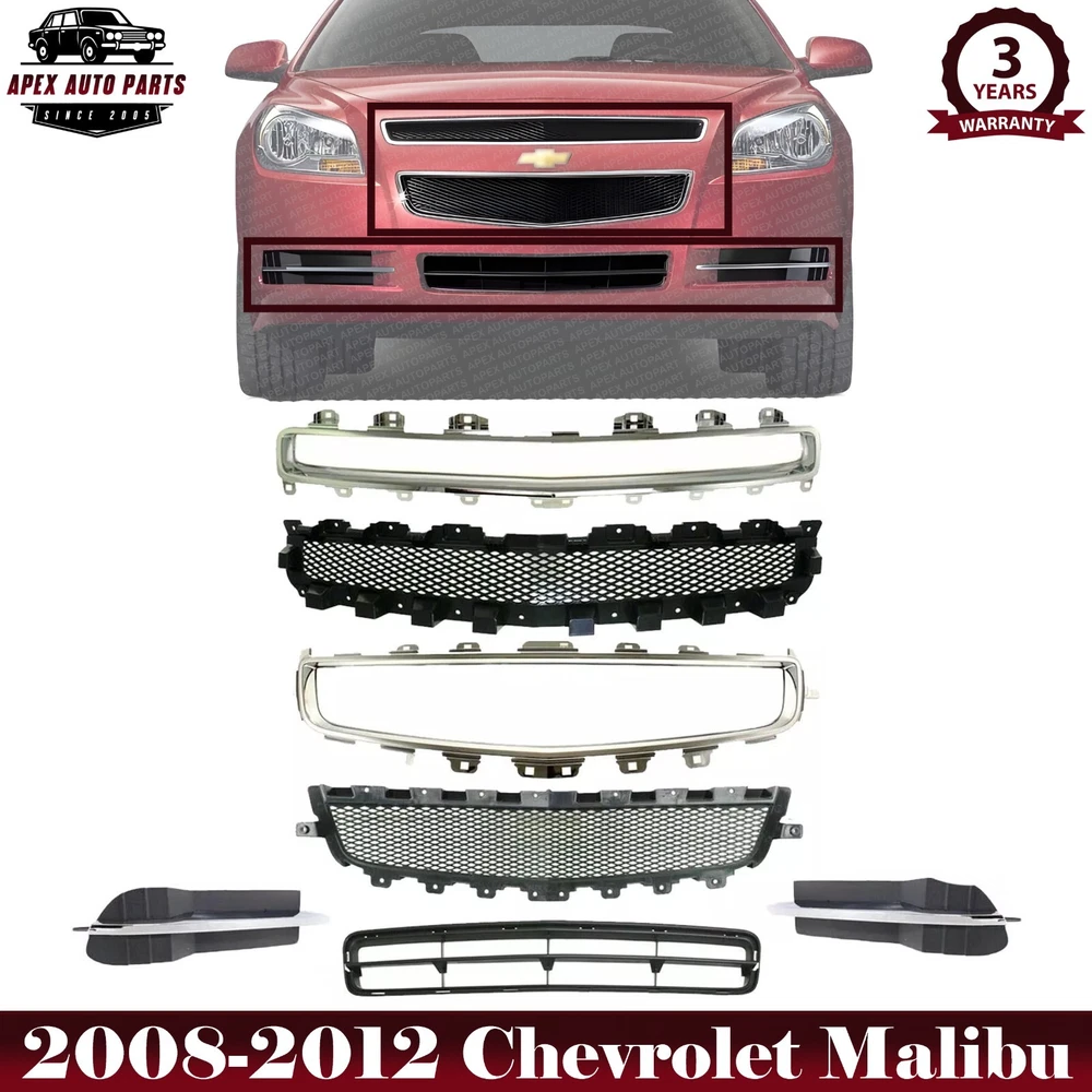 eBay Welcome to APEX AUTO PARTS Store Home About Us Feedback Add To Favorites New Arrivals Ending Soon Contact Us Front Bumper Grille Kit + Chrome Moldings + Fog Light Covers Right Passenger & Left Driver Side For 2008-2012 Chevrolet Malibu Product Description WARNING : This product can expose you to chemical which is known to the State of California to cause cancer and birth defects or other reproductive harm. For more information go to www.P65Warnings.ca.gov. Specifics and Features : Quantity Sold : Set of 7 Product Fit : Direct Fit Recommended Use : OE Replacement Replaces OE Number : 25784042 15823699 25784043 15823704 25905344 25905343 15823701 Replaces Parts link Number : GM1200600 GM1200601 GM1210115 GM1036119 GM1039114 GM1038114 GM1210114 Includes : 1 x Front Bumper Upper Grille 1 x Front Bumper Center Grille 1 x Front Bumper Upper Grille Chrome Molding 1 x Front Bumper Center Grille Chrome Molding 1 x Front Bumper Lower Grille Textured 1 x Front Fog Light Cover Left Driver Side 1 x Front Fog Light Cover Right Passenger Side Notes : Compatible with : 2008-2010 Chevrolet Malibu Hybrid 4 Cyl 2.4L 2008-2009 Chevrolet Malibu LS 6 Cyl 3.5L 2008-2009 Chevrolet Malibu LS 4 Cyl 2.4L 2008-2012 Chevrolet Malibu LT 6 Cyl 3.6L 2008-2012 Chevrolet Malibu LT 4 Cyl 2.4L 2009 Chevrolet Malibu LT 6 Cyl 3.5L Shipping Payment Returns Terms & Conditions Feedback Contact Us DOMESTIC LOWER 48 US STATES: FREE SALES TAX: CA ONLY VERY IMPORTANT: Double check shipping address. We are not responsible for incorrect or undeliverable addresses. Please use Shipping & Payments tab on top of page for shipping details for your location. Shipping to PR, HI, AK and PO Box addresses will be charged the same as shipping to Canada. GU, VI, SAIPAN will be charged the same as international shipping rate. For Canada shipping please select the lowest price. We do not offer expedited shipping. US Territories such as GU, VI, SAIPAN will be charged the same as CANADA shipping rate. Transaction will be held until a full shipping amount received. Some of the packages cannot be delivered to a PO Box. Customer is responsible to ensure PO Box address given is deliverable by the shipping company. Package will be held until a valid physical address is provided. Customer assumes shipping charges incurred in shipping to undeliverable address. International buyers are responsible for all customs duties, taxes, and other applicable fees incurred by the country's customs/border regulations. Please contact customs for more information. We ship 98% of all orders the same or next business day after payment received/cleared. Please understand that once orders are shipped, we cannot control the transit times thereafter. Most orders will ship via USPS First Class/Priority Mail or FedEx/UPS or the best suitable carrier for the specific size of the product. We are not responsible for any changes to address after item has been shipped. Item will be shipped out within 24-48 hours after payment cleared, except for weekends and holidays. PayPal e-check takes 3-7 business days to be processed. We will not ship until an e-check has been cleared. We do not accept returns. However, if there is an issue with your package, please contact us within 5 days of delivery. If we are not contacted within this period, we will be unable to process any claims. For emissions related items, please check with your local jurisdiction for emission specific requirements before purchasing. All items do not come with installation instruction unless otherwise specified. If item is questionable, please consult your local professional/mechanic before making purchase. Shipping DOMESTIC LOWER 48 US STATES: FREE SALES TAX: CA ONLY VERY IMPORTANT: Double check shipping address. We are not responsible for incorrect or undeliverable addresses. Please use Shipping & Payments tab on top of page for shipping details for your location. Shipping to PR, HI, AK and PO Box addresses will be charged the same as shipping to Canada. GU, VI, SAIPAN will be charged the same as international shipping rate. For Canada shipping please select the lowest price. We do not offer expedited shipping. US Territories such as GU, VI, SAIPAN will be charged the same as CANADA shipping rate. Transaction will be held until a full shipping amount received. Some of the packages cannot be delivered to a PO Box. Customer is responsible to ensure PO Box address given is deliverable by the shipping company. Package will be held until a valid physical address is provided. Customer assumes shipping charges incurred in shipping to undeliverable address. International buyers are responsible for all customs duties, taxes, and other applicable fees incurred by the country's customs/border regulations. Please contact customs for more information. We ship 98% of all orders the same or next business day after payment received/cleared. Please understand that once orders are shipped, we cannot control the transit times thereafter. Most orders will ship via USPS First Class/Priority Mail or FedEx/UPS or the best suitable carrier for the specific size of the product. We are not responsible for any changes to address after item has been shipped. Payment Item will be shipped out within 24 hours after payment cleared, except for weekends and holidays. PayPal e-check takes 3-7 business days to be processed. We will not ship until an e-check has been cleared. Returns 30 Days money back, please notify us within 30 days after you've received your purchased item. All return requests must be submitted through your eBay account. You have to obtain a RMA (Return Merchandise Authorization) number from us, and have the RMA number written on the return package. Buyers pay for return shipping fee. Items to be returned must be in resalable condition. All returns are for refund ONLY. No exchange accepted. Returns for refund are subject to a 20% restocking fee. Terms & Conditions For emissions related items, please check with your local jurisdi
