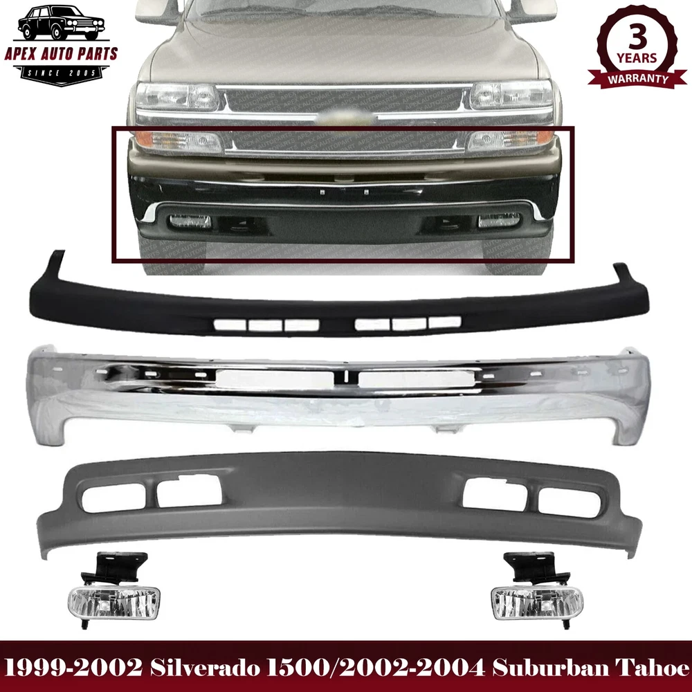 eBay Welcome to APEX AUTO PARTS Store Home About Us Feedback Add To Favorites New Arrivals Ending Soon Contact Us Front Bumper Chrome Steel without Brackets + Upper Filler Textured + Lower Valance Primed with Fog Light Holes + Fog Lamp Left Driver and Right passenger Side For 1999-2002 Chevrolet Silverado 1500 & 2000-2004 Tahoe / Suburban Product Description WARNING : This product can expose you to chemical which is known to the State of California to cause cancer and birth defects or other reproductive harm. For more information go to www.P65Warnings.ca.gov. Specifics and Features : Quantity Sold : Set of 5 Product Fit : Direct Fit Recommended Use : OE Replacement Replaces OE Number : 12336026 15050703 15005294 10368477 10368476 Replaces Parts link Number : GM1002376 GM1051103 GM1092167 GM2593113 GM2592113 Includes : 1 x Front Bumper Chrome Steel Without Bracket 1 x Front Bumper Molding Upper Cover Black 1 x Front Lower Valance Air Deflector Primed With Fog Light and Tow Hook Holes 1 x Front Fog Lamp Assembly With Bracket Left Driver Side 1 x Front Fog Lamp Assembly With Bracket Right Passenger Side Notes : Compatible with : 1999-2002 Chevrolet Silverado 1500 Base 8 Cyl 4.8L 1999-2002 Chevrolet Silverado 1500 Base 8 Cyl 5.3L 1999-2002 Chevrolet Silverado 1500 Base 6 Cyl 4.3L 1999-2002 Chevrolet Silverado 1500 LS 8 Cyl 4.8L 1999-2002 Chevrolet Silverado 1500 LS 8 Cyl 5.3L 1999-2002 Chevrolet Silverado 1500 LS 6 Cyl 4.3L 1999-2002 Chevrolet Silverado 1500 LT 8 Cyl 4.8L 1999-2002 Chevrolet Silverado 1500 LT 8 Cyl 5.3L 1999-2002 Chevrolet Silverado 1500 LT 6 Cyl 4.3L 2000 Chevrolet Tahoe Limited 8 Cyl 5.7L 2000 Chevrolet Tahoe Z71 8 Cyl 5.7L 2000-2001 Chevrolet Suburban 1500 Base 8 Cyl 5.3L 2000-2001 Chevrolet Tahoe Base 8 Cyl 5.3L 2000-2001 Chevrolet Tahoe Base 8 Cyl 4.8L 2000-2004 Chevrolet Suburban 1500 LS 8 Cyl 5.3L 2000-2004 Chevrolet Suburban 1500 LT 8 Cyl 5.3L 2000-2004 Chevrolet Tahoe LS 8 Cyl 4.8L 2000-2004 Chevrolet Tahoe LS 8 Cyl 5.3L 2000-2004 Chevrolet Tahoe LT 8 Cyl 4.8L 2000-2004 Chevrolet Tahoe LT 8 Cyl 5.3L 2002 Chevrolet Silverado 1500 WT 8 Cyl 4.8L 2002 Chevrolet Silverado 1500 WT 8 Cyl 5.3L 2002 Chevrolet Silverado 1500 WT 6 Cyl 4.3L 2003-2004 Chevrolet Tahoe Z71 8 Cyl 5.3L 2003-2004 Chevrolet Tahoe Z71 8 Cyl 4.8L 2004 Chevrolet Suburban 1500 Z71 8 Cyl 5.3L Shipping Payment Returns Terms & Conditions Feedback Contact Us DOMESTIC LOWER 48 US STATES: FREE SALES TAX: CA ONLY VERY IMPORTANT: Double check shipping address. We are not responsible for incorrect or undeliverable addresses. Please use Shipping & Payments tab on top of page for shipping details for your location. Shipping to PR, HI, AK and PO Box addresses will be charged the same as shipping to Canada. GU, VI, SAIPAN will be charged the same as international shipping rate. For Canada shipping please select the lowest price. We do not offer expedited shipping. US Territories such as GU, VI, SAIPAN will be charged the same as CANADA shipping rate. Transaction will be held until a full shipping amount received. Some of the packages cannot be delivered to a PO Box. Customer is responsible to ensure PO Box address given is deliverable by the shipping company. Package will be held until a valid physical address is provided. Customer assumes shipping charges incurred in shipping to undeliverable address. International buyers are responsible for all customs duties, taxes, and other applicable fees incurred by the country's customs/border regulations. Please contact customs for more information. We ship 98% of all orders the same or next business day after payment received/cleared. Please understand that once orders are shipped, we cannot control the transit times thereafter. Most orders will ship via USPS First Class/Priority Mail or FedEx/UPS or the best suitable carrier for the specific size of the product. We are not responsible for any changes to address after item has been shipped. Item will be shipped out within 24-48 hours after payment cleared, except for weekends and holidays. PayPal e-check takes 3-7 business days to be processed. We will not ship until an e-check has been cleared. We do not accept returns. However, if there is an issue with your package, please contact us within 5 days of delivery. If we are not contacted within this period, we will be unable to process any claims. For emissions related items, please check with your local jurisdiction for emission specific requirements before purchasing. All items do not come with installation instruction unless otherwise specified. If item is questionable, please consult your local professional/mechanic before making purchase. Shipping DOMESTIC LOWER 48 US STATES: FREE SALES TAX: CA ONLY VERY IMPORTANT: Double check shipping address. We are not responsible for incorrect or undeliverable addresses. Please use Shipping & Payments tab on top of page for shipping details for your location. Shipping to PR, HI, AK and PO Box addresses will be charged the same as shipping to Canada. GU, VI, SAIPAN will be charged the same as international shipping rate. For Canada shipping please select the lowest price. We do not offer expedited shipping. US Territories such as GU, VI, SAIPAN will be charged the same as CANADA shipping rate. Transaction will be held until a full shipping amount received. Some of the packages cannot be delivered to a PO Box. Customer is responsible to ensure PO Box address given is deliverable by the shipping company. Package will be held until a valid physical address is provided. Customer assumes shipping charges incurred in shipping to undeliverable address. International buyers are responsible for all customs duties, taxes, and other applicable fees incurred by the country's customs/border regulations. Please contact customs for more information. We ship 98% of all orders the same or next business day after payment received/cleared. Please understand that once orders are shipped, we cannot control the transit times thereafter. Most orders will s