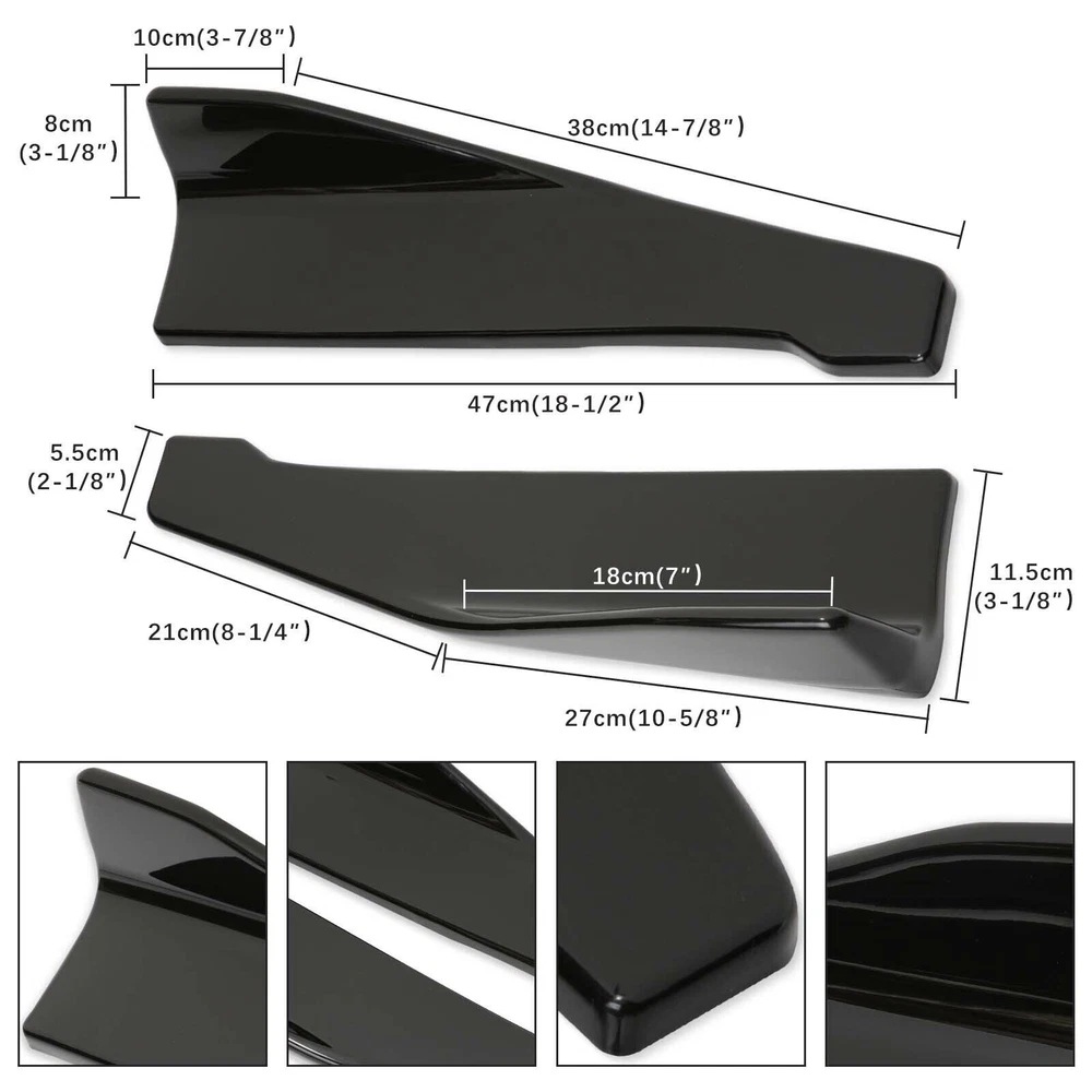 Package 1. Front Bumper Lip Spoiler Splitter(5pcs) This front bumper lip splitter is fit for most models with front bumper size around 1750mm~1950mm. Feature: -Direct Fit. -Easy install and durable use. -Great quality and great Fitment. -Correct Connector No cutting or splicing. -Strict quality control standards to Build and test. -It'll give you a sporty look without making it too aggressive. -Light in weight and enduring, different optical line comes from different points of view. *Instruction Not Included, Professional Installation Is Highly Recommended.* Specification: -Type:Front Lip Chin Bumper Body Kit -Material:ABS -Color: Glossy Black +Red (as pictures show) -Placement on Vehicle:Front;;Lower -Fitment Type:Performance/Custom This front bumper lip body kit is suitable for most small cars and simple. And the flanks on both sides can be adjusted to make it more suitable for the width of the front of your car. Package 2. 2 x 86.6" Side Skirt Extension ( 6pcs ) Specification: Condition: 100% Brand New and High Quality Type: Car Body Side Skirts Material: Made of high quality PP plastic, Durable Color: Glossy Black +Red (as pictures show) Surface Finish: Carbon Fiber Style Side Skirt Length: 86.6in / 2.2M Position: Side Skirt Extension Features: Universal modified side skirt for car sedan. While the side skirts don't affect the front ground clearance too much, it enhances the side extension of the in a very pure and exciting way. A Perfect Aftermarket Replacement. Professional Installation Is Highly Recommended. Package Included 3 Rear Lip Specification: Condition: 100% Brand New and High Quality Type: Car Body Rear Lip Material: Made of high quality PP plastic, Durable Color: Glossy Black (as pictures show) Surface Finish: Glossy Black Style Rear Lip Size:48cm/19“ Placement on Vehicle: Left, Right Package Included 4 2pcs Splitter Rods Material: premium quality aluminum alloy The length can be adjustable from 8" to 11" Fitment: Universal Note: Require drilling holes into the bumper lip diffuser to attach safely to the vehicle. Package Includes: 4 pcs /set Front Lip Chin Bumper Body Kits 2 x Side Skirts 2 x Rear Lip 2 X Splitter Strut Rods 1 x Screws kit Note: Installation instruction is not included, professional installation is recommended. Please allow 1-3CM differs due to manual measurement. Due to the different display and different light, the picture may not reflect the actual color of the item. Thanks for your understanding.