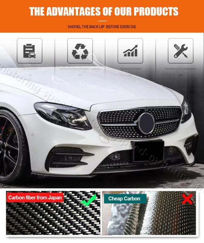 Feature: 1.for Mercedes-Benz E-Class W213 E200 E300 E43 Sport Sedan 4-Door 17-18(Fits: Sport Bumper only) 2.Free glue tape & self tapping screws included,Excellent fitment 3.Add downforce,detach airflow ,enhance stability ,reduce fuel consumption 4.Multilayer protected export carton,shockproof & crashproof Feature: 1.for Mercedes-Benz E-Class W213 E200 E300 E43 Sport Sedan 4-Door 17-18(Fits: Sport Bumper only) 2.Free glue tape & self tapping screws included,Excellent fitment 3.Add downforce,detach airflow ,enhance stability ,reduce fuel consumption 4.Multilayer protected export carton,shockproof & crashproof Specification: Color:Black Material:Carbon Fiber Process: Vacuum molding Pattern:3X3 twill weaven Installation:glue tape & screws included G.W:3KG Product Size:112*15*5CM 55*15*3.5CM 55*15*3.5CM Packing Size:132*50*25 CM Packaging: export carton Package including: 1 Series Of Car front Lip About Payment and tax About Return policy About shipping and tax About us Contact us About Payment and tax 1. We ship to your eBay address.Please make sure your eBay address is correct before you pay. 2. Multiple Payment Methods Available: Credit Card, Debit Card, Gift Card, Apple Pay, Goggle Pay, PayPal and PayPal Credit 3.Your must complete the payment within 8 days or Ebay will automatically open unpaid item case For US Buyer: The invoice value of each item is less than 800USD ,so you no need to pay any tariff . NON-US Buyer Note: Most countries are tax free based on our invoices, if tax is required, which will be buyer's responsibility. About Return policy 1.Customer satisfaction is our top goal. We believe our items are so outstanding. All products are quality checked. They are new and in good condition when shipped to our customers. We are convinced you will be happy with your Purchase. 2.If product is defective or damage upon arrival, or wrong product shipped, please contact us immediately. 3.Please contact us first if you have any problems/questions/concerns. We will be happy to resolve any issues you may have in a cordial and friendly manner. 4.We offer refund or exchange within 30 days after buyer received damaged, incorrect or defective item. Please always contact us to resolve any problems, we will do our best to satisfy you. Thanks very much. About shipping and tax The shipping fee is only for the mainland of each country,it does not include the overseas territories,such as Virgin Islands (U.S.) , Puerto Rico, French Reunion Island, etc.But on ebay,when buyers from Puerto Rico, the shipping fee is equal to United States, it is NOT correct,please contact us for correct shipping fee, or we will cancel the order.Sorry for the inconvenience,and thanks for your cooperation. 1. Please contact us if we have not specified the shipping fee to your country. 2. If you want to upgrade the shipping,please contact us before making payment,we will revise the shipping fee. 3.Import duties, taxes and charges are not included in the item price or shipping charges. These charges are the buyer's responsibility. Please check with your local customs to determine what these additional costs will be prior to bidding/buying. Please track your parcel constantly, once customs issue arise, please contact with your local customs in time to avoid returning. 4.Package will be shipped from China, usually it will be delivered in 3-15 business days to most countries. About us 1.Powerful professional factory to ensure to provide best quality Products. We are specilized in designing,developing and producing carbon fiber,PU,FRP car body parts, and interior and exterior trims for Germany & American & luxury super cars. 2.We sell them directly to ensure give you best price at best quality.We have distributors from all over the world,Europe,US,Middle East,South Afria etc... 3.Our company is one of the earliest and leading auto parts manufacturer in China,established in 2002. We had more than 15 years of experience in overseas business. We are offering more of material finishing, please refer to the listing title for the correct one: 1.Carbon Fiber, surface glossy finished, 3K twill weave real carbon fiber material. 2.FRP Fiber Glass, Matt Black or Gloss black or grey unpainted semifinished, MUST primed & painted before fitted 3.Matte Carbon Fiber, it is matte finished. 4.ABS, it is plastic and can be installed directly. Contact us 1.We are trying our best to explain all details of the products here! If you have any question, please feel free to contact us by Ebay message, and We will get back to you within 24-48 hours. 2. Customer satisfaction is our NO.1 priority. If you are not happy with the item that you purchase, please contact us first. We will try our best to solve the problem with you. Please leave us a positive feedback if you receive the item. Please do not leave negative or neutral feedback without any contact.If you haven't received item in 30 days, please contact us . We appreciate your business. Happy Bidding & Have a nice day! 3.Working hours: From 8 a.m. to 6 p.m. from Monday to Friday. From 8 a.m. to 12 a.m. on Saturday morning Holiday/ Rest time: Saturday afternoon and Sunday Manufacturer Warranty 1 Year Country/Region of Manufacture China Primary Color Black Carbon Fiber Manufacturer Part Number Does not apply Brand Speed-motoring Finish High polished 3*3 twill carbon fiber Interchange Part Number Air-Dam-Chin-Diffuser, Lower-Lip-Spoiler-Splitter-Valance-Air-Dam-Chin, Front Bumper Lip Splitters Body Kit, Front Chin Lip Add-On Kit Placement on Vehicle Front, Lower Material High Quality Carbon Fiber Type Front Bumper Lip Color Glossy Black Mounting Hardware Included Yes Attachment Type Screw-On, Self-Adhesive Features 3*3 Twill Carbon Weave Surface Finish Smooth UV-Protected Clear Coating Number of Pieces 3pcs/set Attachment Method Screws UPC 6431223274826 Warranty Yes