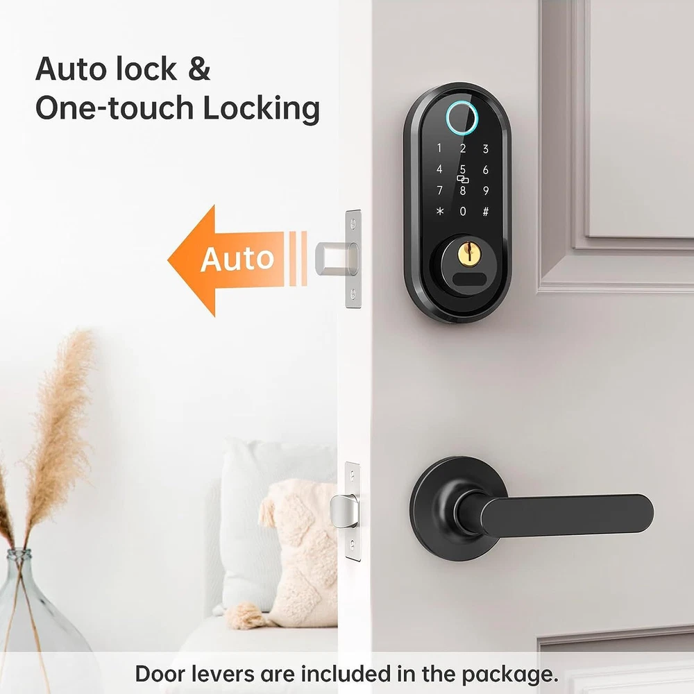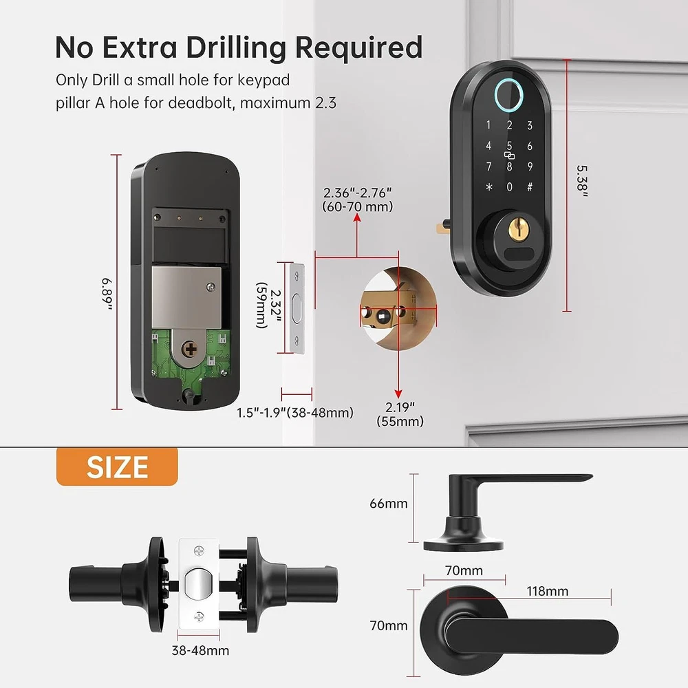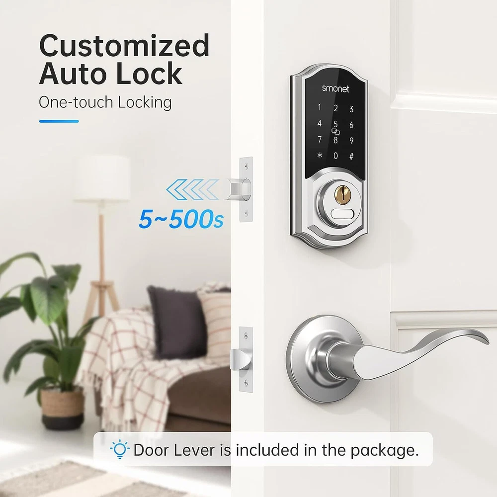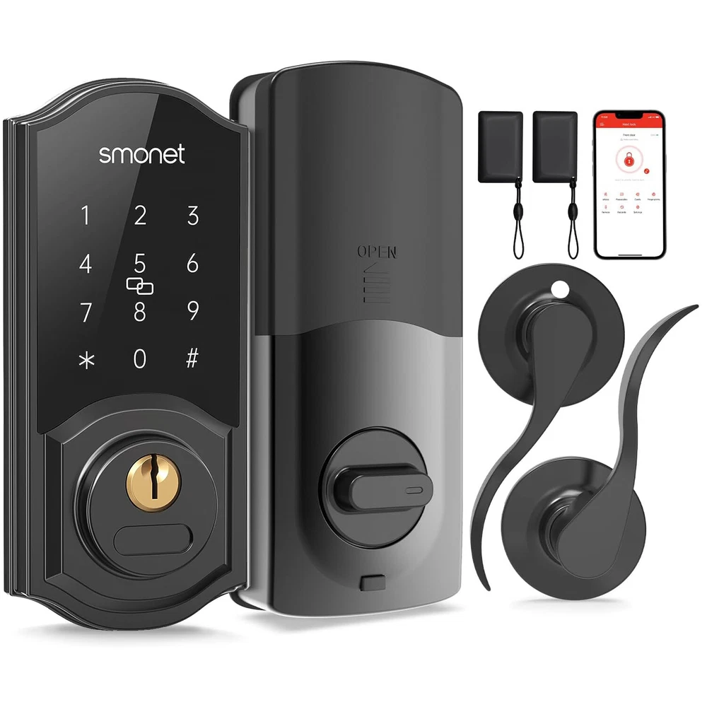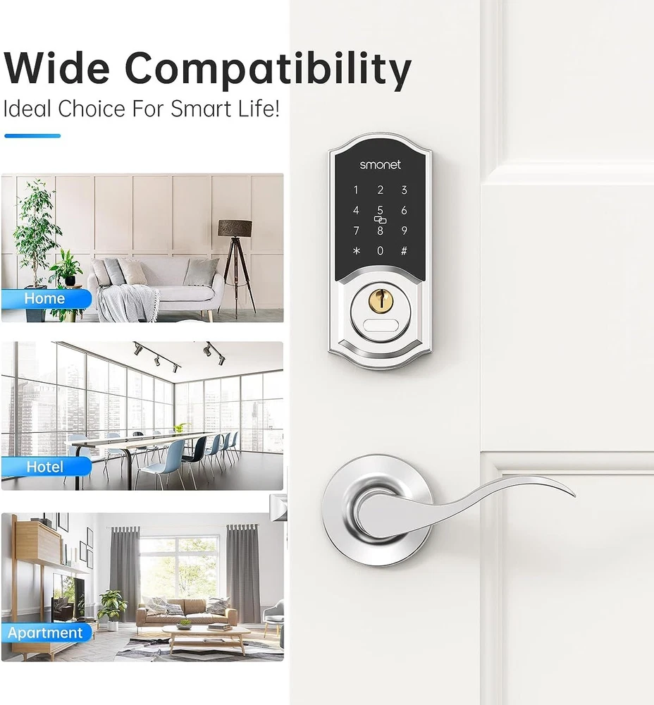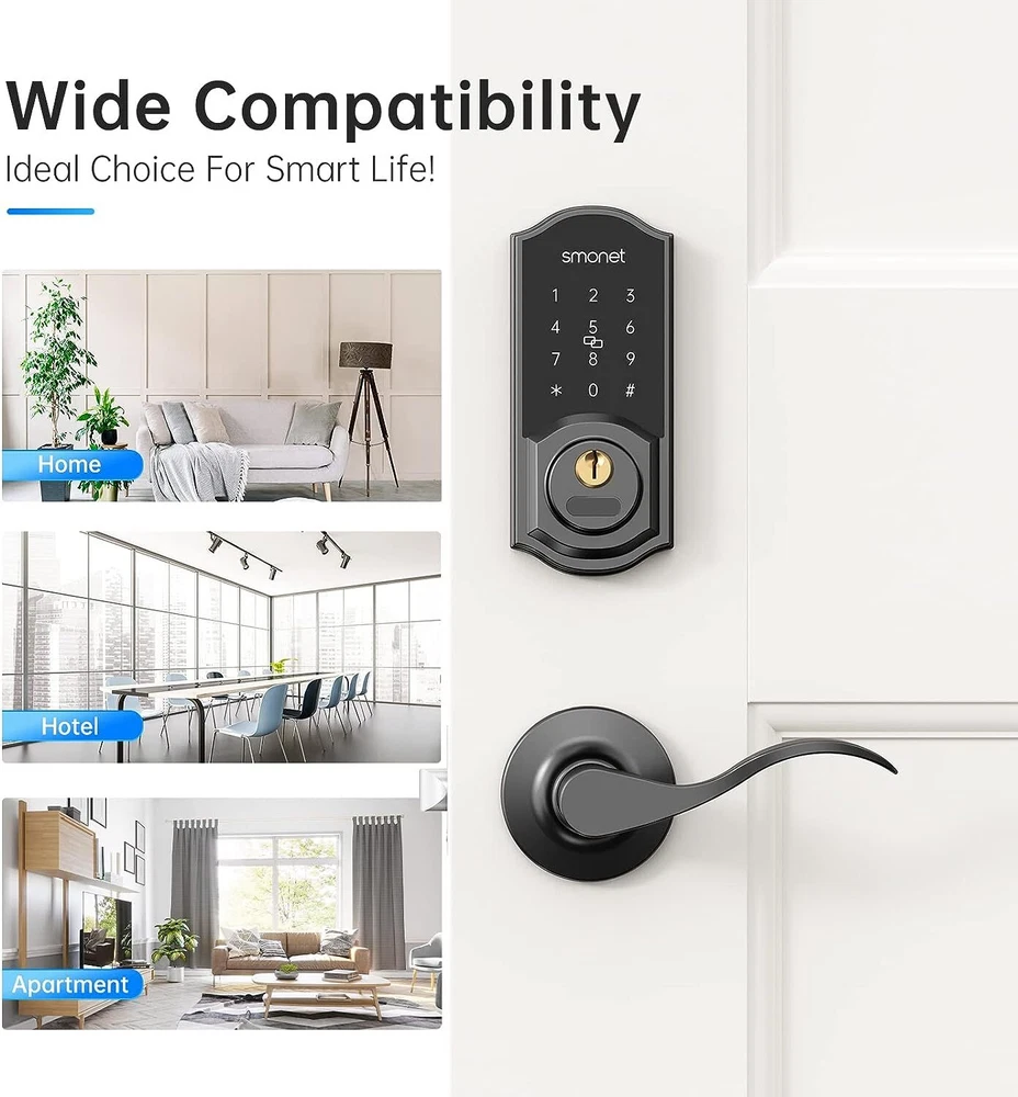 Options with "NO FP " means this model has NO fingerprint function, please kindly notice it About this item: 【 Keyless E ntry 】Front door handle set with 150 password code + 2 spare keys + 3 fobs + 250 fingerprints and bluetooth smartphone control, experience a revolutionary biometric technology with touch and go 360° fingerprint ID. Smart deadbolt supports working with Alexa & Google Home Assistant and remote controlling with your lock if paired with G2 Gateway (Optional, sold separately). 【 Automatic L ock 】With anti peeping function when entering passwords, set up auto lock function for the fingerprint door lock in 1-900 seconds, or long press '#' for manually locking. One-time password for temporary visitors, ekey or permanent code to your family, make it more flexible for children, guests, service people or others who wants to entry. 【 Keypad Door Lock with Hand le 】A digital deadbolt combined with 2 mating lever handles, built-in backlight. Solid alloy body and long battery life, 4pcs AA batteries providing 10,000 openings(approx. 12 months). Adding an equal touch of elegance to both traditional and modern homes, perfect for your smart home. 【 Easy to Ins tall 】Follow the steps and tips showing in the video, replace an existing deadbolt door lock in minutes with just a phillips screwdriver. Compatible with standard wooden, left and right handed doors, great solution for Airbnb rental apartment. Kindly noted that L/R side doors have different install method. 【 Professional Customer Su pport 】We provides at least 1 year warranty and free life-time technical support available to smart lock deadbolt. Any questions(such as installation or App problems or more information about G2 gateway) please feel free to reach out to us. Specifications: Brand: SMONET Model: A1 / M1 / Y1 Color: Black / Silver Material: Alloy Shape: Camelot / Rectangle / Oval Style: Modern Door Direction: Universal / Reversible (Both left & right, inswing & outswing) Connectivity Protocol: Bluetooth Ways to Unlock: Fingerprint / Keypad Passcode / Key Fobs / Physical Keys Control Method: App Phone APP: TT Lock / Next Lock (Totally FREE) Remotely / Voice Control: Alexa or Google Home (WiFi Gateway Needed) Lock Type: Keypad Finish: Painted Controller Type: Hand Control Control Method: Touch Power Supply: 4x AA Battery (NOT Included) IP Rating: IP63 What's in the box: 1x Front Door Lock Keypad 1x Rear Door Lock Panel 2x Knob or Lever Handle (Depends on your choice) 1x Latch 2x Key Fobs (IC Cards) 3x Physical Keys 1x Strike Pad 1x Strike Plate 1x Battery Cover 1x Drilling Template 1x Installation Screws Pack 1x User Manual Auto Lock Experience the convenience and peace of mind with smart deadbolt lock's automatic locking feature. Fingerprint Recognition Advanced fingerprint recognition technology enables the storage of up to 250 sets of fingerprints. Remote Share You have the ability to generate and share a one-time password remotely for guest. Easy to Install No extra drilling required. Can be completely installed by one person with just a Phillips screwdriver Voice Control Embrace the power of voice: Control your lock with effortless ease! (G2 Gateway Required) Widely compatibility to all kinds of weather SMONET Pro keyless entry door lock with handle provides IP63 waterproof and works from -4 °F to 158 °F temperatures. Smooth and stable in all kinds of weather, safeguard your home as always. Long battery life, Type C backup Intuitive touchscreen display, long battery life, up to 12 months of battery life. SMONET Pro front door lock with low battery alert and type C emergency backup, free you from battery worries.