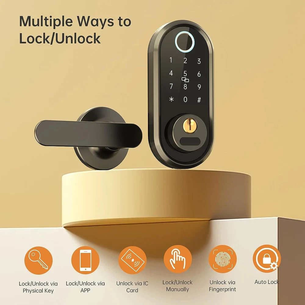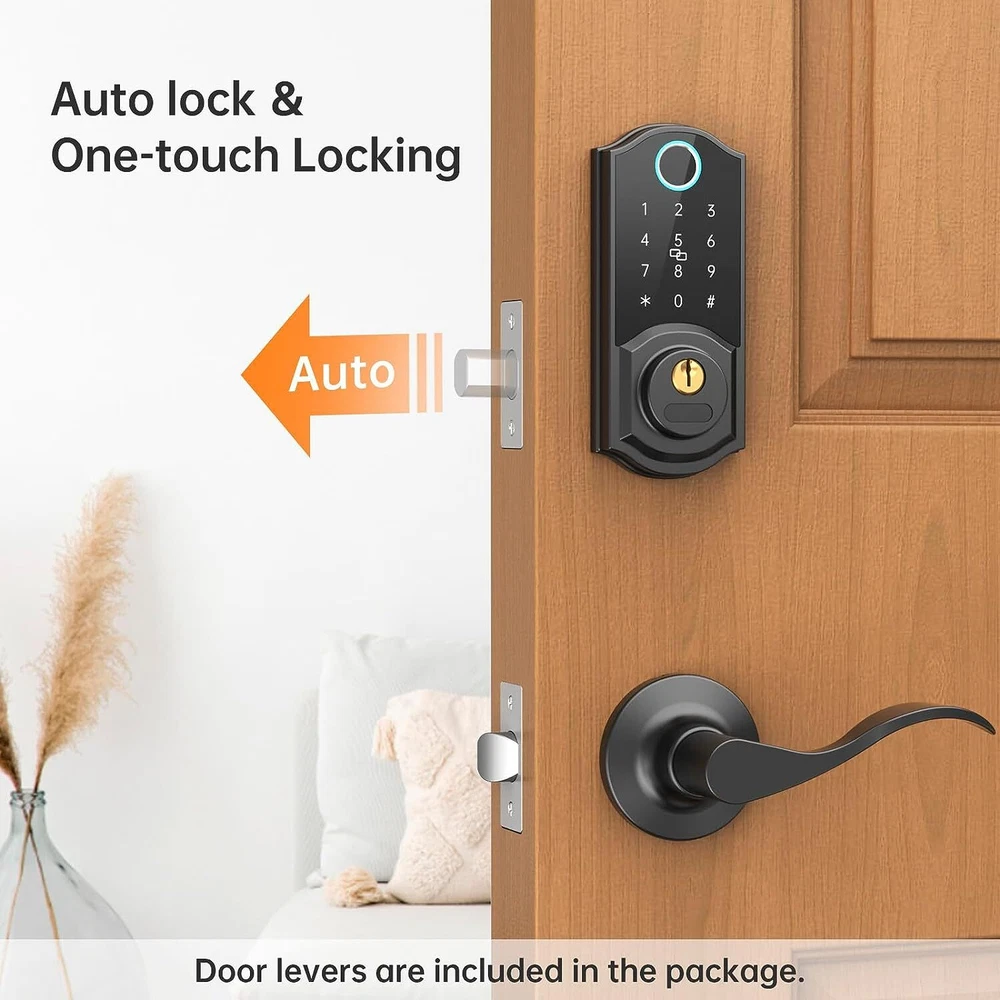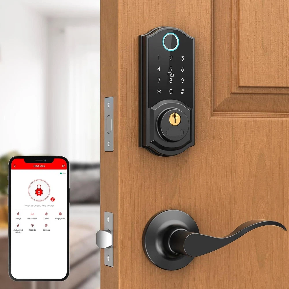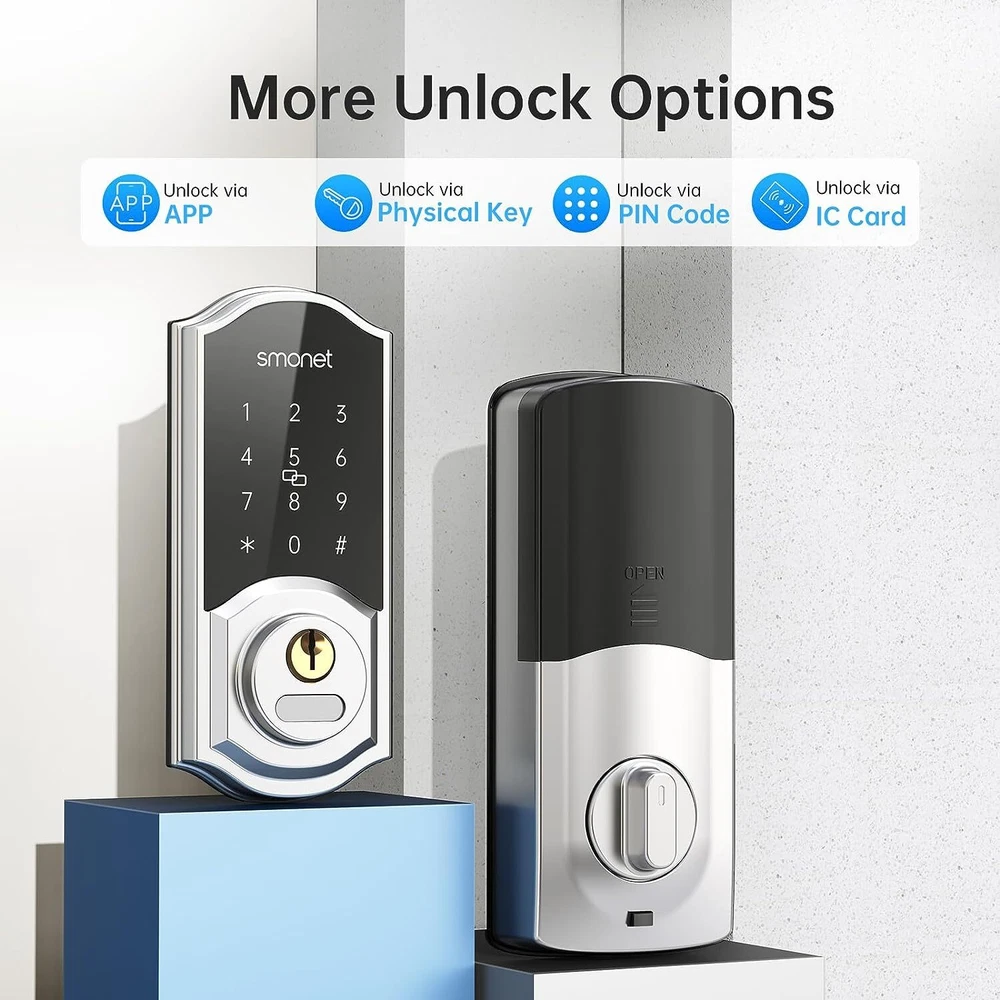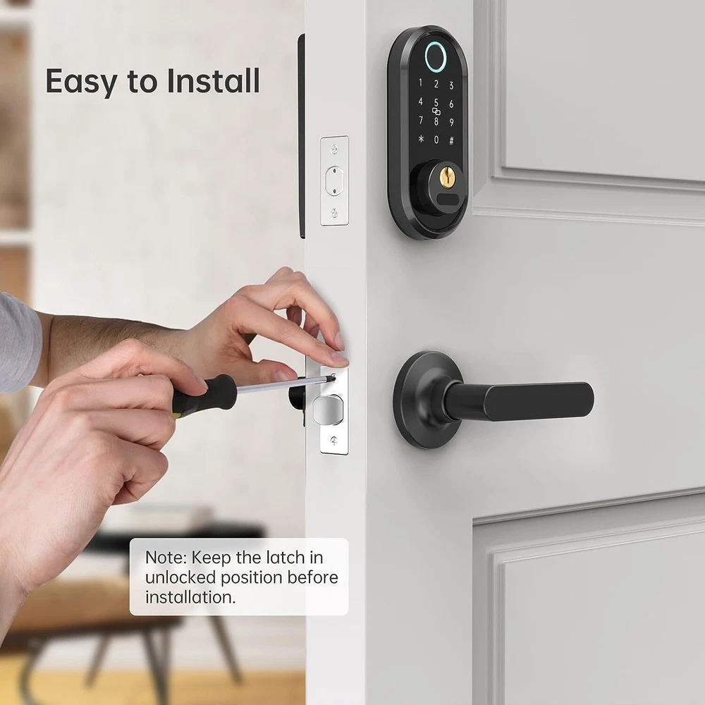 Options with "NO FP " means this model has NO fingerprint function, please kindly notice it About this item: 【 Keyless E ntry 】Front door handle set with 150 password code + 2 spare keys + 3 fobs + 250 fingerprints and bluetooth smartphone control, experience a revolutionary biometric technology with touch and go 360° fingerprint ID. Smart deadbolt supports working with Alexa & Google Home Assistant and remote controlling with your lock if paired with G2 Gateway (Optional, sold separately). 【 Automatic L ock 】With anti peeping function when entering passwords, set up auto lock function for the fingerprint door lock in 1-900 seconds, or long press '#' for manually locking. One-time password for temporary visitors, ekey or permanent code to your family, make it more flexible for children, guests, service people or others who wants to entry. 【 Keypad Door Lock with Hand le 】A digital deadbolt combined with 2 mating lever handles, built-in backlight. Solid alloy body and long battery life, 4pcs AA batteries providing 10,000 openings(approx. 12 months). Adding an equal touch of elegance to both traditional and modern homes, perfect for your smart home. 【 Easy to Ins tall 】Follow the steps and tips showing in the video, replace an existing deadbolt door lock in minutes with just a phillips screwdriver. Compatible with standard wooden, left and right handed doors, great solution for Airbnb rental apartment. Kindly noted that L/R side doors have different install method. 【 Professional Customer Su pport 】We provides at least 1 year warranty and free life-time technical support available to smart lock deadbolt. Any questions(such as installation or App problems or more information about G2 gateway) please feel free to reach out to us. Specifications: Brand: SMONET Model: A1 / M1 / Y1 Color: Black / Silver Material: Alloy Shape: Camelot / Rectangle / Oval Style: Modern Door Direction: Universal / Reversible (Both left & right, inswing & outswing) Connectivity Protocol: Bluetooth Ways to Unlock: Fingerprint / Keypad Passcode / Key Fobs / Physical Keys Control Method: App Phone APP: TT Lock / Next Lock (Totally FREE) Remotely / Voice Control: Alexa or Google Home (WiFi Gateway Needed) Lock Type: Keypad Finish: Painted Controller Type: Hand Control Control Method: Touch Power Supply: 4x AA Battery (NOT Included) IP Rating: IP63 What's in the box: 1x Front Door Lock Keypad 1x Rear Door Lock Panel 2x Knob or Lever Handle (Depends on your choice) 1x Latch 2x Key Fobs (IC Cards) 3x Physical Keys 1x Strike Pad 1x Strike Plate 1x Battery Cover 1x Drilling Template 1x Installation Screws Pack 1x User Manual Auto Lock Experience the convenience and peace of mind with smart deadbolt lock's automatic locking feature. Fingerprint Recognition Advanced fingerprint recognition technology enables the storage of up to 250 sets of fingerprints. Remote Share You have the ability to generate and share a one-time password remotely for guest. Easy to Install No extra drilling required. Can be completely installed by one person with just a Phillips screwdriver Voice Control Embrace the power of voice: Control your lock with effortless ease! (G2 Gateway Required) Widely compatibility to all kinds of weather SMONET Pro keyless entry door lock with handle provides IP63 waterproof and works from -4 °F to 158 °F temperatures. Smooth and stable in all kinds of weather, safeguard your home as always. Long battery life, Type C backup Intuitive touchscreen display, long battery life, up to 12 months of battery life. SMONET Pro front door lock with low battery alert and type C emergency backup, free you from battery worries.