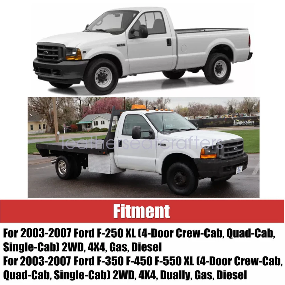 Front Full Bench Bottom-Top Seat Cover Gray For 2003-2007 Ford F250 F350 F450 XL Details Description: Type: Bench Bottom & Top Leather Seat Cover Side Fitted: Full Bench Bottom & Top Color: Med Flint Gray - Factory Color Color Code: " E " Located in your VIN Number Sticker Material: Microfiber Leather Make: Ford Model: F-250 F-350 F-450 F-550 XL Fit Years: 2003 2004 2005 2006 2007 This item is a new Custom-made, replacement in " Med Flint Gray " Color for: 2003 2004 2005 2006 2007 Ford F250 F350 F450 F550 XL 2003-2007 Ford F-250 XL (4-Door Crew-Cab, Quad-Cab, Single-Cab) 2WD, 4X4, Gas, Diesel 2003-2007 Ford F-350 XL (4-Door Crew-Cab, Quad-Cab, Single-Cab) 2WD, 4X4, Dually, Gas, Diesel 2003-2007 Ford F-450 XL (4-Door Crew-Cab, Quad-Cab, Single-Cab) 2WD, 4X4, Dually, Gas, Diesel 2003-2007 Ford F-550 XL (4-Door Crew-Cab, Quad-Cab, Single-Cab) 2WD, 4X4, Dually, Gas, Diesel Heated Seats: Fits Heated Seats and Non Heated Seats Power Seats: Fits Power Seats and Non Power Seats Vehicles Seat Cover's Attached Padding: ½ Inch attached foam padding Warranty: 5 Year Package Including: 1x Bench Bottom Replacement Leather Cover & 1x Bench Back Replacement Leather Cover If you do not know how to install, please contact us, We can provide video installation instructions Tips: This Bench Bottom & Back seat cover, built to factory specs with Quality Microfiber Leather to match the Interior of your vehicle! Our product is exactly the same as your existing cover and guaranteed to fit perfectly on your seat foam Pad. Any wrinkles seen in the pictures is from being in a box and guaranteed to disappear once installed Correctly. Please note this item is a replacement, not a slip on or pull over. (Foam pad and frame are not included). Please Note: Actual Replacement Cover. NOT A SLIP ON or PULLOVER. You will remove the old cover & then install the New Cover. Communication is the best way to solve the problem. If you have any problems after purchasing, please contact us in time, before opening return or case. Shipping policy: Payment: Returns: About us: Shipping policy: 1.Orders are usually shipped within 24 hours after your payment(except weekends & official holidays). You can log on to eBay to check your logistics tracking number. 2.Please make sure to provide us with correct,precise and detailed shipping address before purchase, and cannot change it once purchased. Payment: PayPal payment accepted only.Please purchase and pay for the item through the eBay. Returns: 1.If any item is defective upon receipt or do not work, please contact us for the condition,we will provide a solution for such cases. 2.Return is accepted within 30 days after the buyer receiving the item. About us: 1.Thanks for purchasing in our store,if you have any questions, please contact us immediately. We will provide you with the high quality service. 2.If you are satisfied with our products, please give us a positive feedback. On Dec 25, 2024 at 06:06:55 PST, seller added the following information: