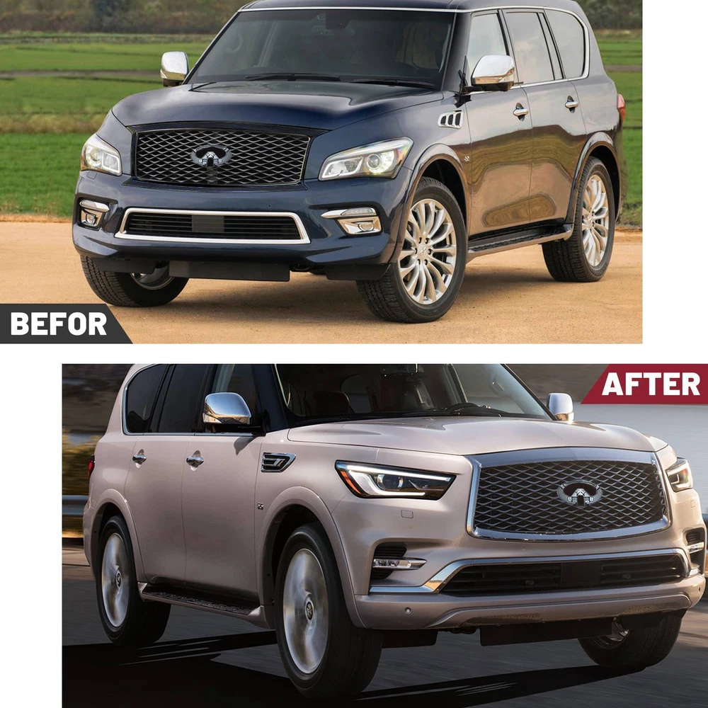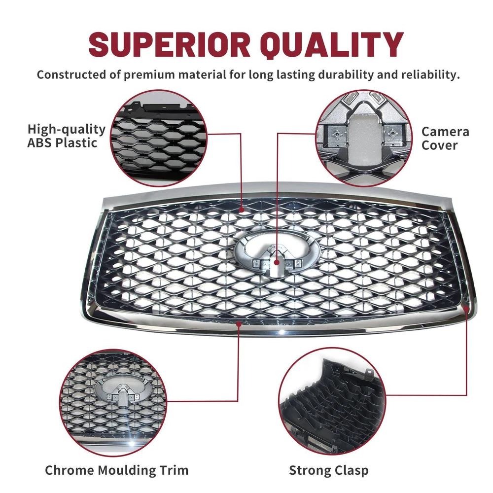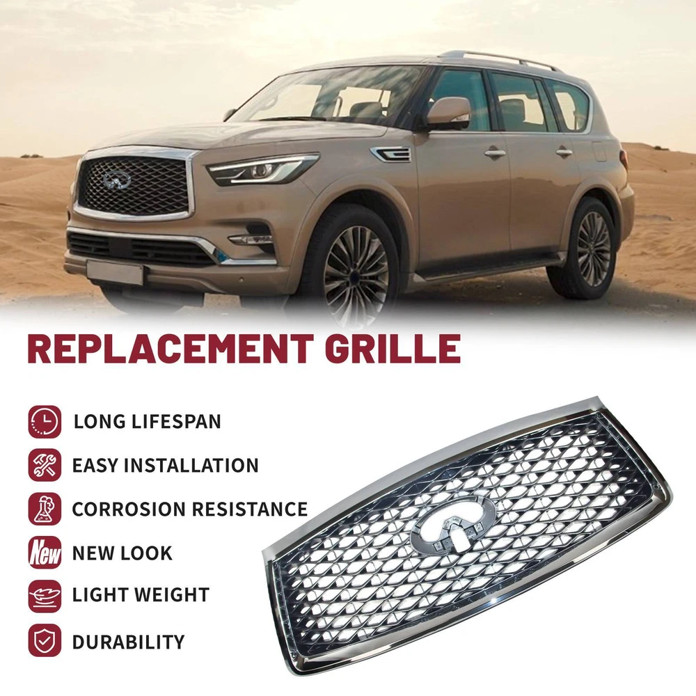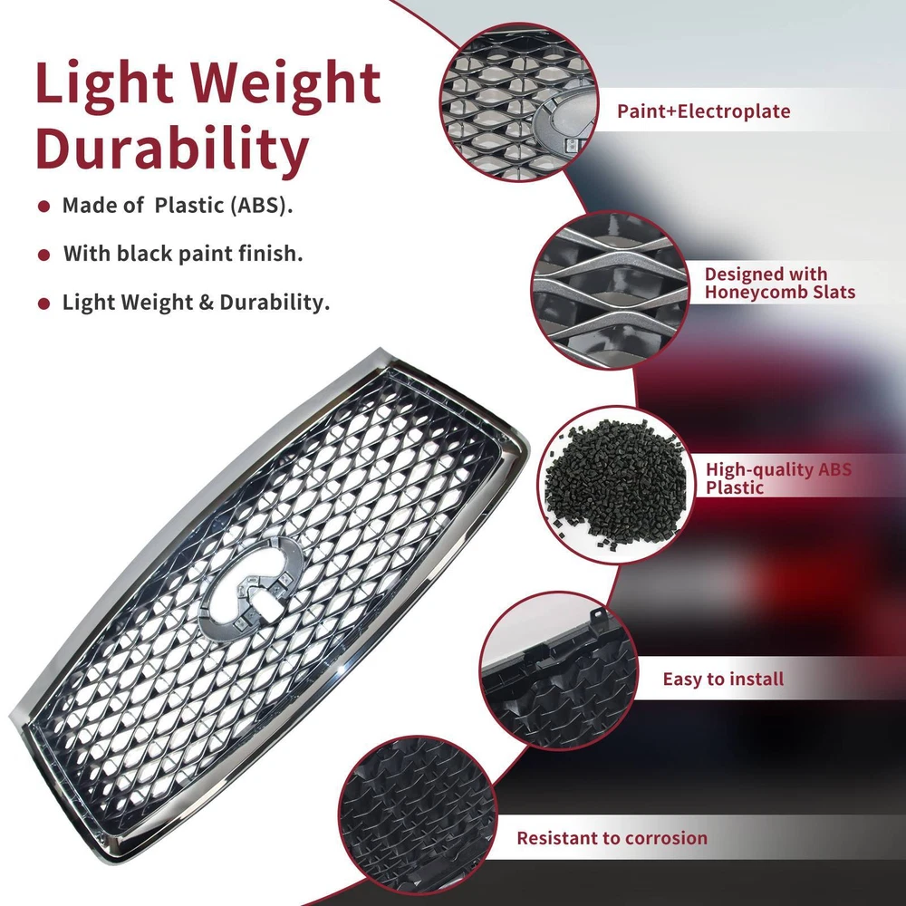 Specification OE Number: 623106GW0A Condition: New Manufacturer Warranty: 1 Year Package Weight(lbs): 11.46 Package Dimensions((LengthxWidthxHeight:inch)): 45.28 Item Weight(lbs): 9.46 Item Size(LengthxWidthxHeight:inch): 45.28*18.9*6.69 Package Include: 1*Grille,1*Camera Hole Surface Finish: Paint,Electroplate Material: ABS Color: Chrome frame,Sliver Fitment 2018-2021 INFINITI QX80 Features & Benefits 1. Easy to Install & Precise Fitment Factory style designed as a direct replacement for your original grille assembly. Easy to install, directly bolt-on. Requires no cutting and no drilling. 2. Premium Look Offered nice finishes, including sleek chrome, textured black, and painted (depending on application). Prevent scratches, no fade. Make your car a new style and appearance. 3. Enduring Protection Provides better airflow to the radiator and engine to help the cooling process best. Protect your driving safety by blocking large objects to achieve good wind and dust isolation. 4. Durability Made of High-quality ABS Double-layer process material (Surface UV Finish), it has the advantages of high-temperature resistance, good impact resistance, long service life, and durability. 5. High Quality All car grilles have the same quality as the original parts but at a lower price. One-year warranty caused by quality. 6. Notes 1)Don't remove the grille when the car has just been running in case the parts are still hot. It is best to wait for up to half an hour to ensure that everything has cooled down completely. 2)Wear hand and eye protection to protect your skin from chemicals and your eyes from dust. 3)Wash your hands afterward to ensure no lingering dust or chemicals on your hands enter your eyes, even if you have been wearing gloves. Note: Only sold in the USA (Excluding Hawaii, Alaska, Puerto Rico, Guam, Virgin Islands, American Samoa, Northern Mariana Islands, Palau, Federated States of Micronesia, Marshall Islands, AA, AE, AP). Warranty: If there's any problem, please feel free to contact us with your car's VIN # and the pictures or videos to show the problem within 30 days, we’ll try our best to solve it and make you satisfied. After using, the item’s warranty is 1 year, only for replacement and no refund. Hope you know.