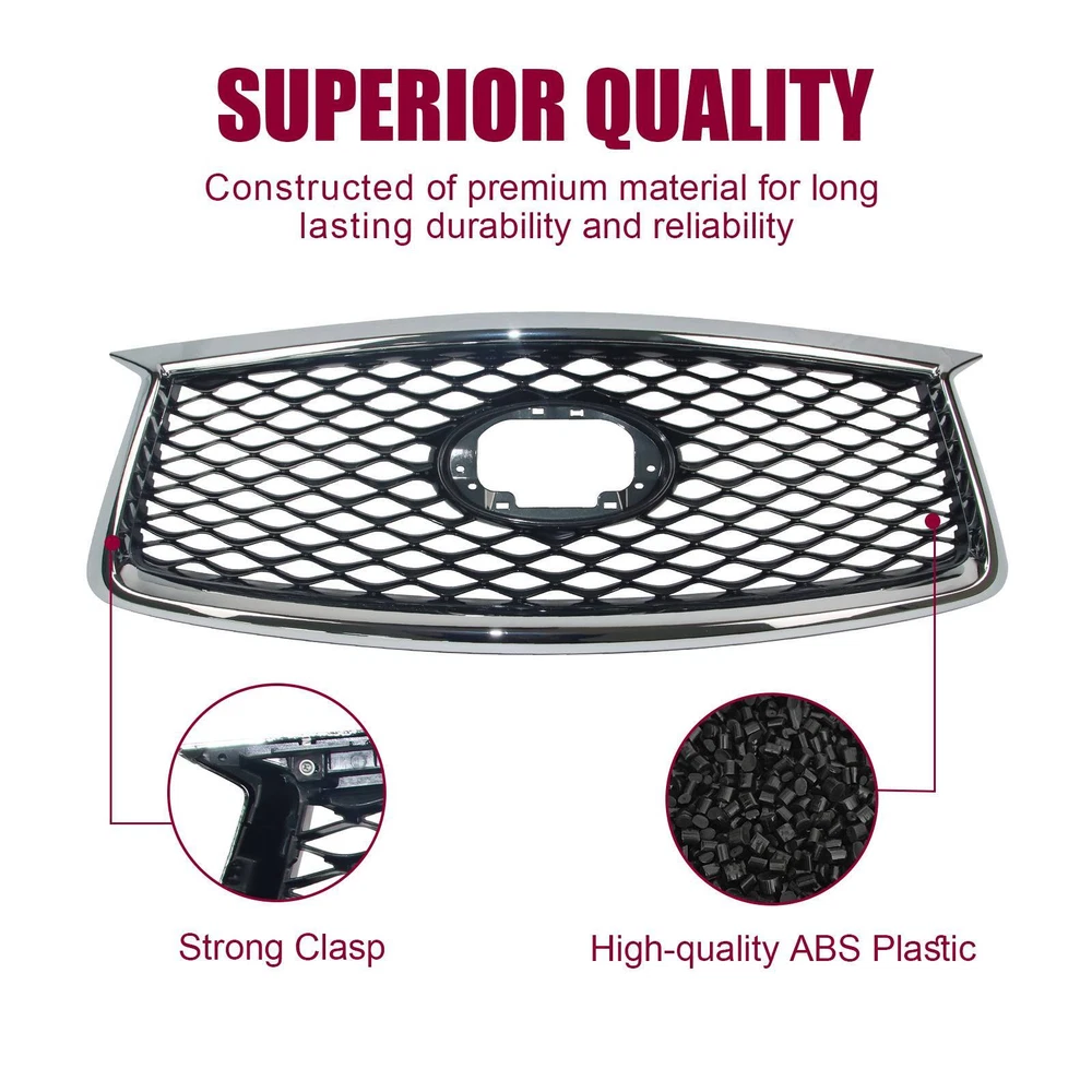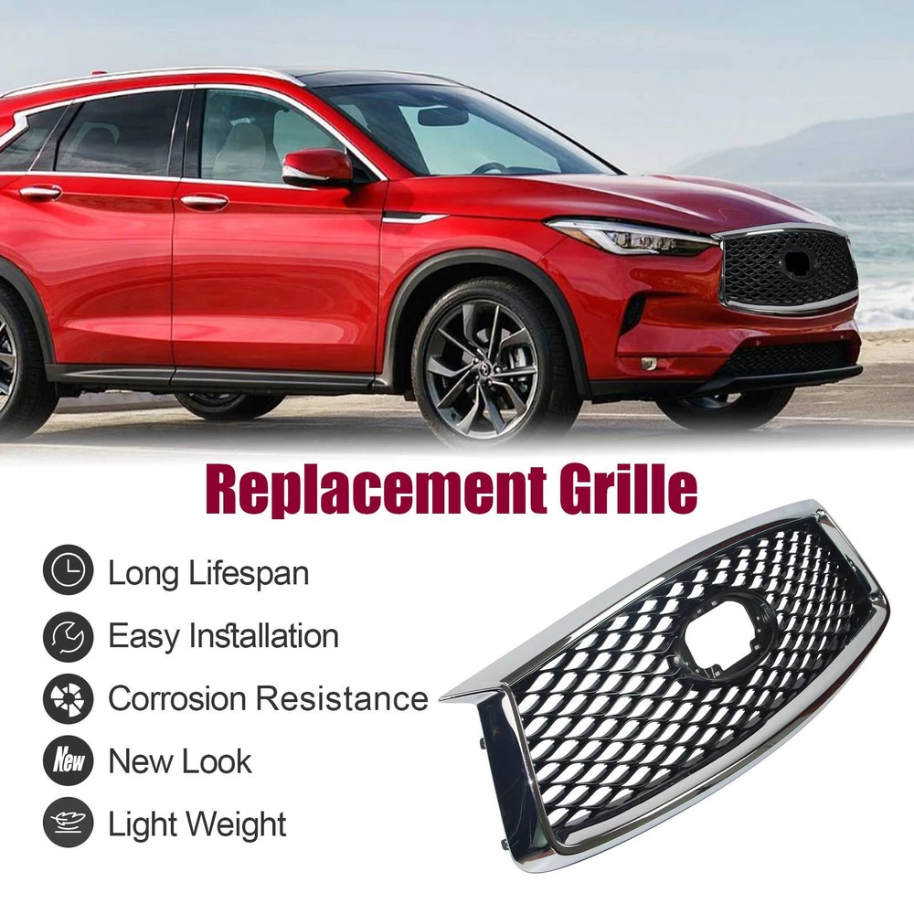 Specification OE Number: F23106HH1A Condition: New Manufacturer Warranty: 1 Year Package Weight(lbs): 7.72 Package Dimensions((LengthxWidthxHeight:inch)): 42.13 Item Weight(lbs): 6.72 Item Size(LengthxWidthxHeight:inch): 42.13*14.96*5.51 Package Include: 1*Grille,Screw Surface Finish: Paint,Electroplate Material: ABS Color: Chrome frame,Grey Fitment 2019-2022 INFINITI QX50 Features & Benefits 1. Easy to Install & Precise Fitment Factory style designed as a direct replacement for your original grille assembly. Easy to install, directly bolt-on. Requires no cutting and no drilling. 2. Premium Look Offered nice finishes, including sleek chrome, textured black, and painted (depending on application). Prevent scratches, no fade. Make your car a new style and appearance. 3. Enduring Protection Provides better airflow to the radiator and engine to help the cooling process best. Protect your driving safety by blocking large objects to achieve good wind and dust isolation. 4. Durability Made of High-quality ABS Double-layer process material (Surface UV Finish), it has the advantages of high-temperature resistance, good impact resistance, long service life, and durability. 5. High Quality All car grilles have the same quality as the original parts but at a lower price. One-year warranty caused by quality. 6. Notes 1)Don't remove the grille when the car has just been running in case the parts are still hot. It is best to wait for up to half an hour to ensure that everything has cooled down completely. 2)Wear hand and eye protection to protect your skin from chemicals and your eyes from dust. 3)Wash your hands afterward to ensure no lingering dust or chemicals on your hands enter your eyes, even if you have been wearing gloves. Note: Only sold in the USA (Excluding Hawaii, Alaska, Puerto Rico, Guam, Virgin Islands, American Samoa, Northern Mariana Islands, Palau, Federated States of Micronesia, Marshall Islands, AA, AE, AP). Warranty: If there's any problem, please feel free to contact us with your car's VIN # and the pictures or videos to show the problem within 30 days, we’ll try our best to solve it and make you satisfied. After using, the item’s warranty is 1 year, only for replacement and no refund. Hope you know.