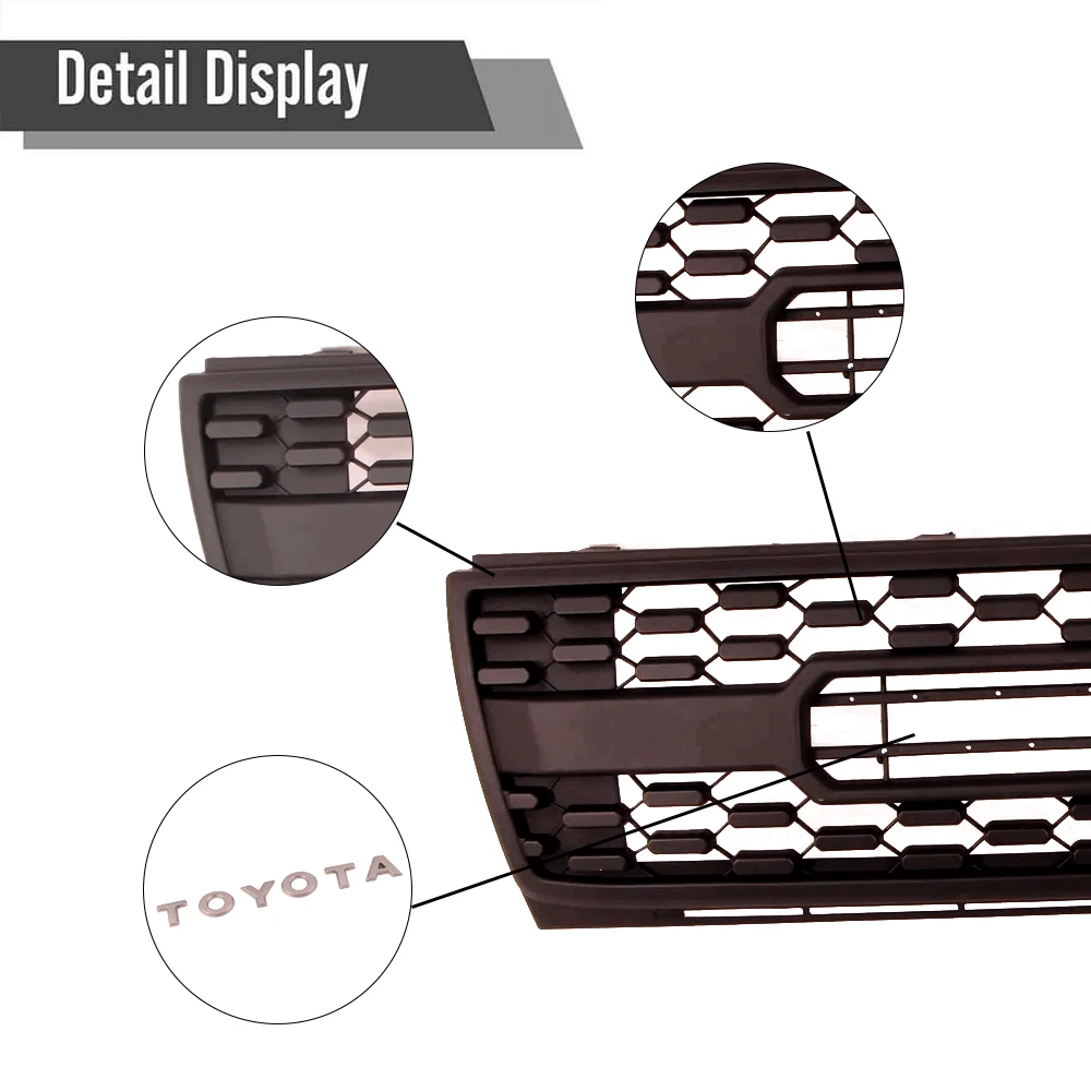 Product Description Front Grille For Toyota Tacoma 1997-2000 Bumper Grill Matte Black W/3LEDs ABS Package include: 1 x Front Grille with letters 3x LED Lights 1x Wire harness Fitment: For 1997, 1998, 1999, 2000 Toyota Tacoma Perfectly on all Tacoma models including: SR, SR5, TRD Sport, TRD Off-Road, TRD Limited, TRD PRO. If you can not make sure the grill fit your car or not, pls send the VIN to us, we will check it for you. Specification: Color: Matte Black Material: ABS Plastic Feature: *Grill made of high quality ABS material, resistant to light impacts, dust, water, and corrosion. The mesh design allows air to flow easily into your vehicle’s engine. *The grille is painted in black with letters. The best updated grille for Tacoma that gives a new look. *Easy to install. Just u nscrew the factory grill and attach the new grill with the existing screws. *With 3 LED lights About Us Payment Shipping Returns Contact Us Welcome to FunKit ,this is a professional shop selling Auto parts, with high-quality and affordable products.You can choose the products suitable for your car, we provide you with the best price and high quality products. Thank you for your business.If you have any questions, please contact us. Please leave us with positive feedback if you are satisfied with our products and services,if not, please contact us before leave any neutral or negative feedback,we'll try our best to satisfy with you. Thank you! We only accept PayPal payment. IMPORTANT NOTICE: We ship our products via FedEX or USPS. In some cases,your purchase will be shipped in two packages(e.g. Grille is in a package,letters,LED lights are in another packge),so please be patience if you recieve one of them first. -We do not offer expedited shipping. -We only ship to the Lower 48 states, and we do not ship to FPO, APO or PO Box addresses. And we are not responsible for wrong or undeliverable address. Please provide us your full address with Telephone number and make sure your shipping address is correct and deliverable. If you need to change your address,please change it in PayPal first before you pay. -Package handling only takes 1 business day at our warehouse, so please make sure entering correct payment and shipping information before checking out. -We are not responsible for any changed of address after item has been shipped. Return: We offer a 30-Day Limited Warranty. If you are not satisfied with your purchase, we are more than happy to offer an exchange or refund within 30 days. !!! No returns are accepted after installation/used. ***Received Incorrect / Damaged / Missing Item: Please take some photos of everything you have received in the package, along with a picture of the invoice and shipping label and send it to our email. We will take care of everything. Please inspect the items upon receiving any damages or missing contents. Please contact us within 7 days of delivery via email. If you change your mind / don't like it / buy it by mistake. Please repack the items carefully. Items to be returned must be in resalable condition. Returned items will be tested and if found defective / incorrect / damaged / missing parts,we will deduct the refund based on the condition of the item. The product must in brand NEW conditions and in original packaging. Installations: It is imperative that buyers understand the items are vehicle-related and require installation and vehicle knowledge. Some of our parts are direct from EUROPE or ASIA which may require modification to complete the installation. Most of the items do not have installation instructions. We highly recommend professional installation if you are not familiar with the installation. If you have any question regarding this listing, Please send us a message. Before leaving us neutral or negative feedback, please contact us first. We will do everything we can to give you a satisfying solution. We do our best to resolve any issue. Leaving negative feedbacks and low ratings doesn't get things solved. So please talk with us and we will not let you down. Business hours: Monday to Friday (exclude Holidays) 9:00 A.M. – 6:00 P.M. Pacific Standard Time ***We do not answer any emails over the weekends and holidays. All emails will be replied in the order it was received on the following business day. About Us Welcome to FunKit ,this is a professional shop selling Auto parts, with high-quality and affordable products.You can choose the products suitable for your car, we provide you with the best price and high quality products. Thank you for your business.If you have any questions, please contact us. Please leave us with positive feedback if you are satisfied with our products and services,if not, please contact us before leave any neutral or negative feedback,we'll try our best to satisfy with you. Thank you! Payment We only accept PayPal payment. Shipping IMPORTANT NOTICE: We ship our products via FedEX or USPS. In some cases,your purchase will be shipped in two packages(e.g. Grille is in a package,letters,LED lights are in another packge),so please be patience if you recieve one of them first. -We do not offer expedited shipping. -We only ship to the Lower 48 states, and we do not ship to FPO, APO or PO Box addresses. And we are not responsible for wrong or undeliverable address. Please provide us your full address with Telephone number and make sure your shipping address is correct and deliverable. If you need to change your address,please change it in PayPal first before you pay. -Package handling only takes 1 business day at our warehouse, so please make sure entering correct payment and shipping information before checking out. -We are not responsible for any changed of address after item has been shipped. Returns Return: We offer a 30-Day Limited Warranty. If you are not satisfied with your purchase, we are more than happy to offer an exchange or refund within 30 days. !!! No returns are accepted after installation/used. ***Received Incorrect / Damaged / Mi