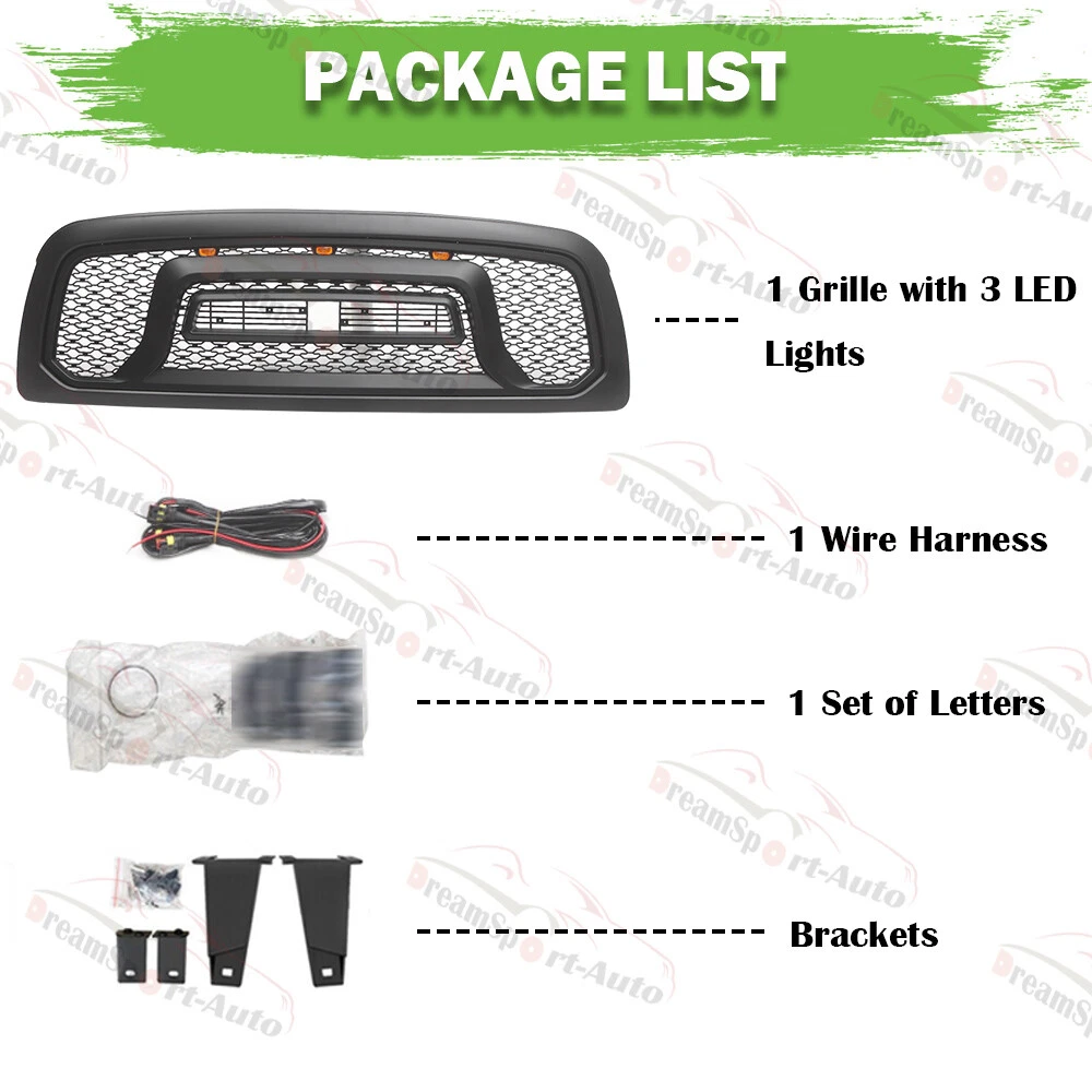 Product Description Front Grille for 2009-2012 Dodge Ram 1500 Black Grill w/Letters LED Paintable (With all letters & Ships with 1 working day after payment ) Stock in US and will be shipped out in two business days(mostly in one weekday) from CA Led lights and letters include. Made of high quality ABS plastic with matte black finish. Any question,please contact with us. FEATURE This Grille not only adds great styling to the front end of your RAM, but it will also increase airflow across the radiator - when compared to the stock grille. This additional air helps to improve engine cooling, which in turn improves performance. Simple Straight Forward Installation. There is no cutting or modifications required for a clean straightforward installation. Installation can be completed in about 1 hour with just basic hand tools. FITMENT: For 2009 2010 2011 2012 Dodge Ram 1500 PACKAGE INCLUDE: 1x Grille 3X Letters R/A/M 3x Amber LED Lights 1x Wiring Harness ! Note: 1. If You Can't Make Sure It's Will Fit Or Not Please Send Us You Model Car Photos. Thanks !!! 2. Customer satisfaction is our number one priority. Please contact us to resolve any problem before leaving neutral or negative feedback. 3. Please check compatibility table, item specifics, part numbers as well as the product description to ensure this is the correct part for your vehicle. 4. Instruction not included. Professional installation is always recommended. 5. Any damaged products due to non-professional or user error may not be returned for refund. About US payment Shipping Return Contact US *Have any questions,please send us a message and we will help you solve them. *Please do not open the return and dispute at will. Once it is opened, it will affect our view of the specific information of the order, which is inconvenient for us to solve the problem. * If you receive the goods and are satisfied , please give us a good comment, we will give you a good comment; *Do not feel free to give bad reviews, because bad reviews can not solve the problem, only contact us to let us know what problems you encounter, we can help you solve. Thank you. * We specialize in aftermarket performance parts and accessories. Our goal is to strive for the highest level of customer service to ensure the satisfaction of all our customers. * We work hard with our suppliers to find the best products, at the lowest prices from brands that you know and trust. * We have contracts in place with major shipping providers to help ship and deliver our products to the consumer fast and efficiently. Our average processing / handling time is less than 24 hours and about 95% of our shipments arrive earlier than the expected arrival dates. Based on eBay new policy,We accept payment by PayPal only. PayPal enables you to send payment quickly and securely online.We do not accept other payment methods. 1、Tracking number will be emailed to you once we have shipped your order.If there is any delay,it may be caused by bad weather or custom inspection.If you still can not receive the item with in 7 Days,please contact us.You can track your parcel on the following website using your tracking number: 17track (Copied to the browser to open) 2、We try our best to make you get desired products as soon as possible.In case you receive wrong products due to shipping error,please contact us for exchange or refund.If it is damaged,please refuse to acceot and contact us as soon as possible. 3、We are not responsible for wrong or undeliverable address.Please provide us your full address with Telephone number and make sure your shipping address is correct and deliverable.If you need to change your address,please change it in PayPal first before you pay. 30 Days Return & Exchange Policy: * We give you a 30 days money-back guarantee to return any items purchased, no questions asked, hassle-free. * You can return for refund or exchange same product or different product (difference of price will be charged) within 30 days after you receive the item. * Any returning or exchanging items must be in the original package and new condition. We reserve rights to refuse refit or damaged items (caused by buyer) for return and exchange. * No returns will be accepted if you contacted us after 30 days of receiving the item. * Return fee: Buyers are responsible to pay the return shipping fee. 15% restocking fee on total price will be charged and be deducted from the refund total. * Exchange fee: No restocking fee will be charged, however Buyers are responsible to pay the return shipping fee and exchange reshipping fee , depending on the weight of merchandise. * Email our Customer Service Department first before return the item back . Please specify your item number, your eBay ID, and the reason for the return. 60 Days Warranty Policy * Defective Return & Exchange : To help process this faster, please provide detailed description explaining the problem and attach photos of damaged products as well. If we authorize the return, you will be receiving an email with instructions on the return. * We give you a 60 days warranty to exchange any defective items. Within 3 days after you receive the item, Pre-paid return label or shipping fee will be provided if it is necessary. After 3 days, buyers are responsible to pay the return shipping fee to send item back to us. We will cover the replacement shipping fee. Defective products only can be exchanged for the exact same product within 60 days after the date of sale. No exchange will be accepted if you contacted us after 60 days of receiving the item. 1.Huge selections of car parts for you. Best quality with factory price. 2.Please contact us if you have any questions. About US *Have any questions,please send us a message and we will help you solve them. *Please do not open the return and dispute at will. Once it is opened, it will affect our view of the specific information of the order, which is inconvenient for us to solve the problem. * If you receive the goods 
