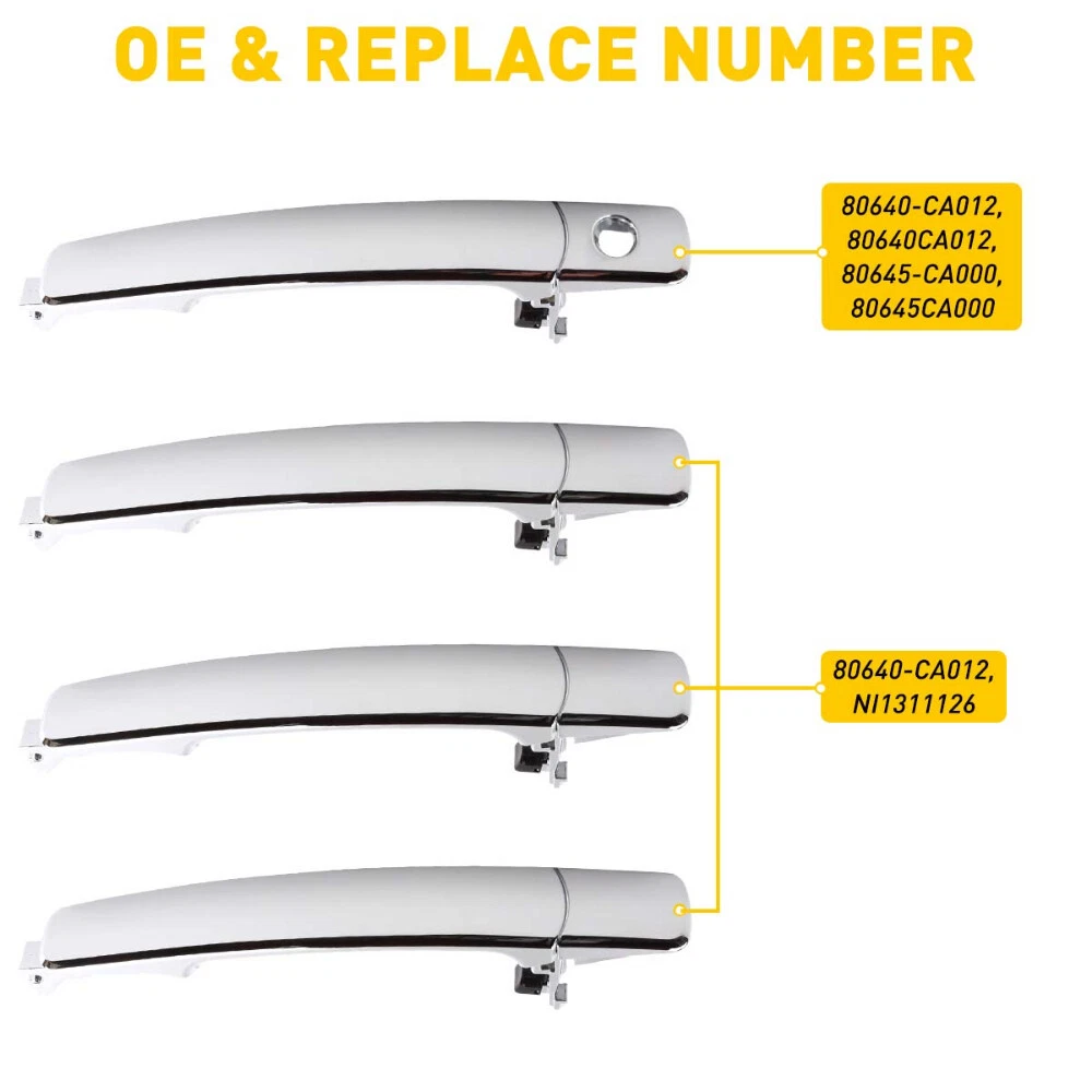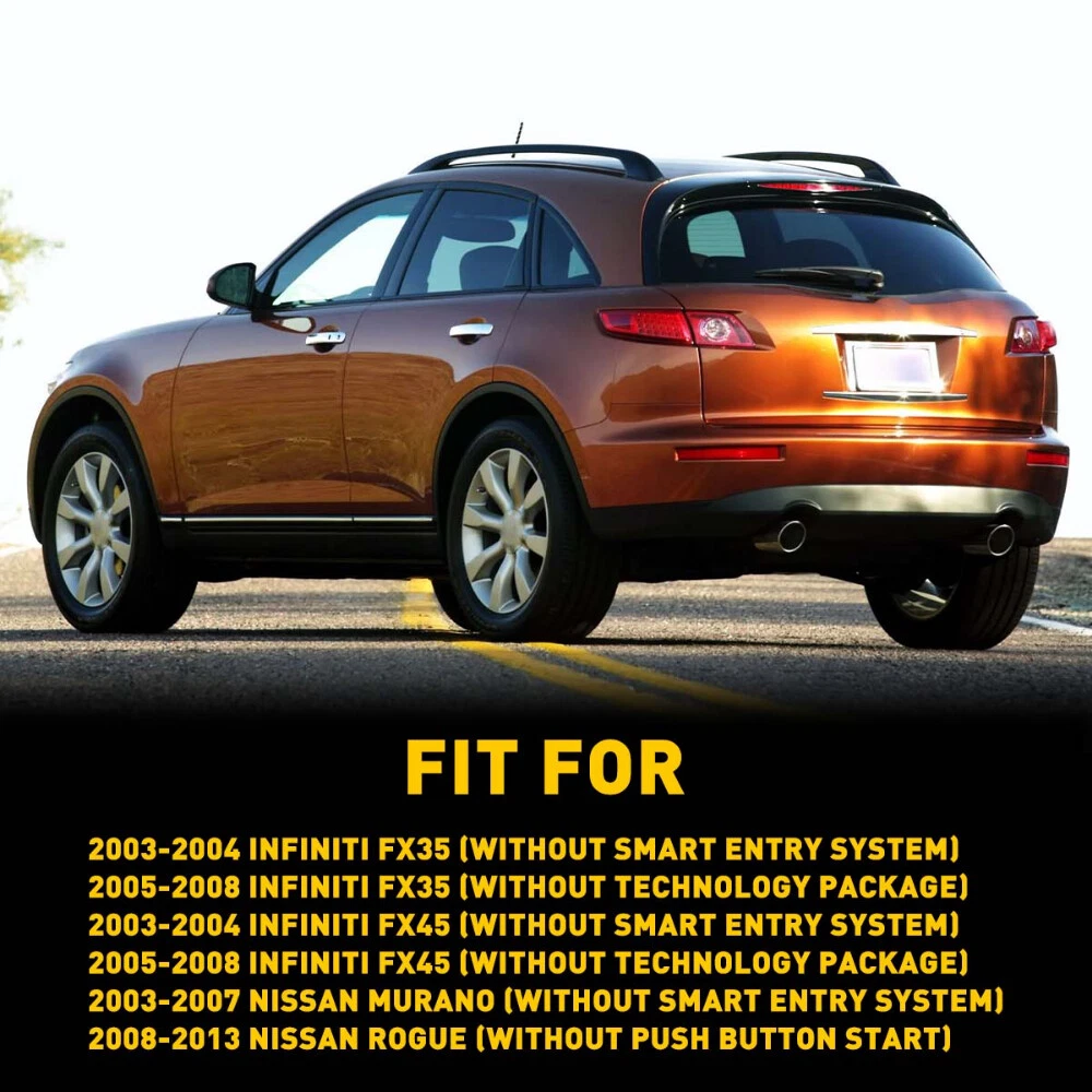Fit for: 2003-2004 INFINITI FX35 (WITHOUT Smart Entry System) 2005-2008 INFINITI FX35 (WITHOUT Technology Package) 2003-2004 INFINITI FX45 (WITHOUT Smart Entry System) 2005-2008 INFINITI FX45 (WITHOUT Technology Package) 2003-2007 NISSAN MURANO (WITHOUT Smart Entry System) 2008-2013 NISSAN ROGUE (WITHOUT Push Button Start) Specifications: OE number: 80640-CA012, NI1311126, 80645-CA000, 80645CA000 Color:Chromium plating Placement on vehicle: Exterior door handle (front right, rear left and right) Material: Plastic Features: *Perfect fit Front Rear LeftRight Side Exterior Door Handle For Infiniti NI1311126 FX35 03-07 Fit for: 2003-2004 INFINITI FX35 (WITHOUT Smart Entry System) 2005-2008 INFINITI FX35 (WITHOUT Technology Package) 2003-2004 INFINITI FX45 (WITHOUT Smart Entry System) 2005-2008 INFINITI FX45 (WITHOUT Technology Package) 2003-2007 NISSAN MURANO (WITHOUT Smart Entry System) 2008-2013 NISSAN ROGUE (WITHOUT Push Button Start) Specifications: OE number: 80640-CA012, NI1311126, 80645-CA000, 80645CA000 Color:Chromium plating Placement on vehicle: Exterior door handle (front right, rear left and right) Material: Plastic Features: *Perfect fit Comply With OEM Design, Use It With Confidence. *Strict Quality Control All of our handles undergo strict quality control not just before shipping but throughout the production process. *Durable Mainly made of high-quality plastic material to ensure the durability. Packaging include: Door handle*4 ( front right, rear left ,rear right, front left) Item Specifics Manufacturer Part Number MBS-WM-Murano-03-07 Type Door Handle Placement on Vehicle Front,Rear Right ,Left Side Finish Chrome Manufacturer Warranty 2 Years Fitment Type Direct Replacement Custom Bundle No Interchange Part Number 80640-CA012, 80645-CA000, 80645CA000,80640-CA012, 80640CA012 Part Name Exterior Door Handle Features Easy Installation Material ABS Plastic Replace Part 80640-CA012, 80645-CA000, 80645CA000,80640-CA012, 80640CA012 Brand Unbranded Payment We can accept payment by credit, debit, and gift cards; Apple Pay, Google Pay, PayPal, and PayPal Credit. Shipping 1. All items will be shipped in 24 hours after receiving your payment . 2. We ship this item to US only via USPS first class mail. It usually takes 3-5 working days to deliver. Returns 1. We offer 60 days return policy. 2. Please contact us within 60 days from the date you receive your package if you have any questions with the products . 3. Refund will be sent after we got your returned package. 4. All returned items should be in the original packaging with tracking number. Contact Us We work from Monday - Saturday 9:00AM - 6:00PM PST, but we will reply you once we get your message .There will be some delay on response if you send message or E-Mail on Sunday. DESCRIPTION PAYMENT SHIPPING RETURN POLICY CONTACT US Hot item Help & Info Payment Policy Shipping Policy Return Policy FAQ About Us Front Rear LeftRight Side Exterior Door Handle For Infiniti NI1311126 FX35 03-07 Fit for: 2003-2004 INFINITI FX35 (WITHOUT Smart Entry System) 2005-2008 INFINITI FX35 (WITHOUT Technology Package) 2003-2004 INFINITI FX45 (WITHOUT Smart Entry System) 2005-2008 INFINITI FX45 (WITHOUT Technology Package) 2003-2007 NISSAN MURANO (WITHOUT Smart Entry System) 2008-2013 NISSAN ROGUE (WITHOUT Push Button Start) Specifications: OE number: 80640-CA012, NI1311126, 80645-CA000, 80645CA000 Color:Chromium plating Placement on vehicle: Exterior door handle (front right, rear left and right) Material: Plastic Features: *Perfect fit Comply With OEM Design, Use It With Confidence. *Strict Quality Control All of our handles undergo strict quality control not just before shipping but throughout the production process. *Durable Mainly made of high-quality plastic material to ensure the durability. Packaging include: Door handle*4 ( front right, rear left ,rear right, front left) Payment Shipping Returns Contact Us We can accept payment by credit, debit, and gift cards; Apple Pay, Google Pay, PayPal, and PayPal Credit. 1. All items will be shipped in 24 hours after receiving your payment . 2. We ship this item to US only via USPS first class mail. It usually takes 3-5 working days to deliver. 1. We offer 60 days return policy. 2. Please contact us within 60 days from the date you receive your package if you have any questions with the products . 3. Refund will be sent after we got your returned package. 4. All returned items should be in the original packaging with tracking number. We work from Monday - Saturday 9:00AM - 6:00PM PST, but we will reply you once we get your message .There will be some delay on response if you send message or E-Mail on Sunday. All rights reserved. On Feb 5, 2025 at 16:18:06 PST, seller added the following information:
