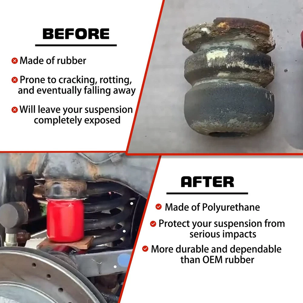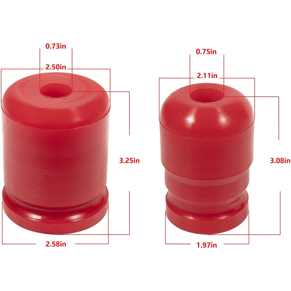 Front & Rear Polyurethane Bump Stop for 2007-2018 Jeep Wrangler JK 1-1303 1-1304 Fitment: Used for 2007-2018 Jeep Wrangler JK JKU Sport Rubicon Sahara Freedom Unlimited Features: 1) All bump stops are designed to protect your suspension from serious impacts. Add the energy-absorbing capabilities of polyurethane to the unique progressive cavity molded into the stops and you have a progressive compressibility bump stops 2) Replacing a worn Bump Stop will help provide maximum handling, giving you better handling than regular rubber units and extending the life of your vehicle. At the same time, it will not make your car run rough, providing a safer and smoother driving experience 3) Made of high-quality polyurethane, which outperforms its rubber counterparts in replacing bushings and mounts. Bump Stops withstand road debris, chemicals, oil, compression and loads for longer life. They will perform better by eliminating the extra sloppy suspension performance caused by worn, damaged or missing bushings Package included: 2PCS Front 1-1303 Bump Stop, 2PCS Rear 1-1304 Bump Stop