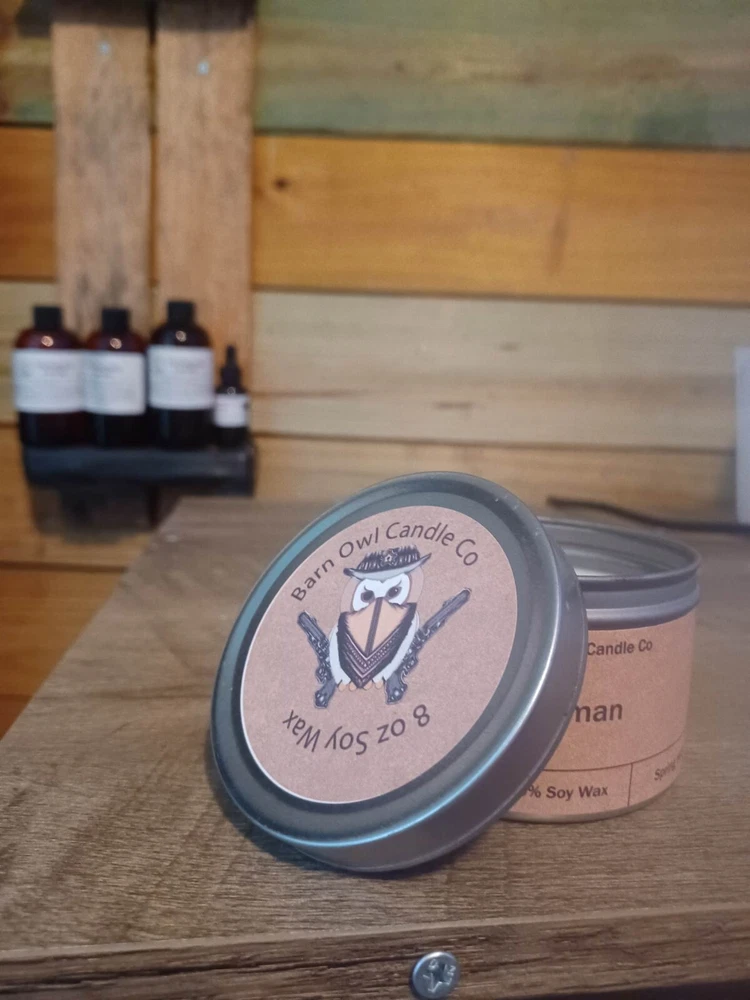 Masculine Western Candle Collection: Notes including juniper, cedarwood, pine, cedar, vetiver, ginger, and guaiacwood. we use soy wax beads from soybeans grown in America’s Midwest. Our wax is sustainable, renewable and ethically produced. No color is added, this is the natural color of the wax. Please note that the natural color may vary from batch to batch depending on environment and scent used. 8 oz Metal Tin Soy Wax Lead Free Wick WE SHIP SUPER FAST "Making candles for a purpose, one cancer patient at a time" We created Barn Owl Candle Co in memory of my mom who dealt with breast cancer and leukemia cancer. With every purchase of a candle, we donate to Moffitt Hospital in Tampa, FL to suppose cancer patients and research. Barnowlcandleco.com for our full story <3