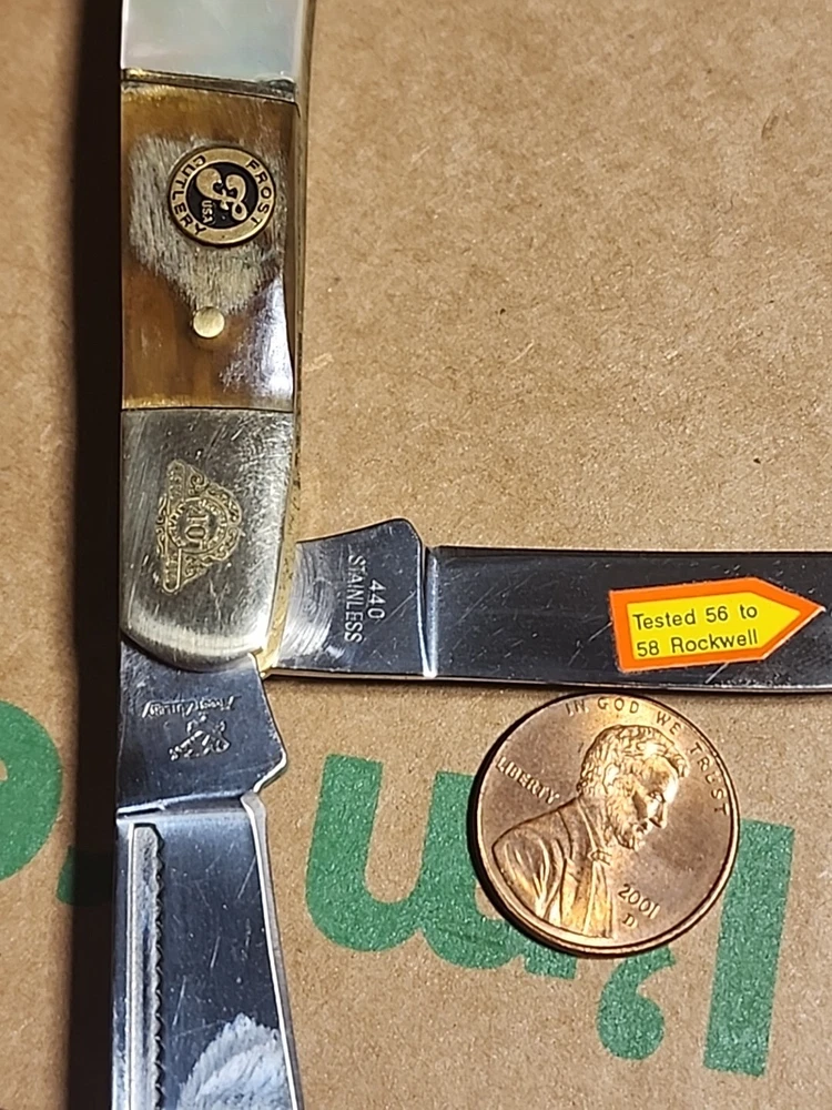 T his high quality Steel Warrior Wrangler Stockman is approximately 4 inches long (folded/closed) and weighs approximately 2.5 ounces. The handle is Ram Horn and Genuine Mother of Pearl with a Frost inlay. The Nickel Silver bolsters are stamped with Frost Cutlery 40th Anniversary. This knife utilizes a 2 7/8" Clip blade, 2 1/8" Sheepfoot Coping blade and 1 3/4" Pen blade. The blades are Polished 440 Stainless Steel and is tested to be 56-58 Rockwell hardness. The knife is presented in a Black, Frost Cutlery 40th Anniversary Box. This Wrangler Stockman is a professional-grade tool that comes with a Limited Lifetime Manufacturer's Warranty and is not designed nor intended to be used on or against humans. So, whether you're searching for authentic cutlery to collect, a top quality knife to give as a gift, or a superior tool to use, don't pass this one up! If you have questions about this 40-112RMR Wrangler Stockman feel free to ask. Frost Cutlery is a family-centered business that has been crafting traditional knives for over 40 years. Known in the industry for their unique designs and exceptional value, Frost Cutlery uses high-quality and legally-harvested natural materials such as Deer Stag, Buffalo Horn, Cattle Bone, or Exotic Hardwoods as well as durable and resilient synthetic materials like Celluloid or Delrin. Frost Cutlery has brought their dedication to workmanship and tradition to the many knife brands they now produce, including Steel Warrior and Frost Family.