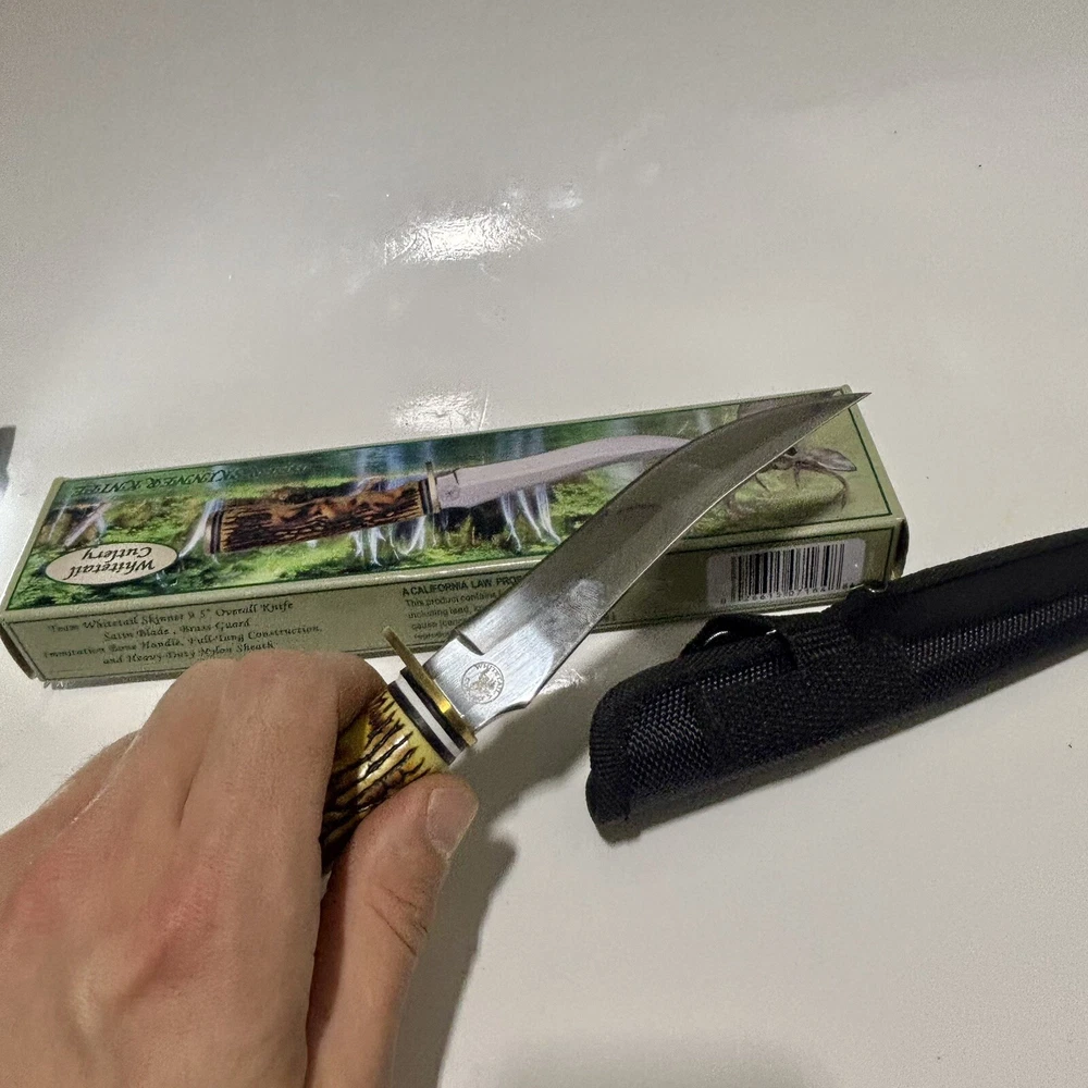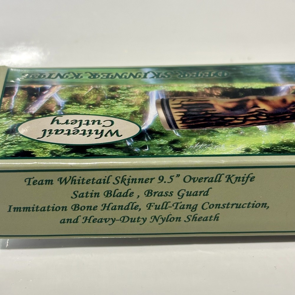 The Frost Whitetail Cutlery Fixed Blade Knife features a stainless steel blade with a silver color, 5 inches in length. It is a Bowie and Hunting type knife, made in Pakistan. The handle is crafted from imitation bone material, and the knife comes with a leather sheath. This item is new in box and is designed for collectors and knife enthusiasts.