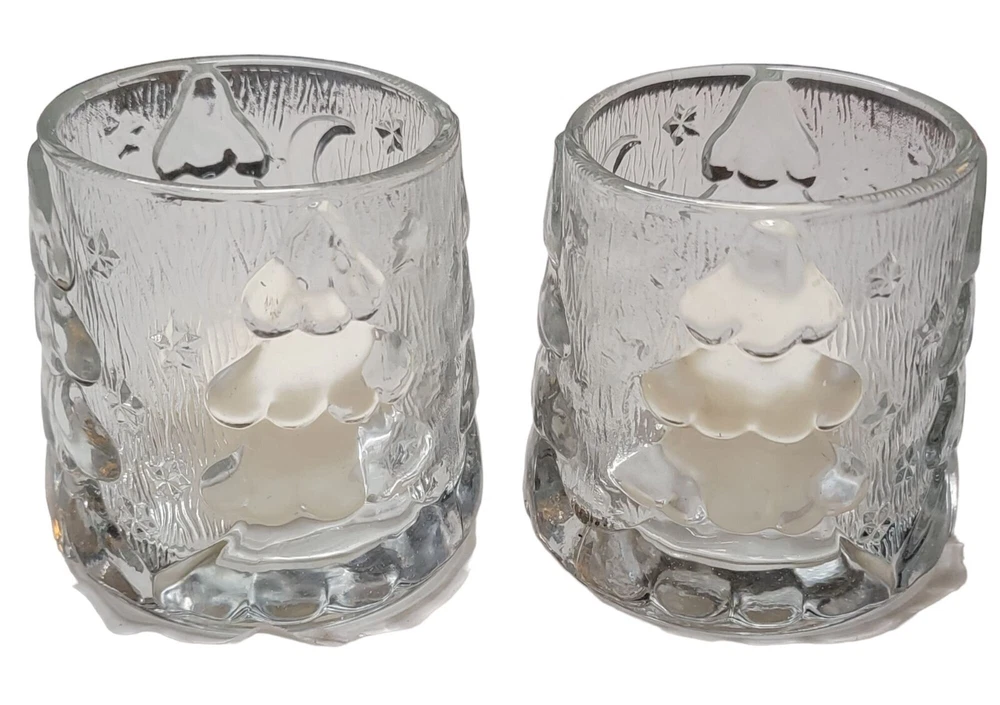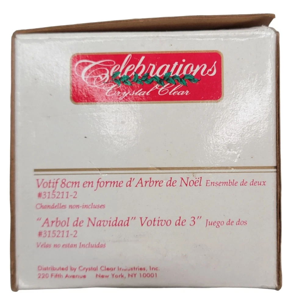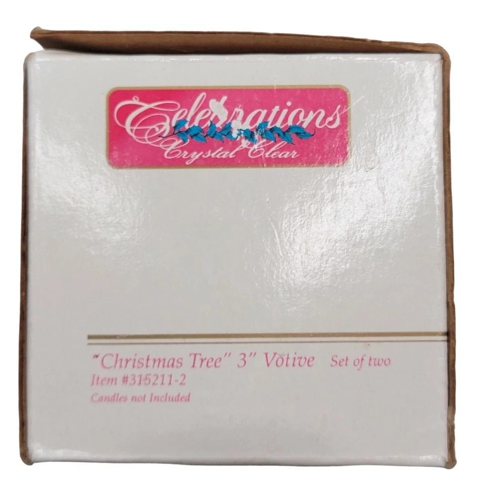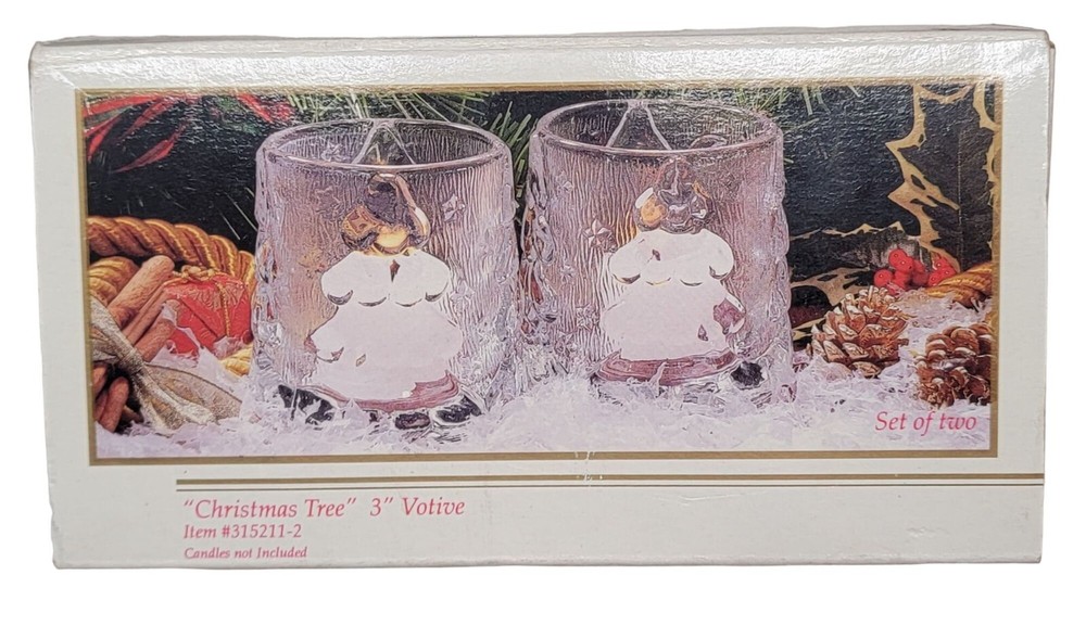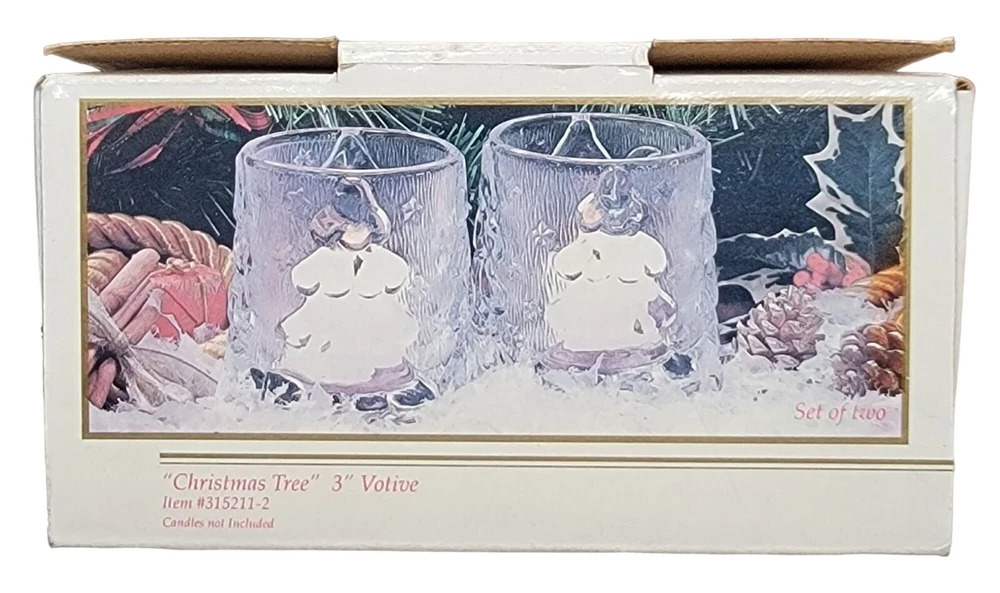 These intricately designed votive holders feature a charming Christmas tree motif, ideal for adding a festive touch to your home décor. The clear glass construction allows for an elegant display of candlelight, creating a warm and inviting atmosphere. • Set of two votive or small candle holders • Christmas tree design • Holds up to 3" candles • Frosted glass material • Elegant holiday décor Features: • Celebration Christmas Tree Candle Votive • Tea Light or Small Candle Holder • Set Of 2 • Candle Included • Candle Holder, Embossed Christmas Tree Size: 3" Measurements: Height 3 in / 8 cm Condition: Pre-Owned Like New NOS They're in excellent condition Original Box Candles Included Please be sure review all photos and description closely before purchasing, thank you! Smoke free work space Please read the description for further details and measurements, Thank you!