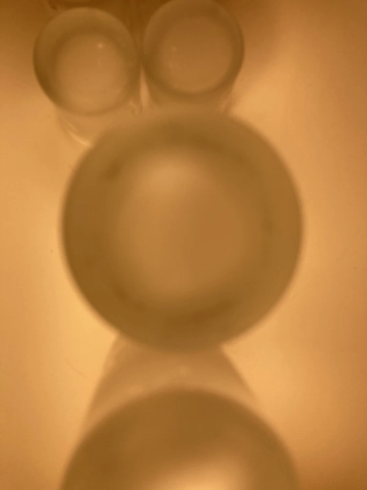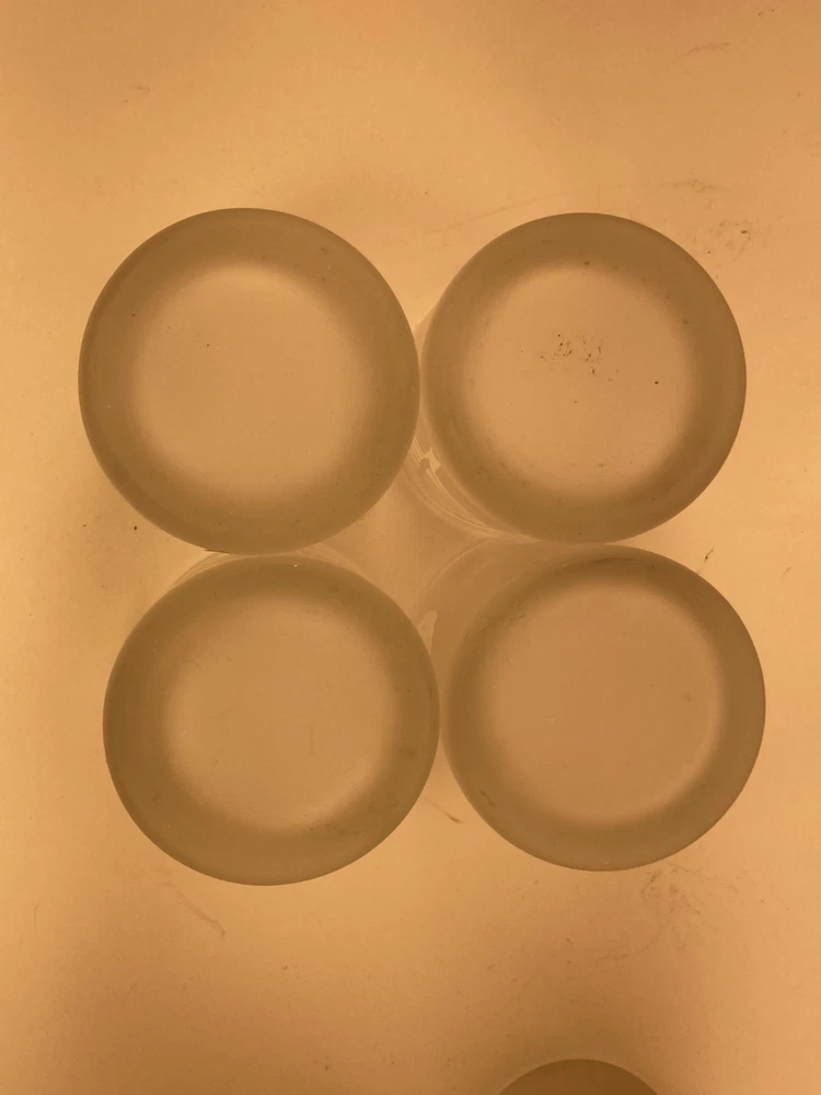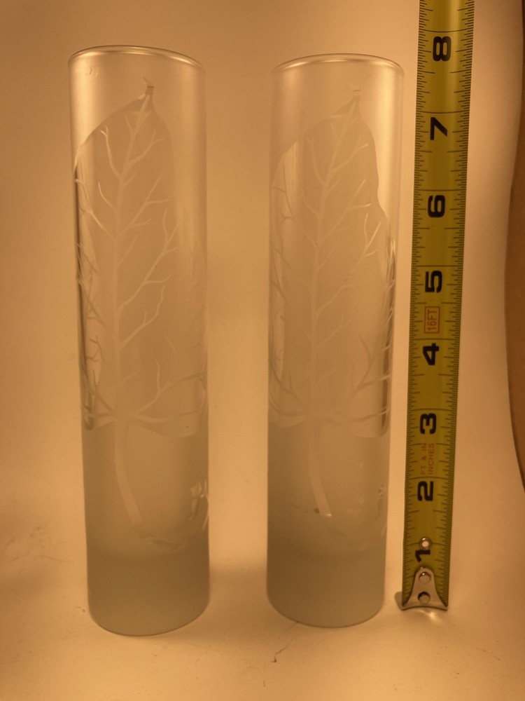 The set of frosted etched glass votive candle holders features an etched birch leaf design. The set includes two tall and four short candle holders. Made of glass, these candle holders have a frosted finish. There is some wear on the bottoms of the votives and one small flaw in the frosted part of one of the tall votives (see pictures). This set is beautiful with lit votive candles on a mantle or for a candle-lit dinner!