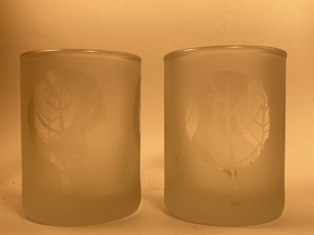 Frosted Etched Glass Votive Set with Birch Leaf Design - 2 Tall & 2 Short Candles