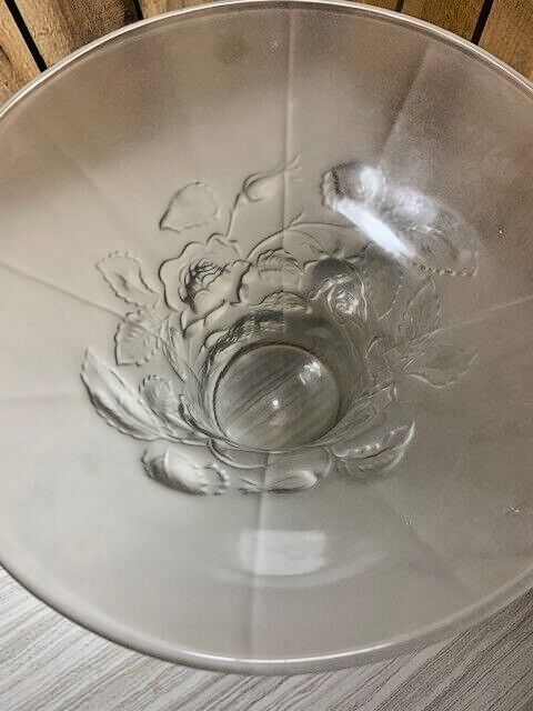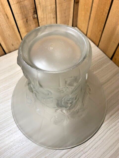 Frosted glass rose bowl or vase with a flared top and raised roses on the outside. Approximately 7" tall, 9 1/4" diameter at the top, 4" diameter at the base and weighs 4 lbs 2 oz. There are a few light scratches from use and white spots that might be from the manufacturing process as seen in the photos. No visible cracks or chips. Please see all photos as they are part of the description. We try to list as many details as possible, however some items are vintage and pre-owned so flaws are to be expected. We try to find out as much information as possible on each item we have available. On occasion we may make a mistake and appreciate your feedback.