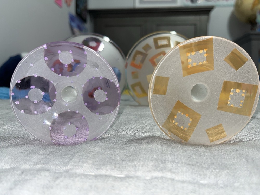 - 2 frosted glass martini glasses - One orange design - One purple design - In perfect condition, never used - From super-clean, nonsmoking, pet-free home